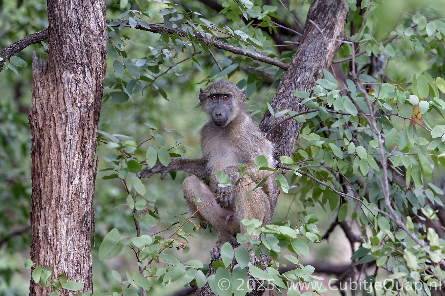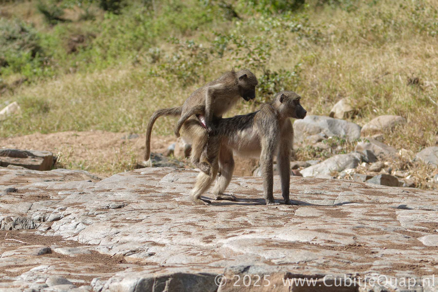 A highly gregarious and social species that lives in troops of 15 to sometimes 100 or more. Within a baboon troop all adult males are dominant over all females. The adult males have a strict rank order and only the dominant males mate with the oestrous or receptive females, although subordinate males do mate with young females and those that are not in oestrous. It is only in their fifth year that the males become dominant over the females. The dominant male determines when the troop will move. The females and infants remain closest to this male, with the non-breeding females staying close to the subordinate males. The youngsters and subadults move around the edges of the troop. Water sources are visited each day. Very vocal and the bark or 'bogom' of the adult male is a common day-time sound of the hills and savanna of southern Africa.