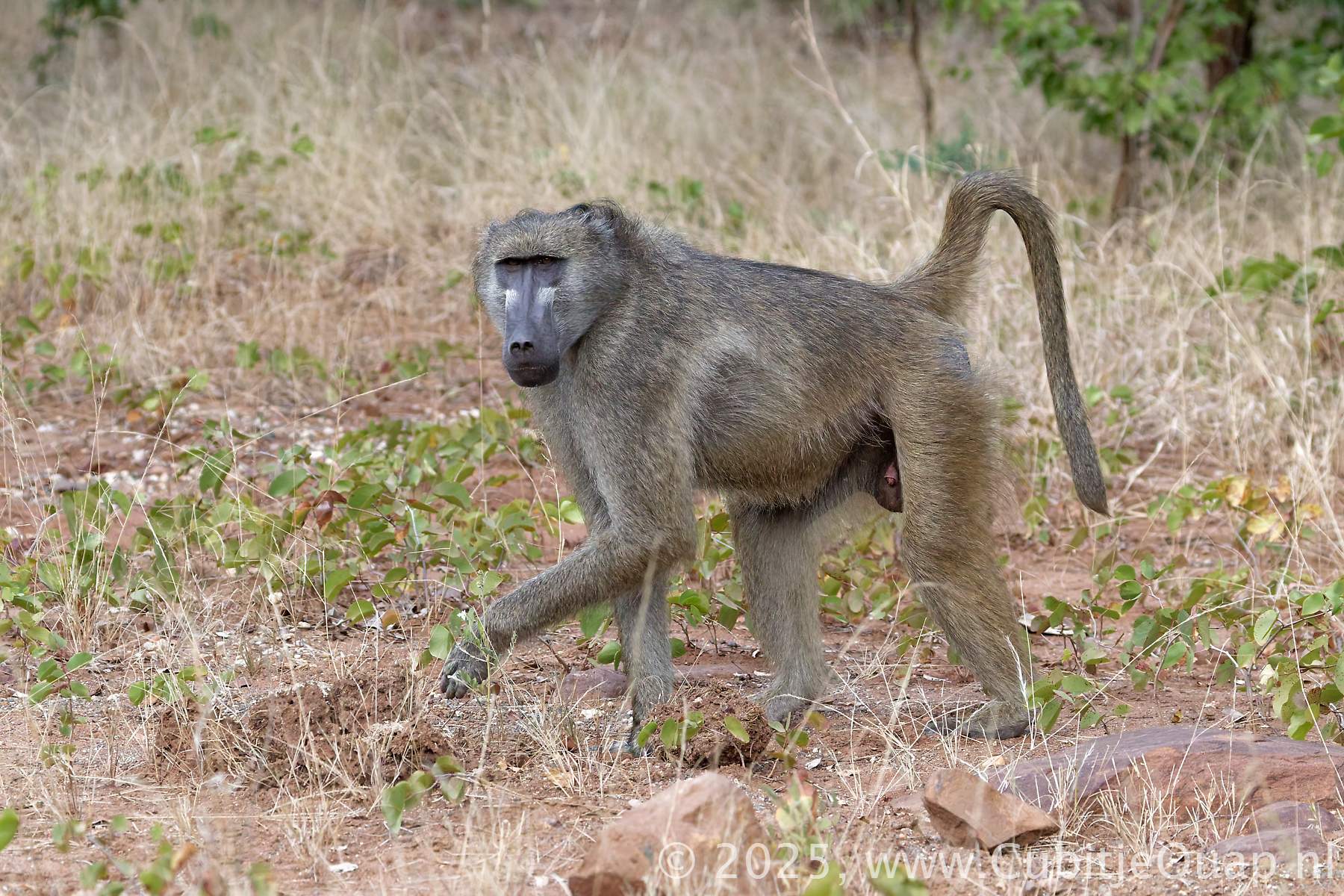 The largest primate (other than man) in southern Africa. It is relatively slender and lightly built, although adult males have powerfully built shoulders and heads. When the baboon is on all fours the shoulders stand higher than the rump. The long, somewhat dog-like muzzle is particularly pronounced in the males. The body has a covering of course hair, which may be light greyish-yellow through to dark grey-brown, but coat colour is variable, even within a troop. Only the male has a mane of long blackish hair on the neck and shoulders. The hair on the upper surface of the hands and feet is dark brown to black in colour. Characteristic is the posture of the long tail; the first third of the tail is held upwards and the remainder droops downwards, giving it a broken appearance. Males have a single, hard pad of naked grey skin tha extends across both buttocks, but the female has one smaller pad on each buttock. During gestation the skin around the female buttock pads is bright scarlet while at the onset of the menstrual cycle the skin distends enormously into rather unsightly swollen red protuberances.