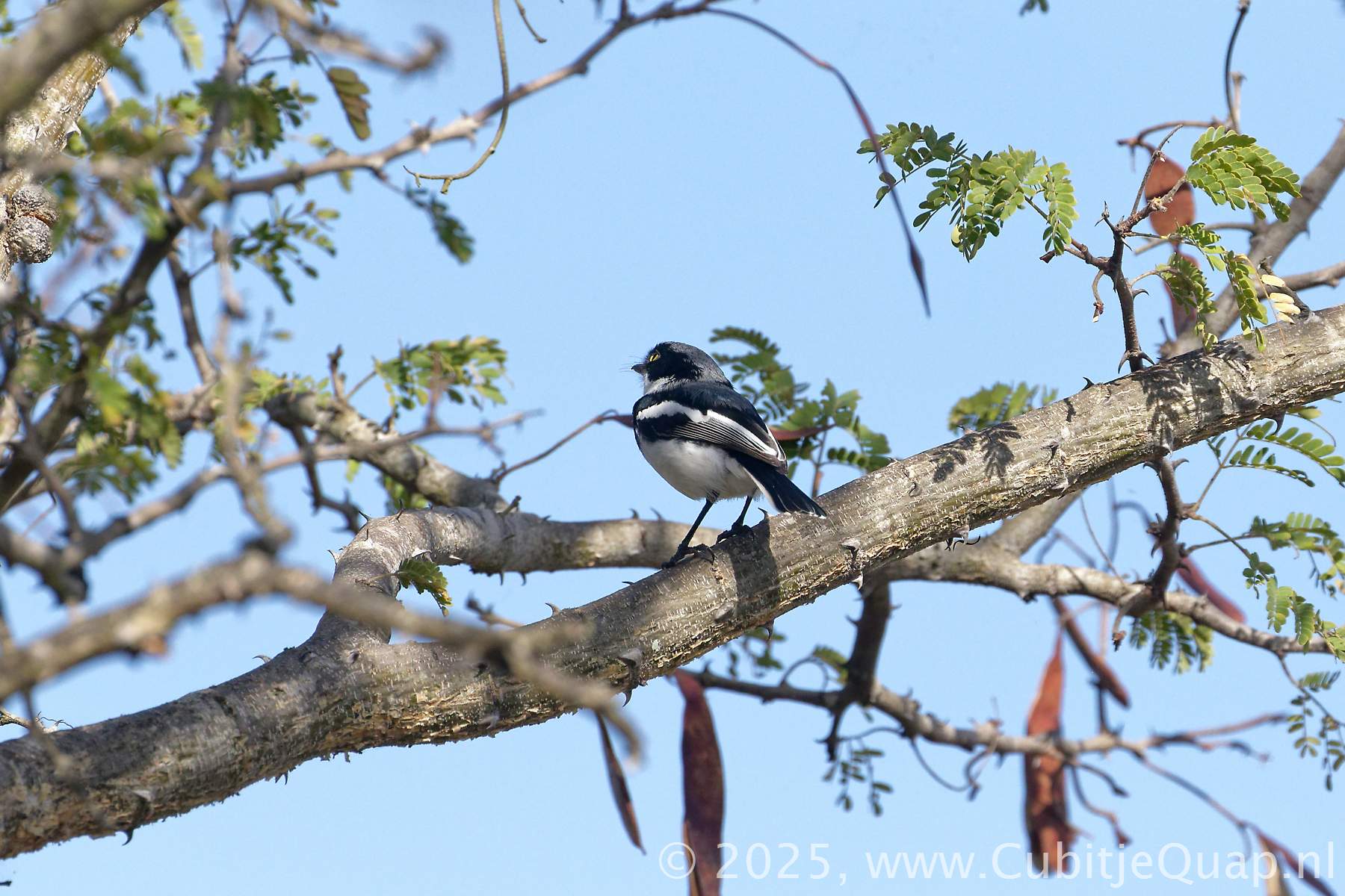Male is very similar to male pririt and pale batises; the latter has a narrower breastband and the former has indistinct, black markings on the flanks, lacking in chinspot batis. The species can be distinguished by their calls.
