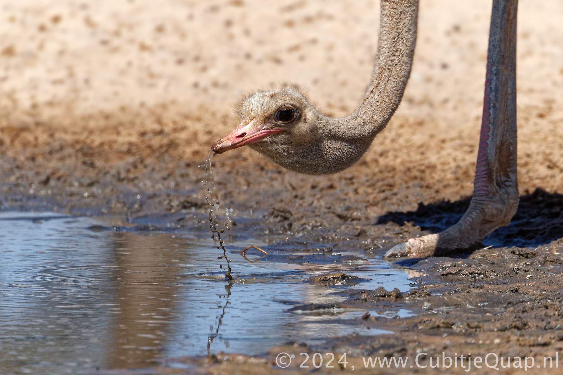 By far the largest bird of the region; flightless. Male is black with a grey neck, predominantly white wings and a pale chestnut tail. In female, the body feathering and tail are brown and the wings off-white.