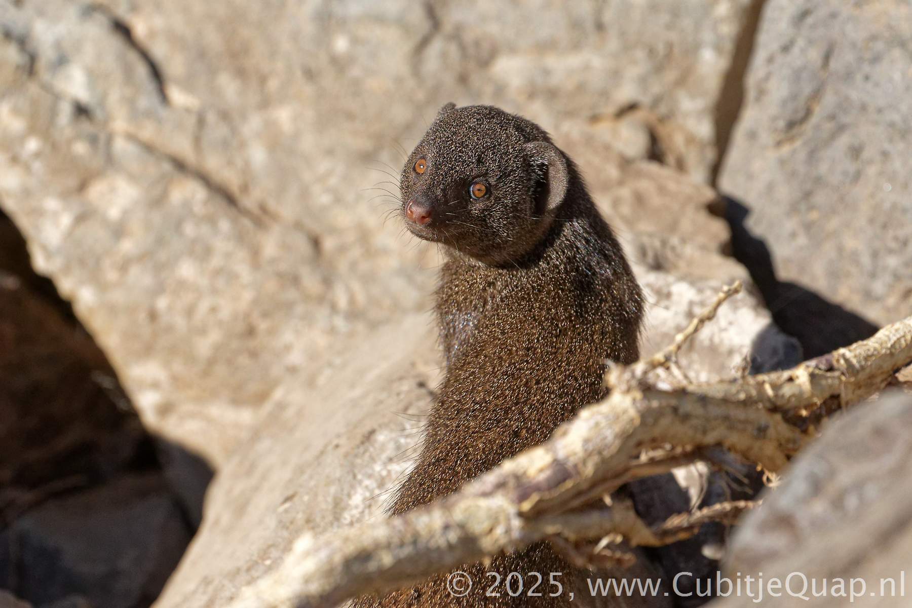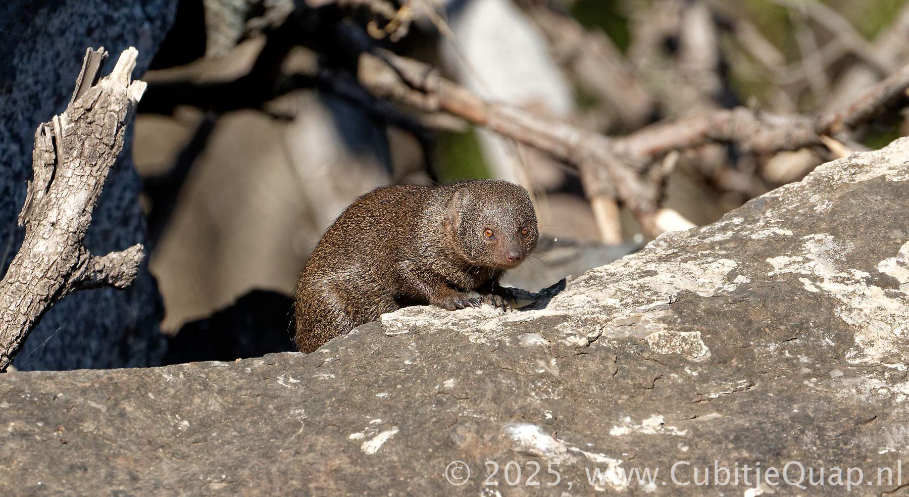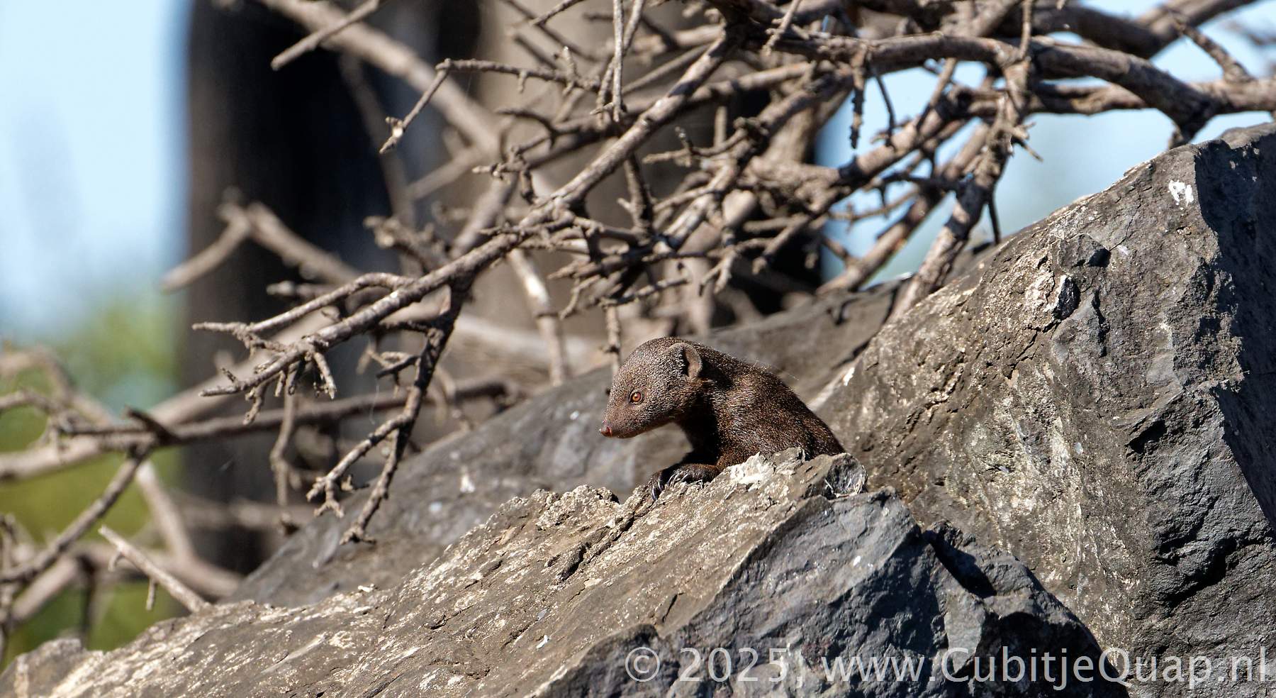 The dwarf mongoose is the smallest carnivore occuring in southern Africa. Its body is a uniform dark brown and from a distance it appears to be almost black. The fur is glossy and has a slightly grizzled appearance at close quarters.