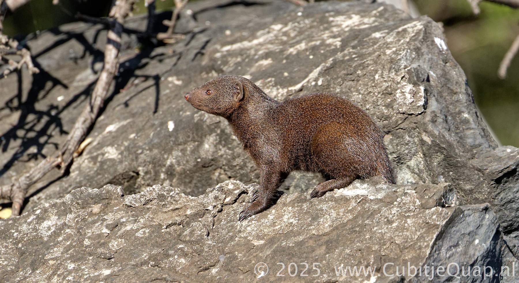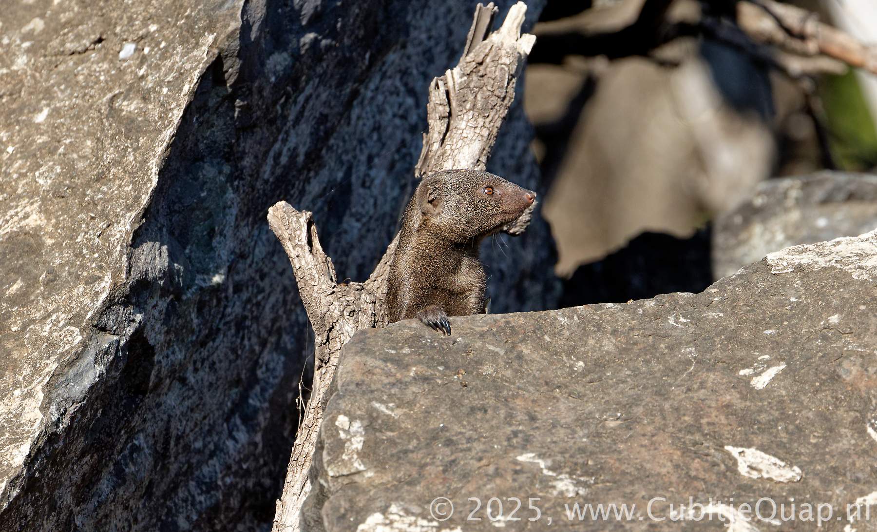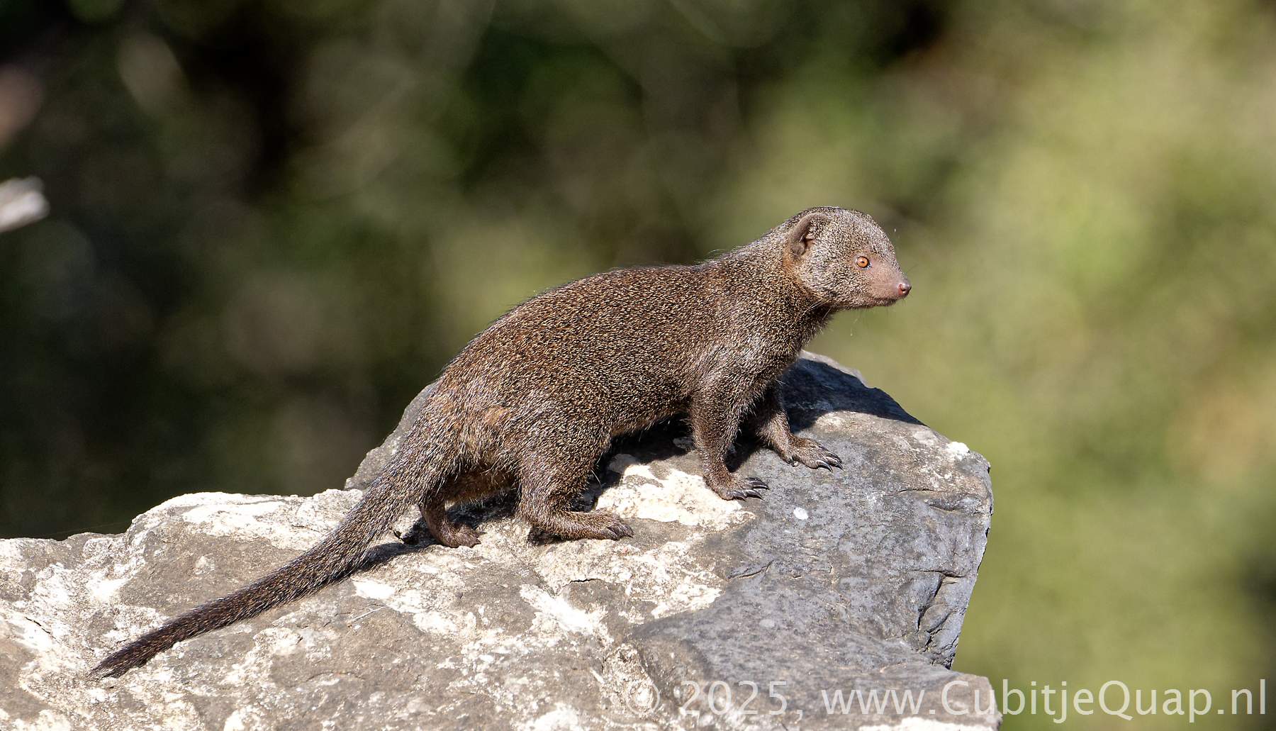 The dwarf mongoose is the smallest carnivore occuring in southern Africa. Its body is a uniform dark brown and from a distance it appears to be almost black. The fur is glossy and has a slightly grizzled appearance at close quarters.