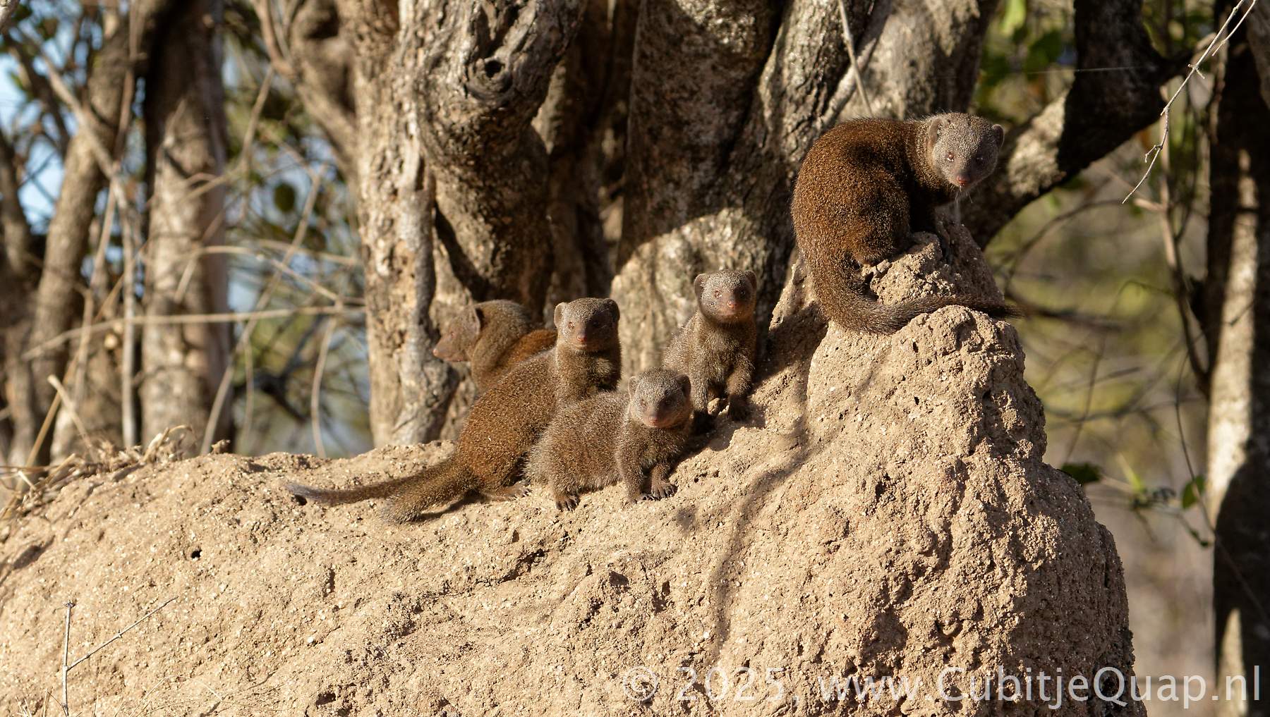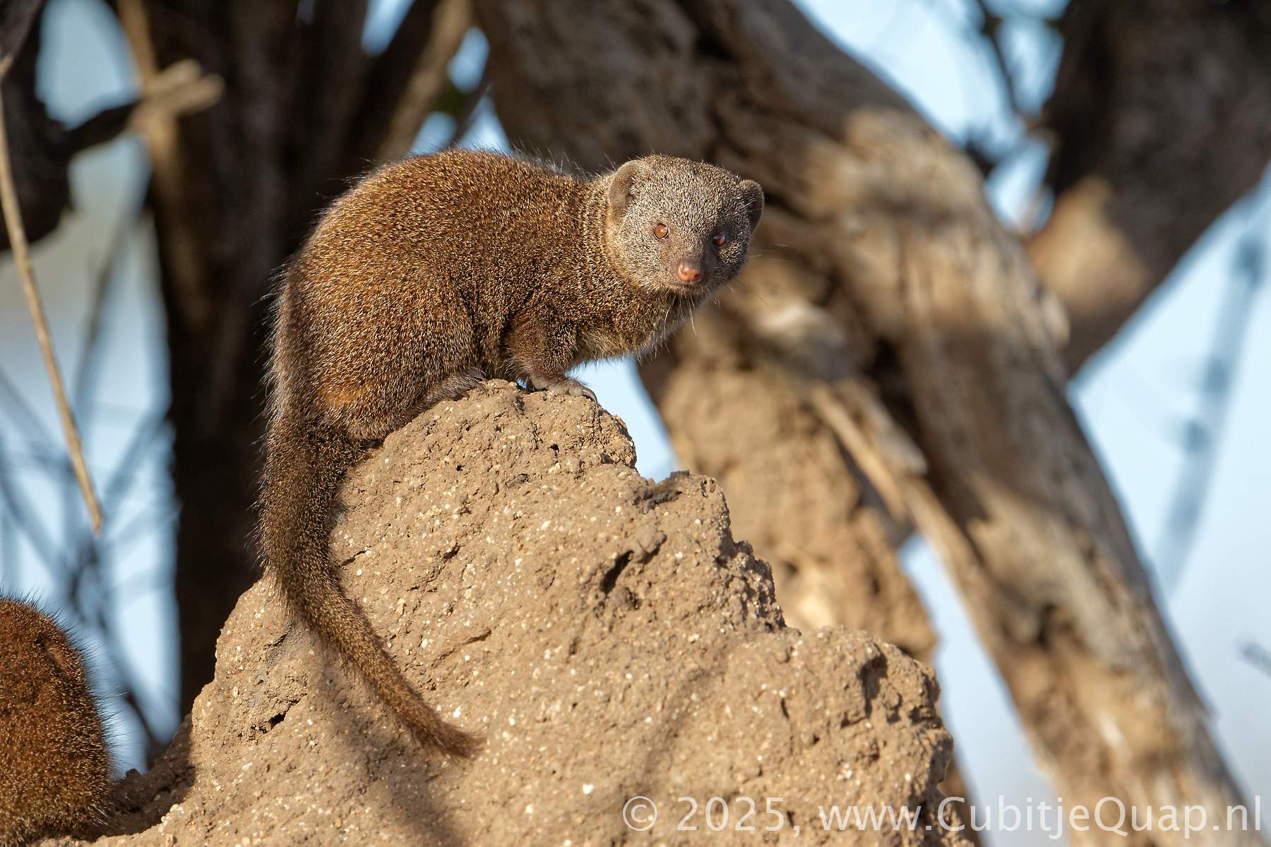 A stricktly diurnal mongoose usually living in troops of up to 10 individuals, although as many as 30 have been recorded. They have a fixed home, frequently in termitaria, but will use burrows dug by other species or excavated by themselves. Dwarf mongoose troops have a rigid social system with a dominant male and female, the rest of the members falling into a 'pecking order'. Usually only the dominant female breeds, and apart from suckling the young she leaves their care to the other troop members. When disturbed, dwarf mongooses will dive for cover but they are inquisitive and will soon re-emerge, standing on their hindlegs to look around.
