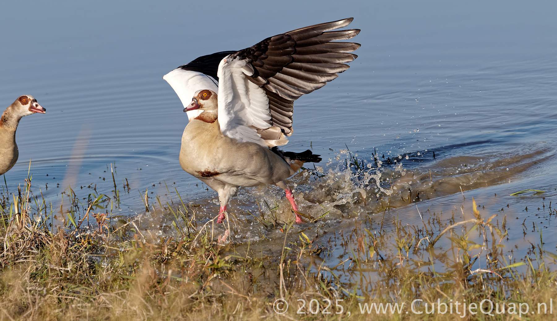 This large brown bird has a dark brown mask around the eye, and a brown patch on the breast that is distinctive in flight. Compared with South African Shelduck it has a longer neck and legs, and a thin, dark line running through the white forewing is visible in flight.