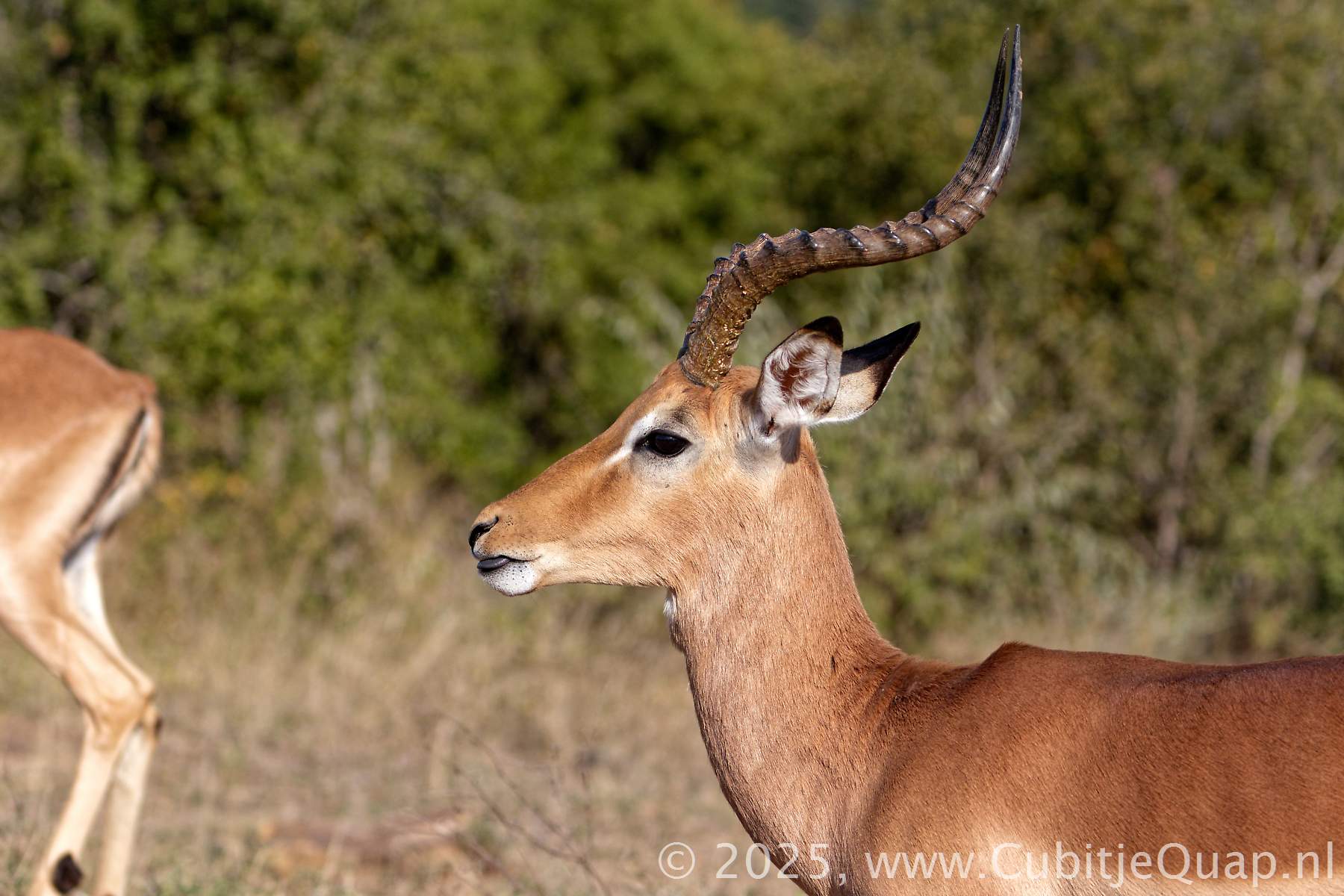 Medium sized, lightly built antilope. Upper parts reddish-fawn becoming paler on sides; chest, belly, throat and chin are white. Tail is white with central black line on upper surface, and each buttock has vertical black blaze. Tuft of black hair on lower rear edge of hindleg is characteristic unique to the impala. Ears are black tipped. Only rams carry the long graceful lyrate horns. The black blaze down the front ot the face is distinctive for the black-faced impala.
