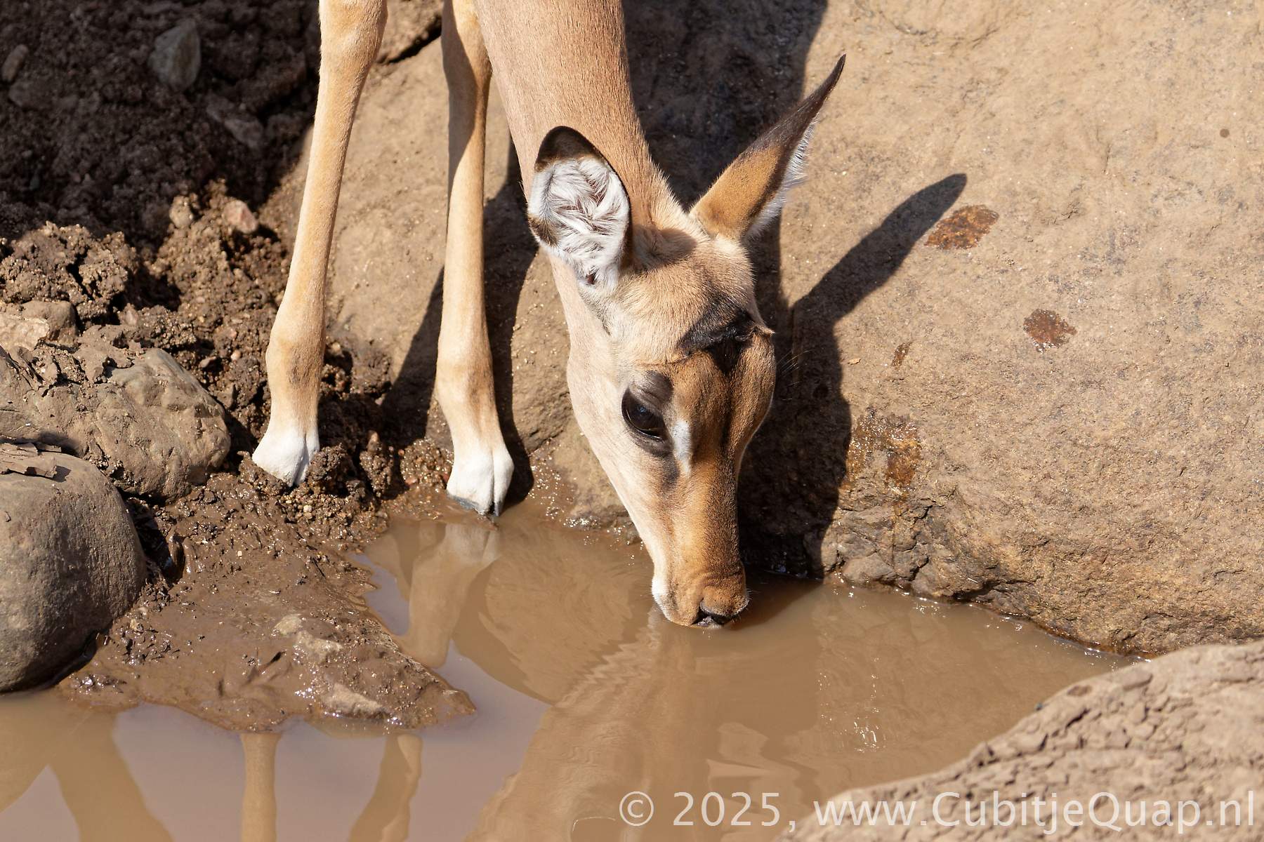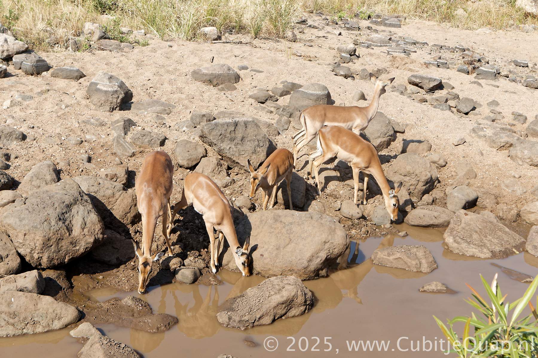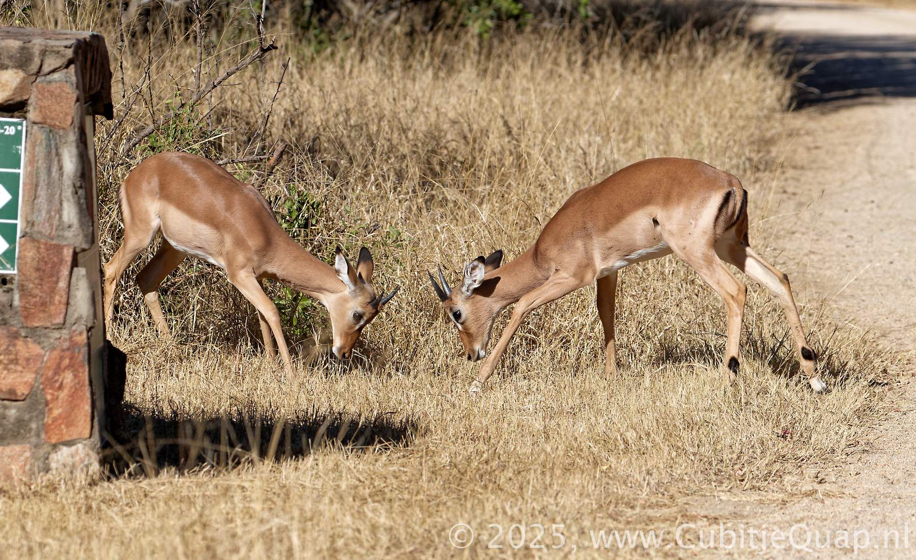 Rams are extremely vocal during the mating season and give vent to growls, roars and snorts. They are only territorial during the rut from January to May, spending the rest of the time in bachelor herds. The home range of a breeding herd, consisting of ewes and young animals, may overlap with the territories of several territorial rams. The rams separate harem herds of 15 - 20 ewes (with their young) for mating. This disrupts the composition of the herds but they reunite at the conclusion of the rut. Bachlor herds tend to occupy areas away from the breeding herds. Impala are active mainly during the cooler daylight hours but there is some nocturnal activity.