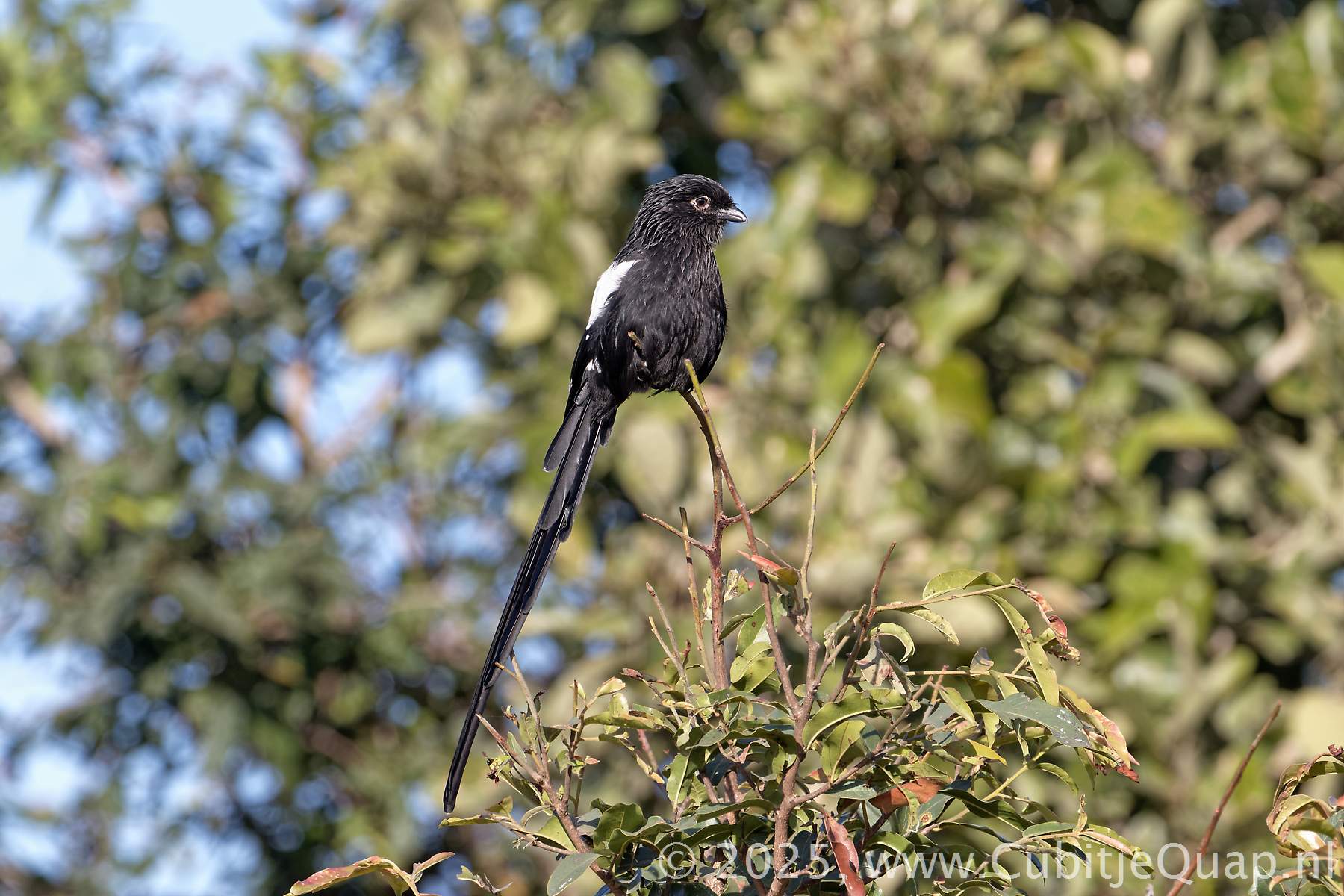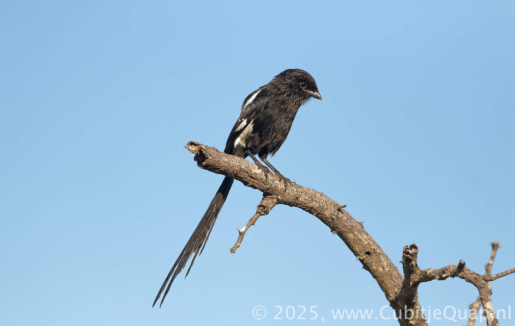 The combination of the black-and-white plumage and very long, wispy tail is diagnostic. Gregarious, it typically occurs in groups of four to eight birds.