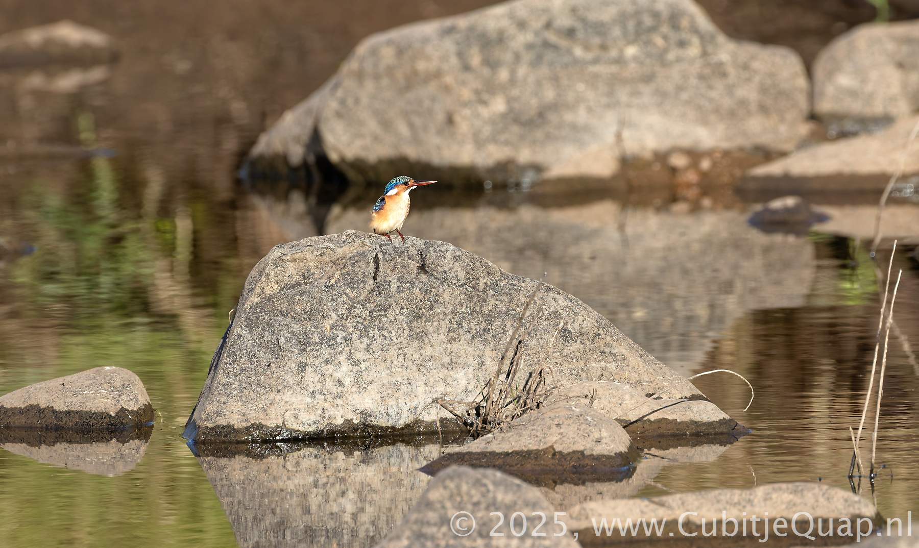 Juvenile has a black bill, which might lead to confusion with Half-collared Kingfisher, but Malachite Kingfisher is smaller, and has a dark back, chestnut, not blue, cheeks and reddish brown underparts.