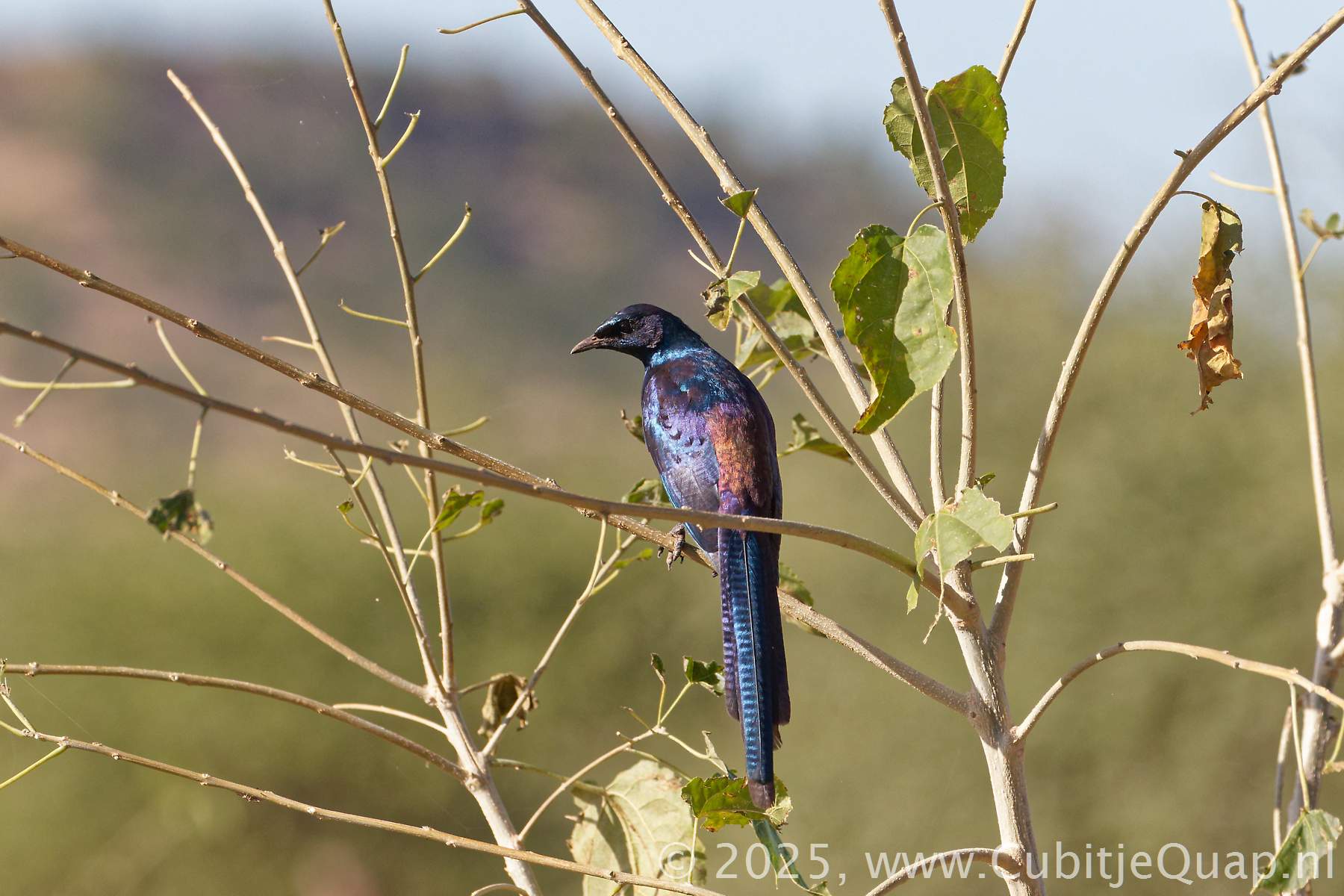 The long, pointed tail is diagnostic. Although similar, this species is a smaller bodied, more compact bird than Burchell's Starling. These are the only two glossy starlings with dark eyes (in adult). Usually in groups.