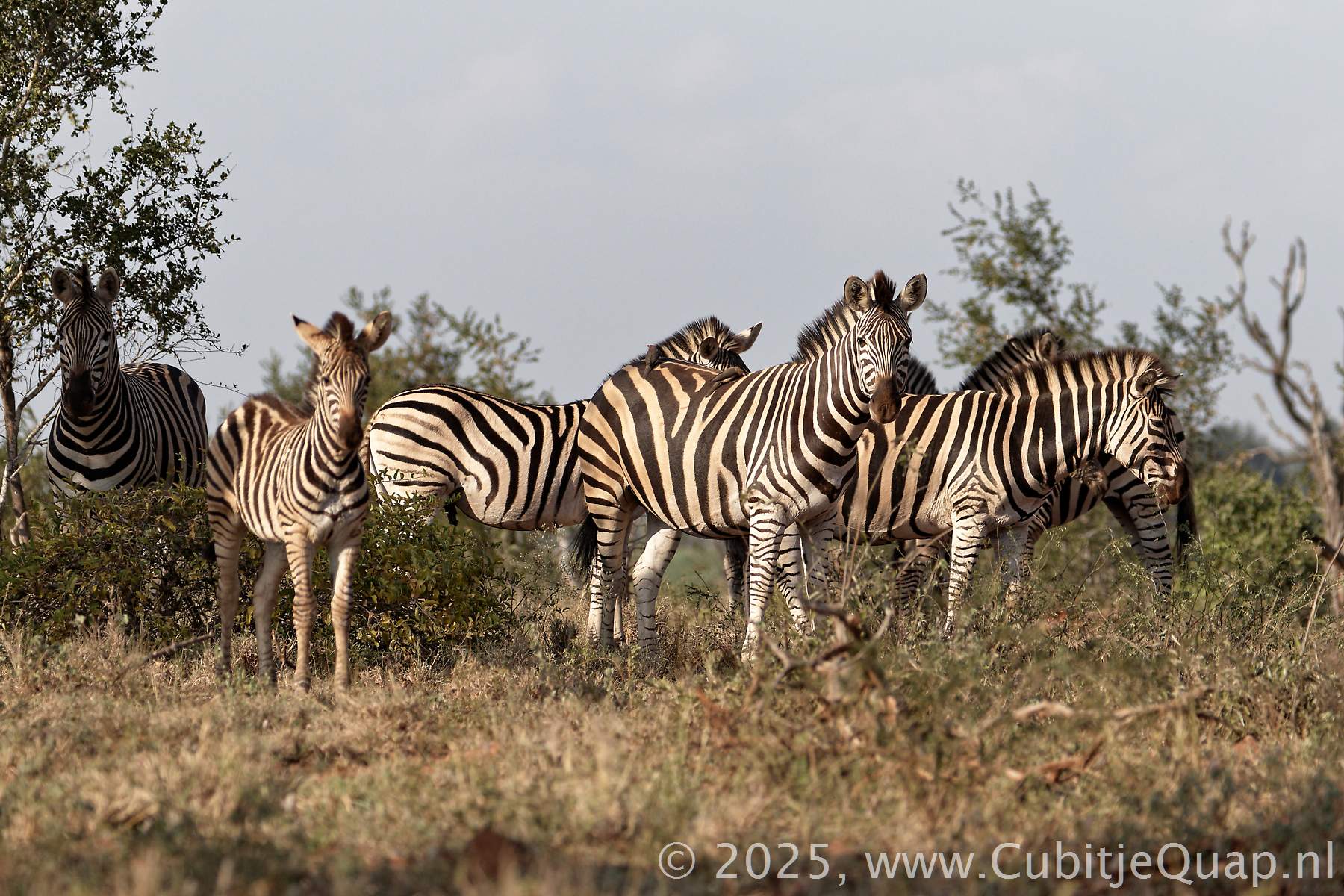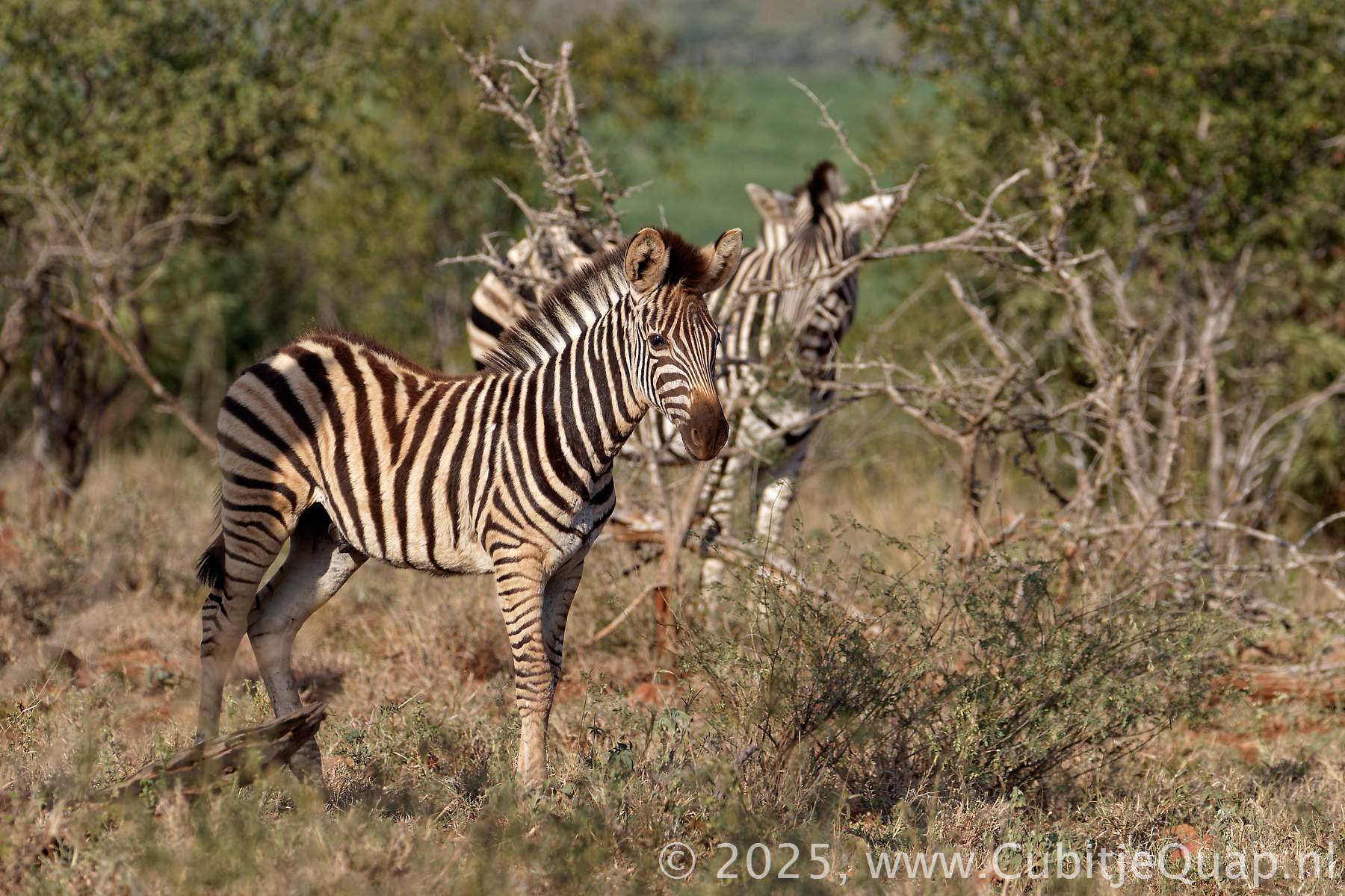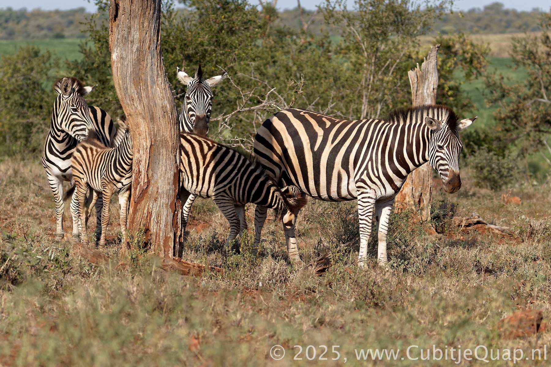 Plains zebras associate in family herds consisting of an adult stallion, mares and their foals. Other stallions form bachlor herds or run alone. Family herds usually consist of 4 - 6 members. Much larger herds are formed when numerous smaller herds come together temporarily. They all have a characteristic call that has been likened to a bark 'kwa-ha-ha' - which was also the call of the extinct Quagga, hence the name.
