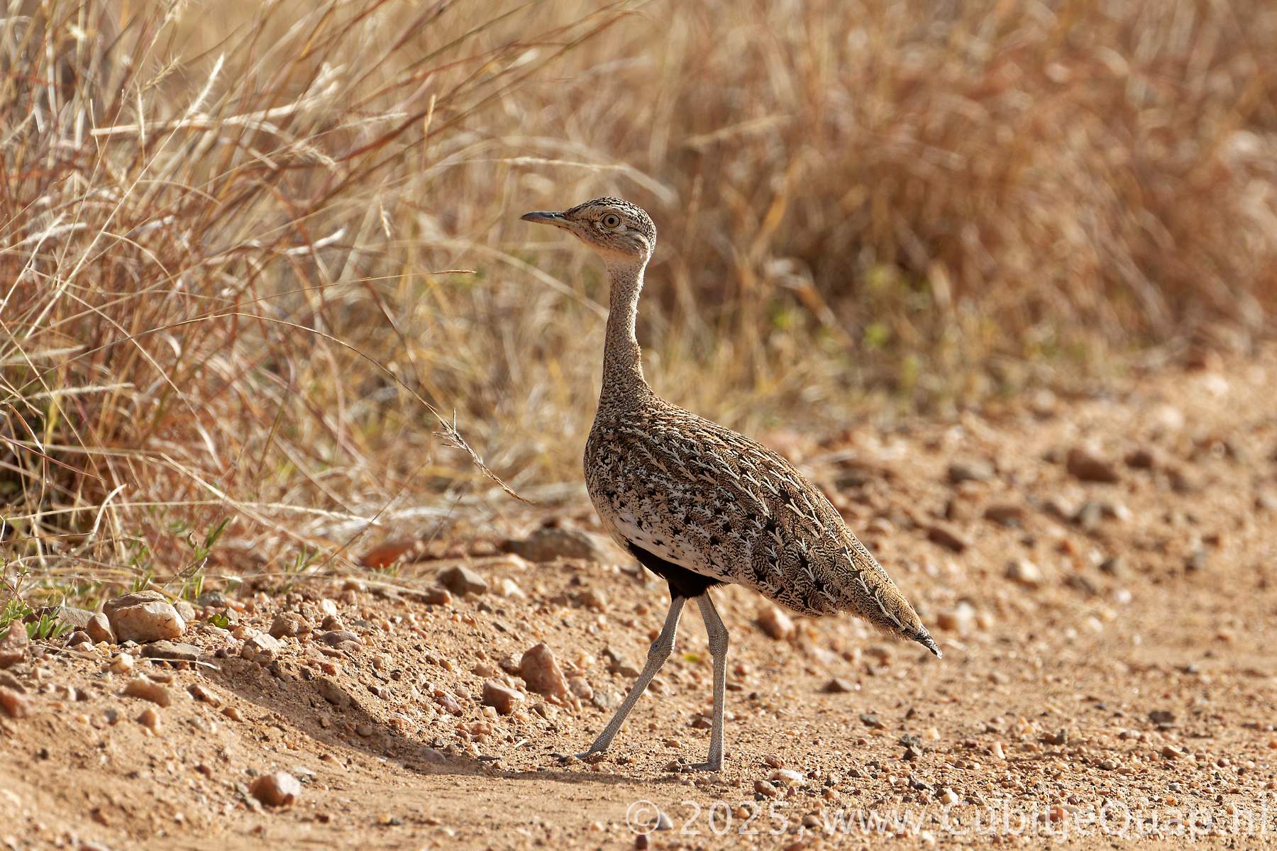 Male, in courtship display, flies straight up, then suddenly tumbles and plummets towards the ground before gliding off and settling. Female has a mottled brown crown and neck. It is readily distinguished from female Northern Black Korhaan by the chevron-shaped markings (not barring) on the back. Juvenile resembles female.
