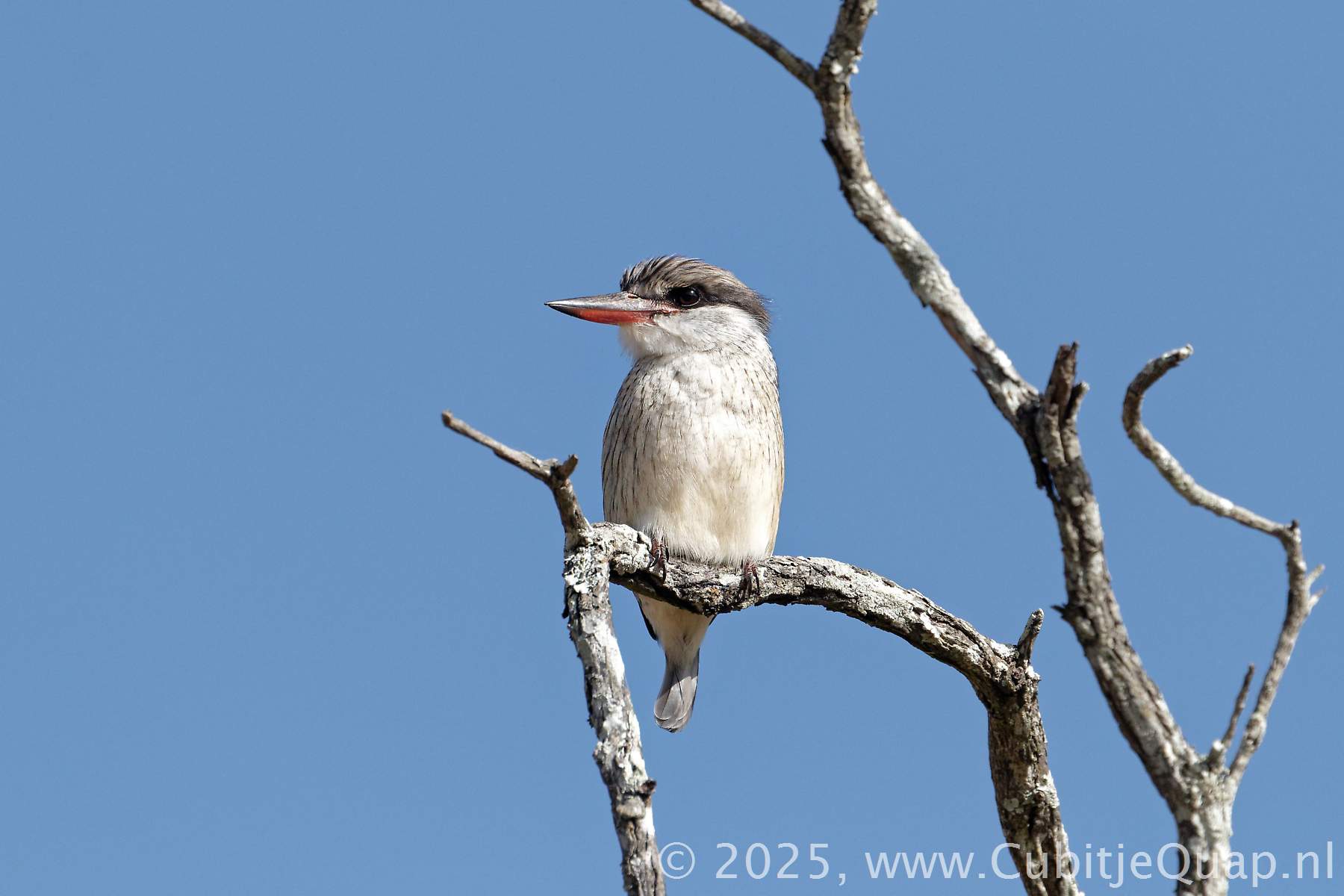 The dark cap lightly streaked with grey, the black-and-red bill and the white collar are diagnostic. It may be distinguished from brown-hooded kingfisher, which often occurs in the same habitat, by its smaller size, darker cap and white collar. The blue rump id evident only in flight. In flight it shows extensive white on the underwing and a white flash in the upperwing (brown-hooded kingfisher has no white in the wings.