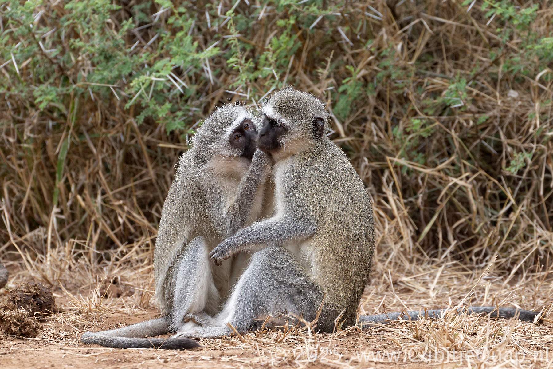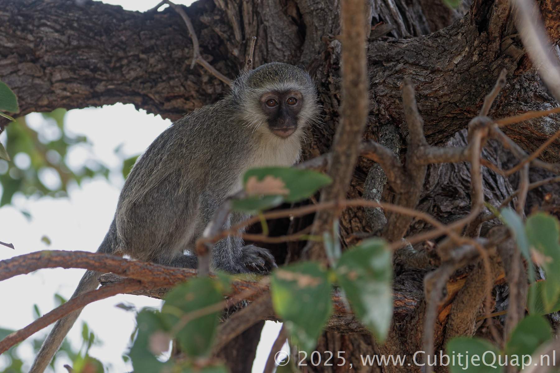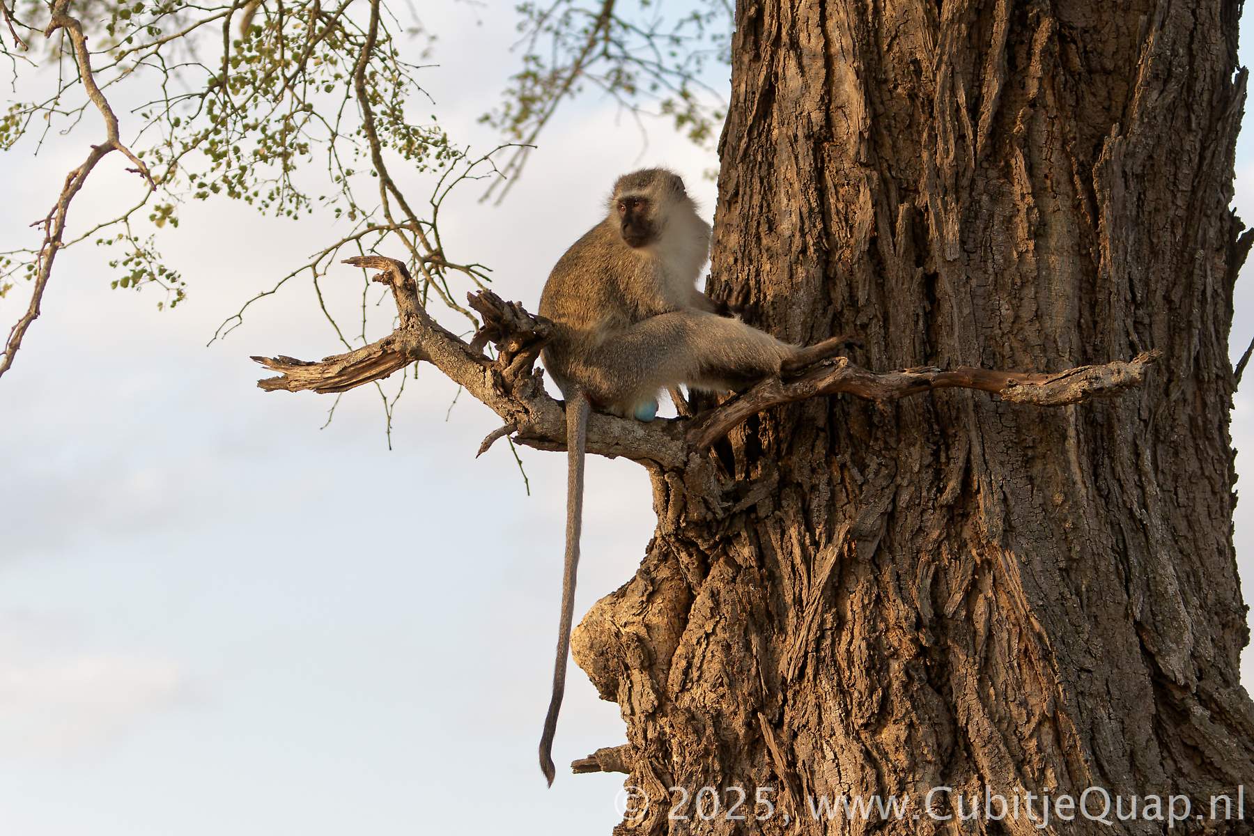 Vervet monkeys live in troops of up to twenty individuals and more. The formation of large groups will generally be associated with an abundant food source or water. They are completely diurnal and sleep in trees at night or more rarely on cliffs. A distinct pecking order is established in the troop. They forage in a well-defined homerange, spending much of their time on the ground. They frequently raid crops and gardens and are in consequence heavily persecuted.