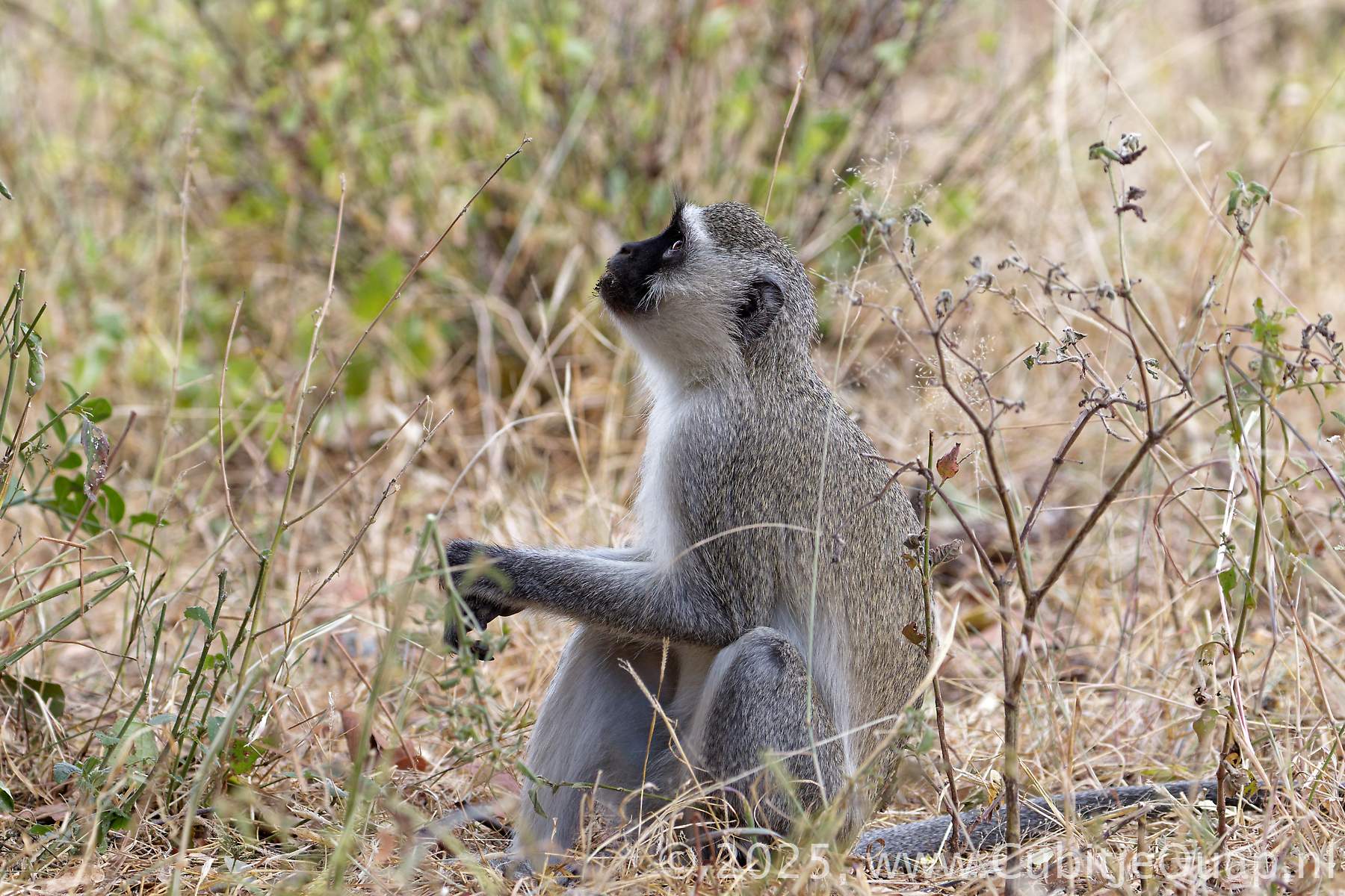 This is a well-known animal with its grizzled grey, fairly long , coarse hair and typical monkey appearance. Its underparts are paler than its upperparts and are frequently white. The face is short-haired and black. with a rim of white hair across the forehead and down the sides of the cheeks. The hands and feet are black. However there are several subspecies occuring in southern Africa with some variation in colour. The animals from northern Namibia usually have very pale feet and hands while the subspecies in the Tete district of Mozambique has a reddish back. The general hair colour varies from area to area but this monkey is unlikely to be confused with any other species. The adult male has a distinctive bright blue scrotum.