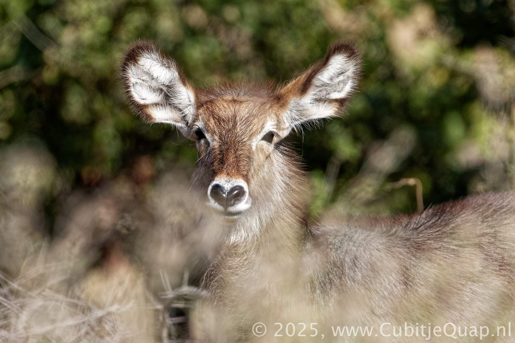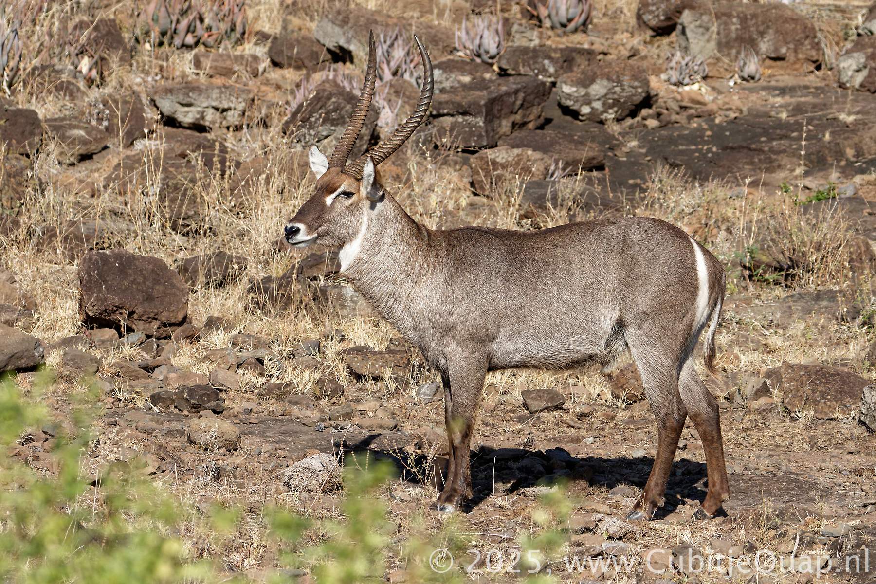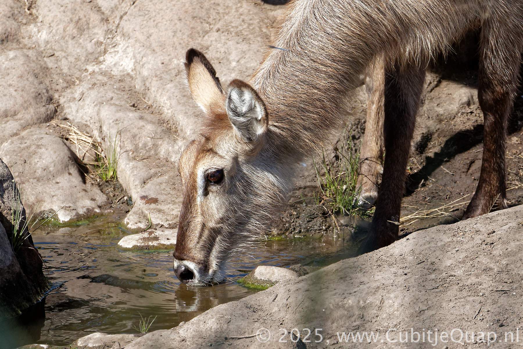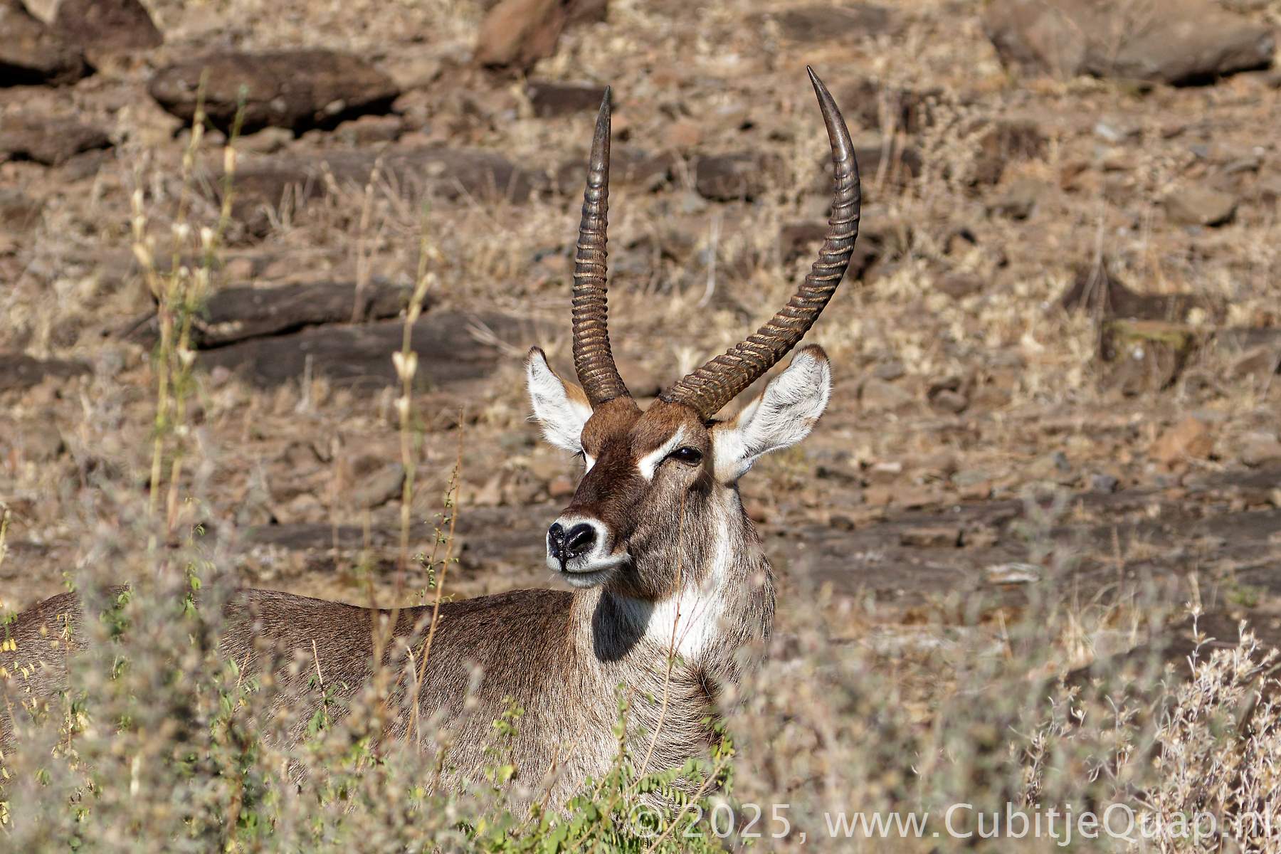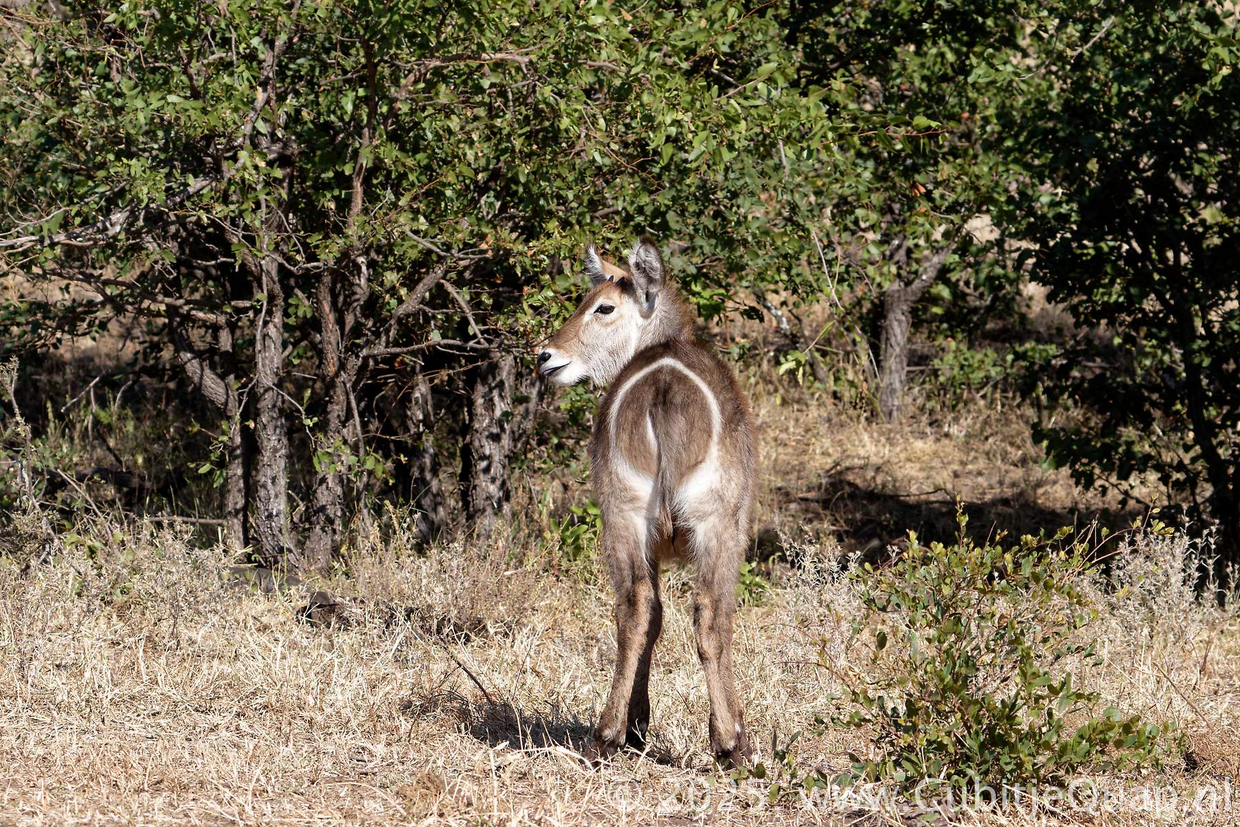 Waterbuck are large, robust antilopes with coarse and long coats. The body colour is grey-brown with either grey or brown being dominant, scattered through with grey or white hairs. A broad white ring encircles the rump and a white band is present from throat to the base of the ears. The flanks are lighter in colour than the back and the hair around the mouth, nose and above the eyes is white. The ears are short, rounded, white on the inside with a black tip. The tail is quite long with a black tuft of hair at the tip. Only the bull has the long, heavily ringed horns that curve backwards and then forwards towards the tips.