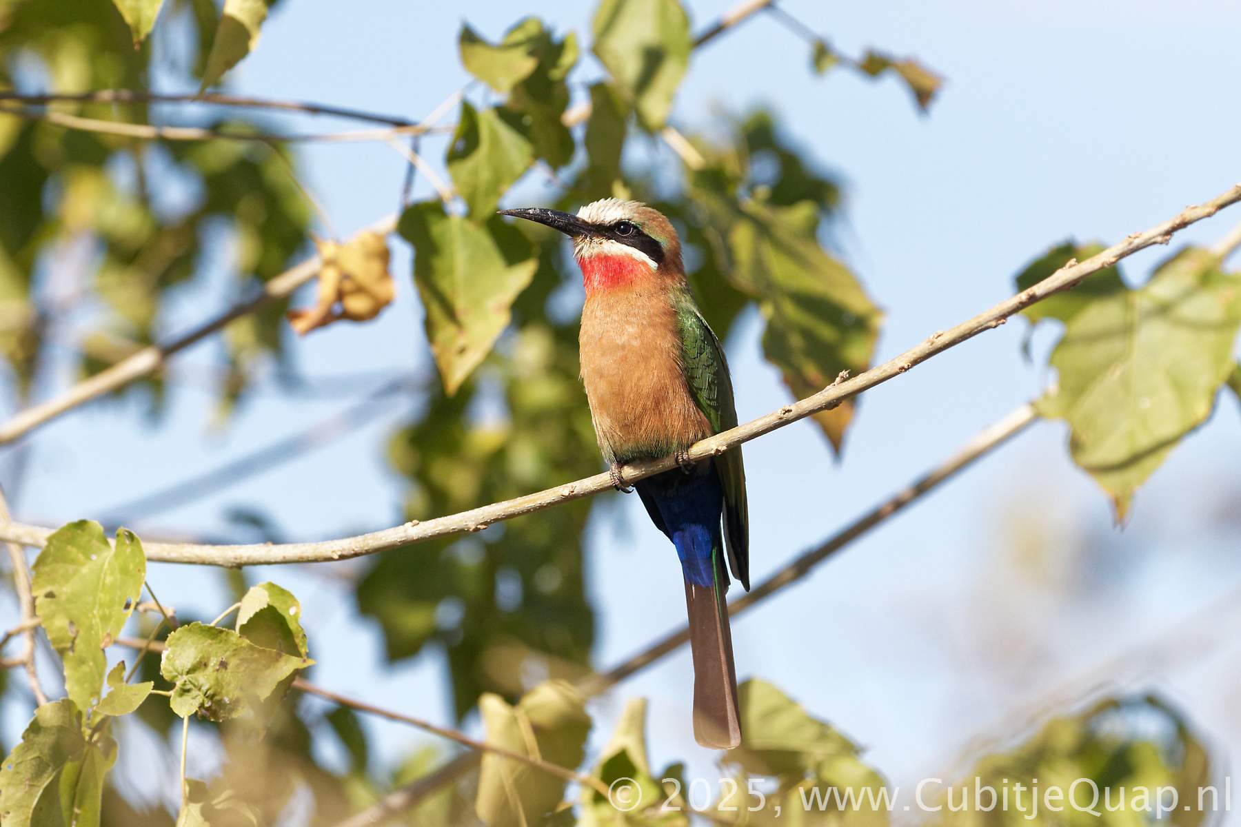 The crimson-and-white throat, white forehead and lack of pointed tail projections are diagnostic.