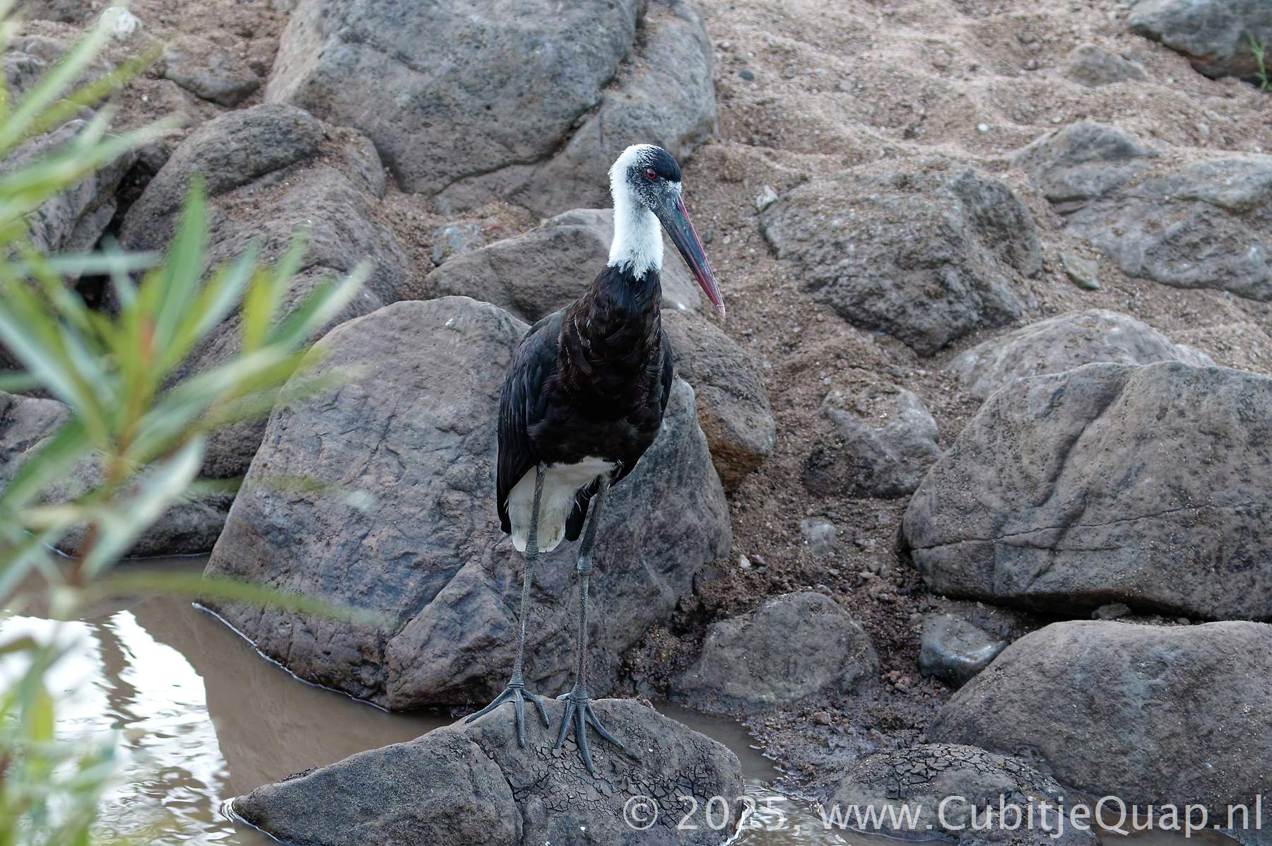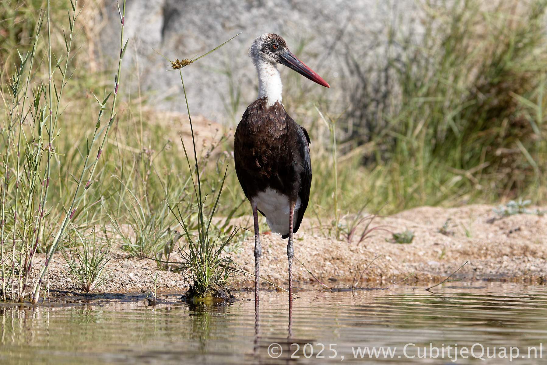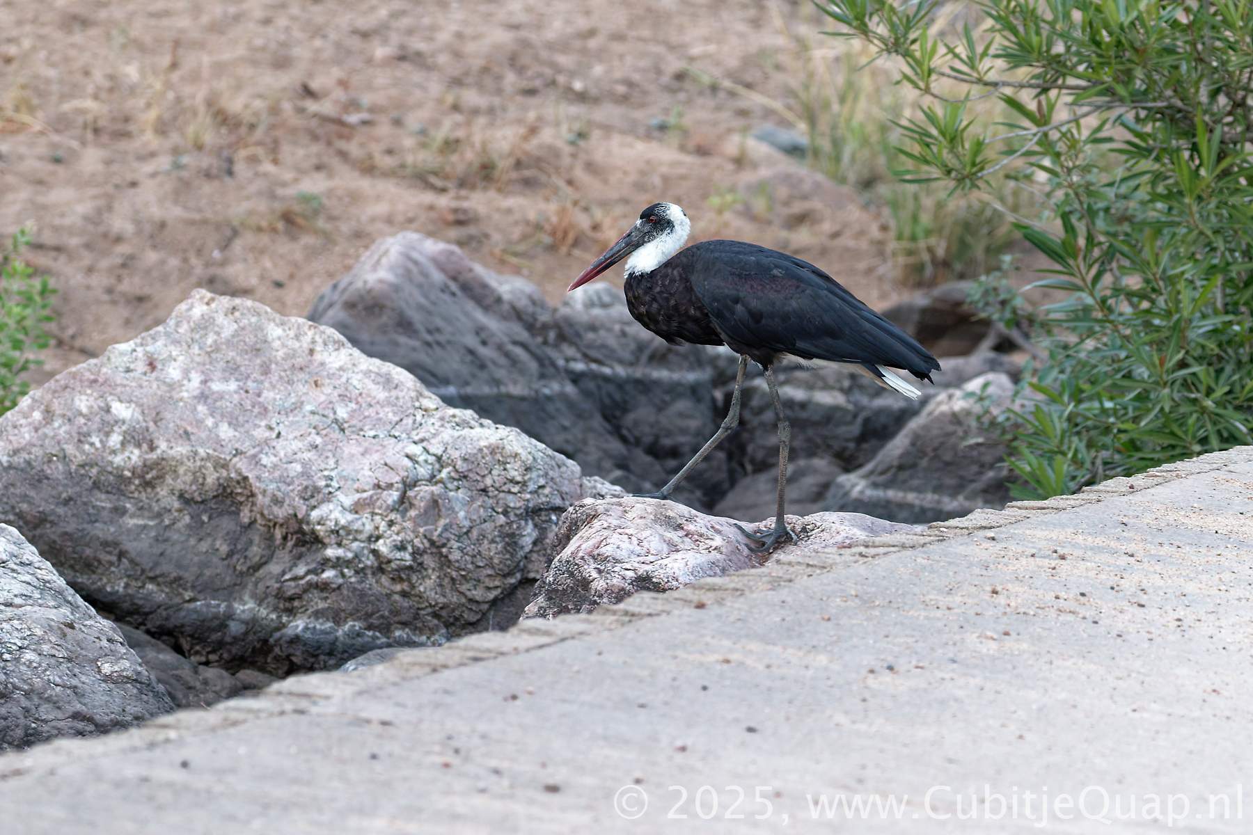 The combination of the glossy black plumage, white woolly neck, and white belly and undertail are distinctive.