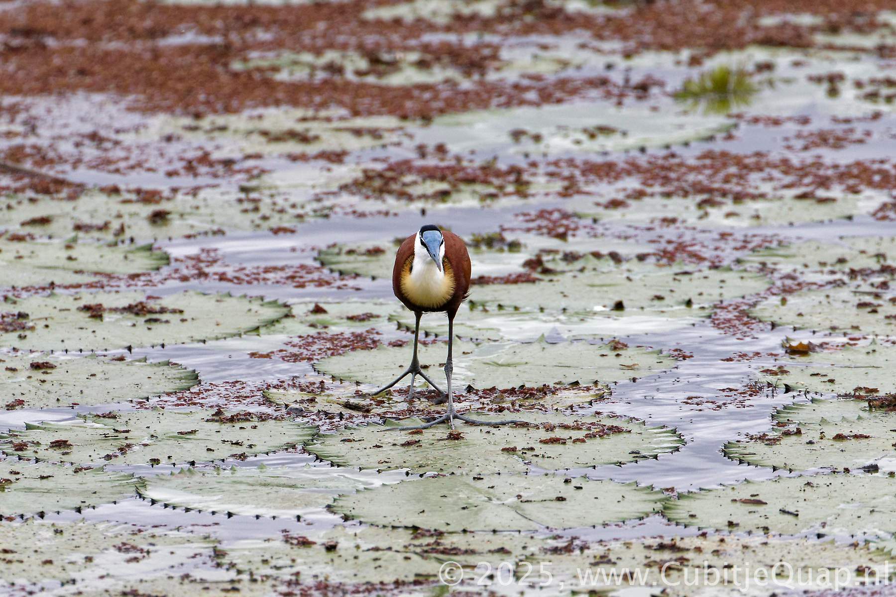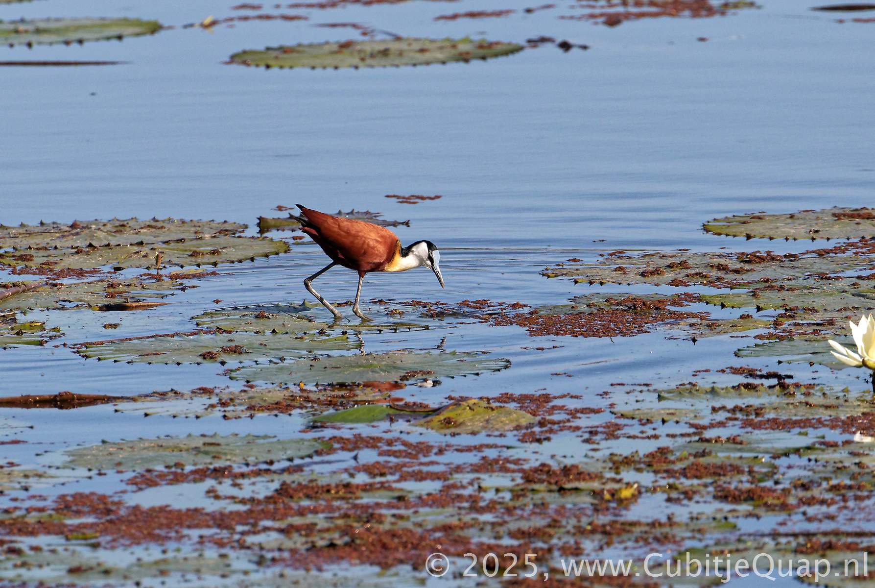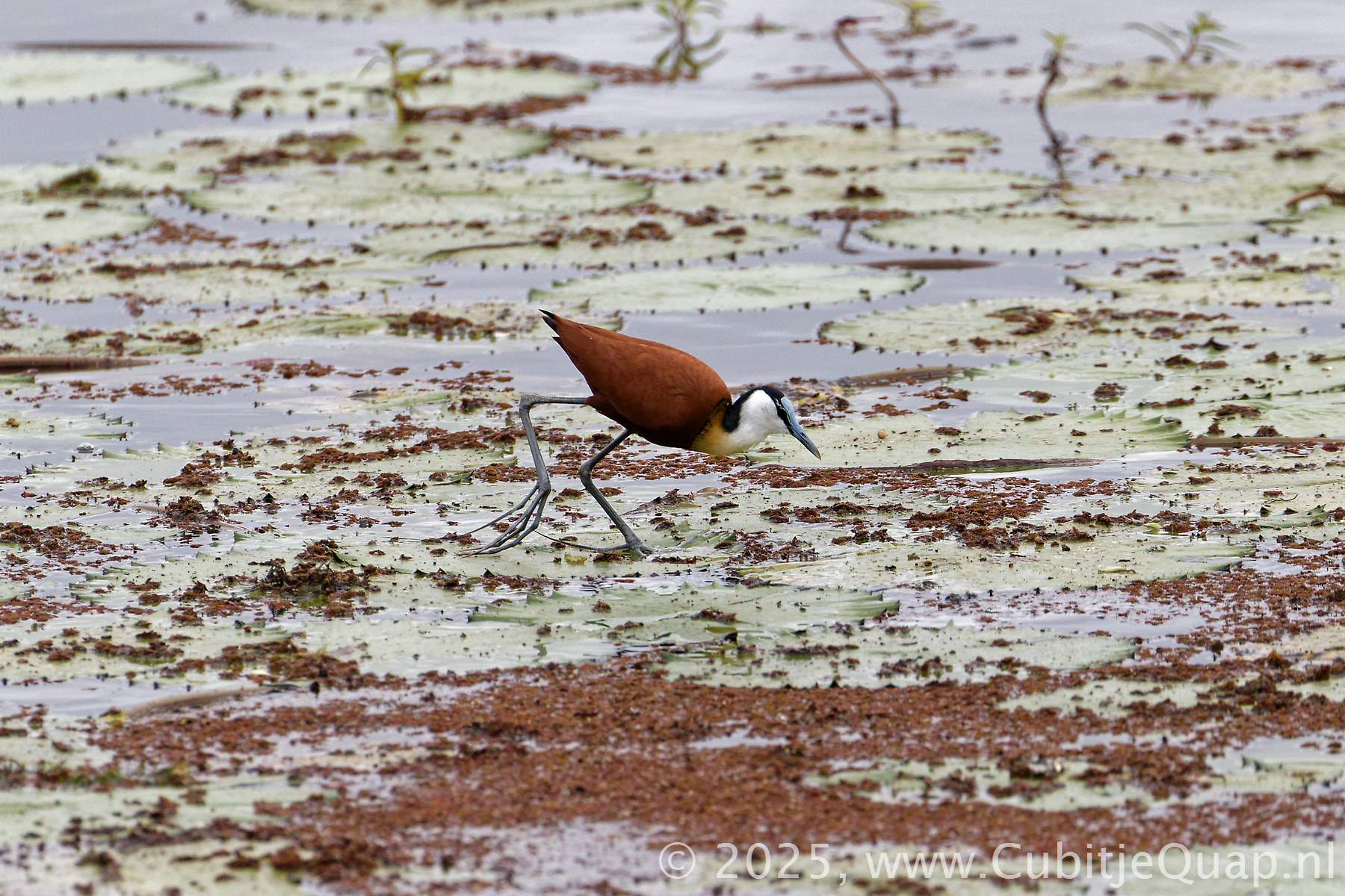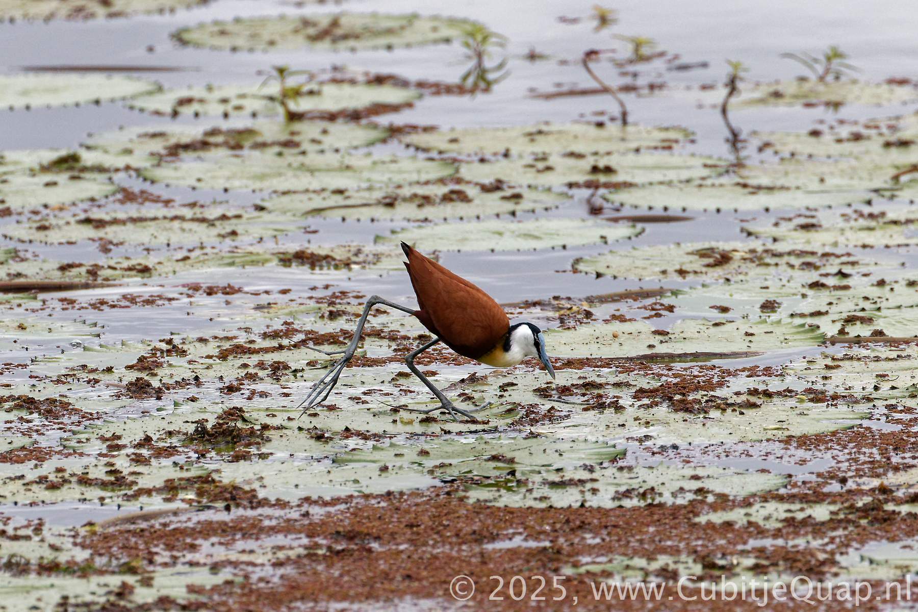 Jacana's have long toes that enables them to walk on the leaves of waterlilies and other water vegetatation. Therefore they are somtimes referred to as Jesus birds or lily trotters.