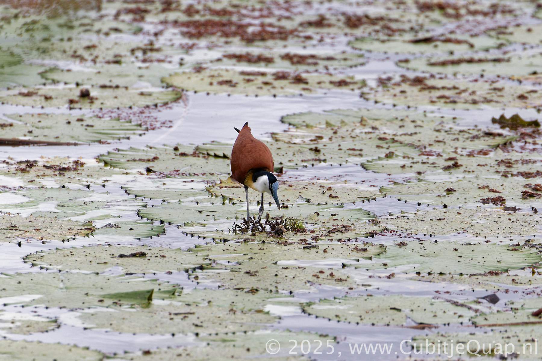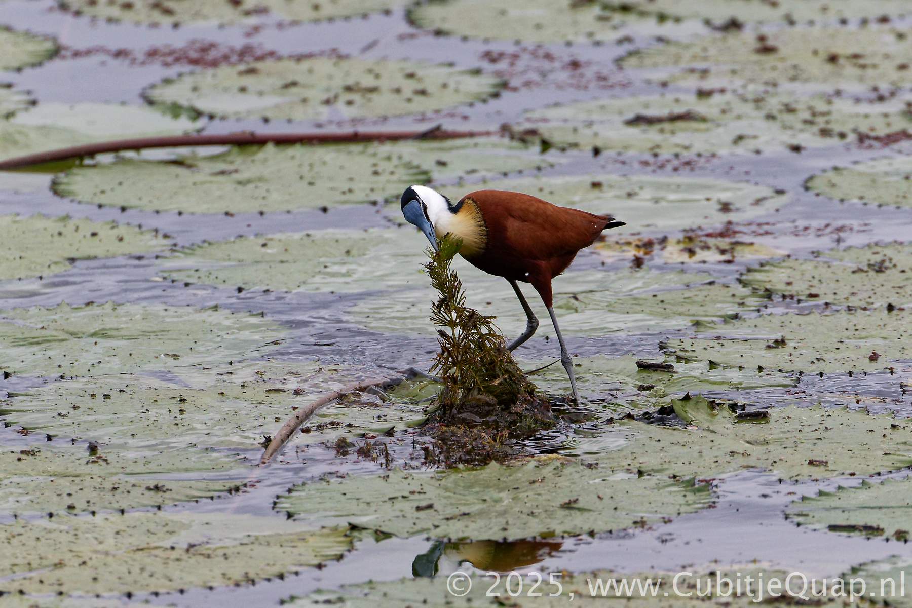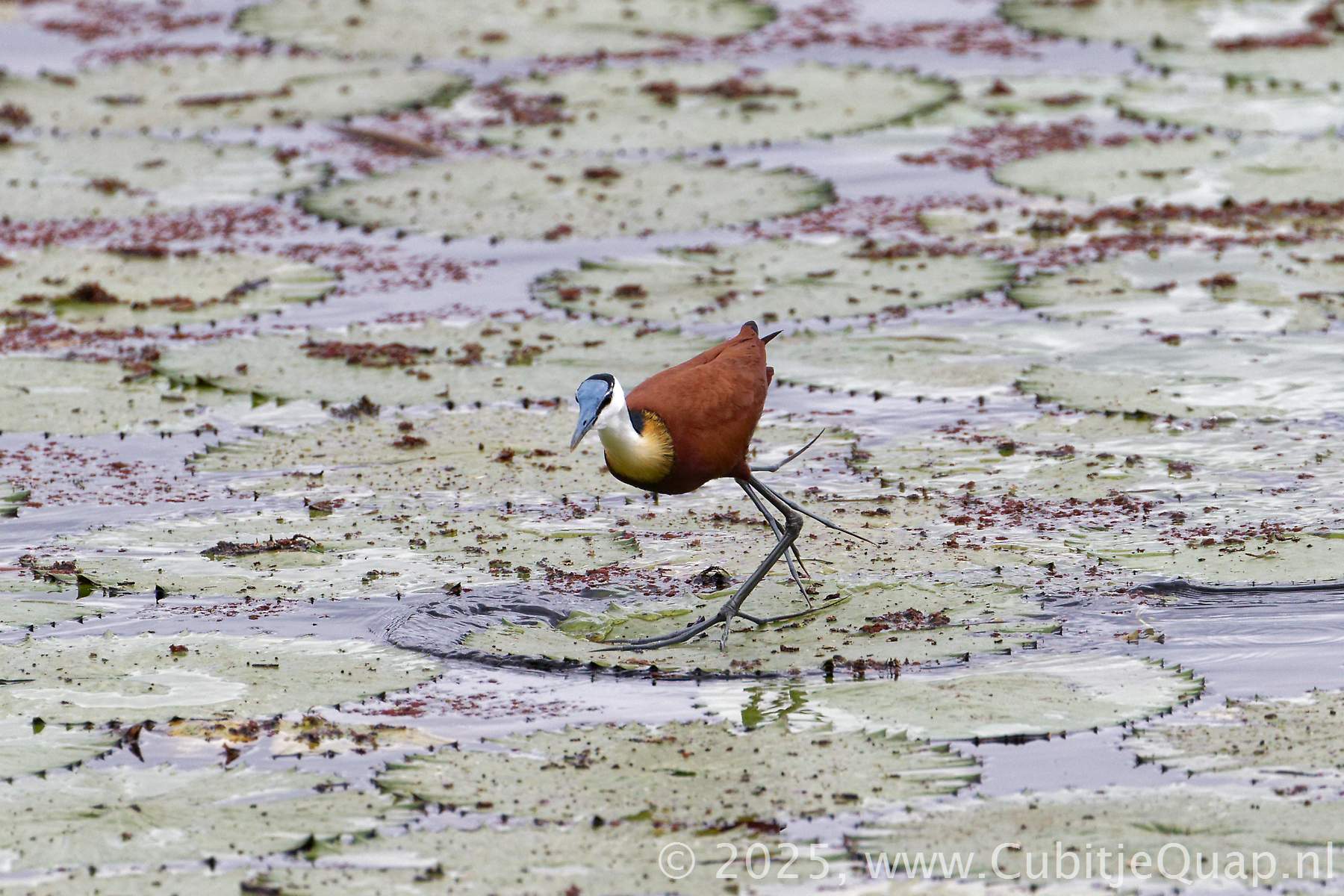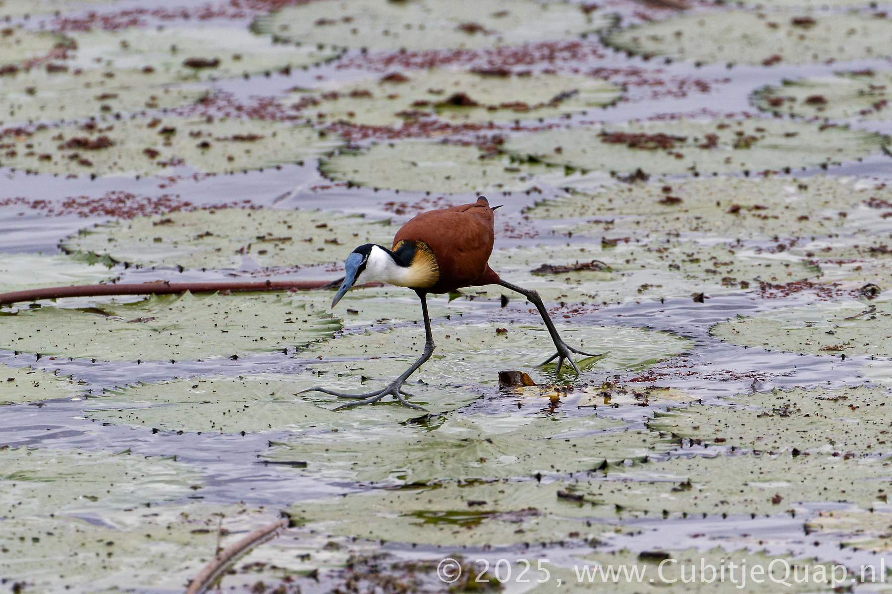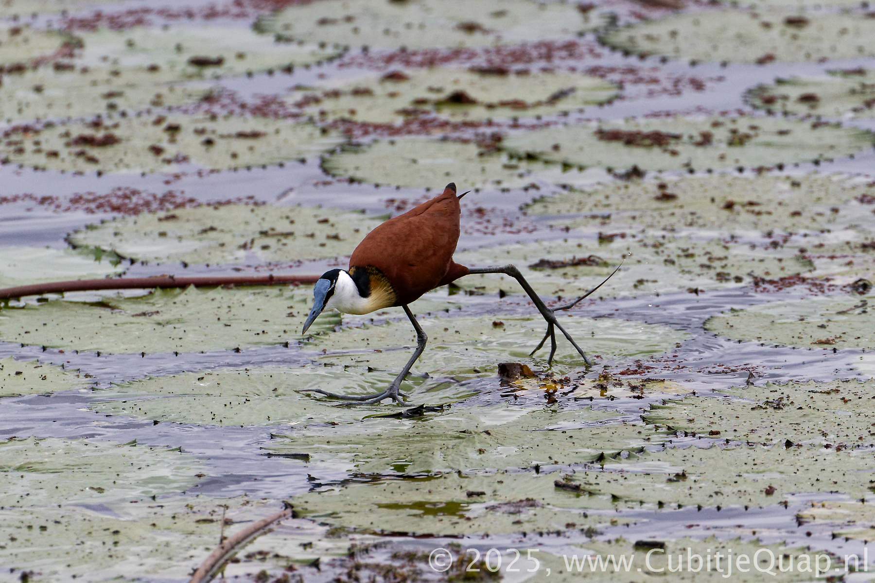 Jacana's have long toes that enables them to walk on the leaves of waterlilies and other water vegetatation. Therefore they are somtimes referred to as Jesus birds or lily trotters.