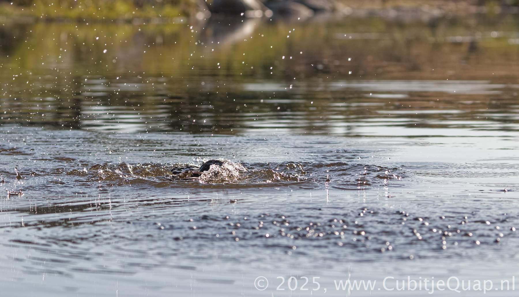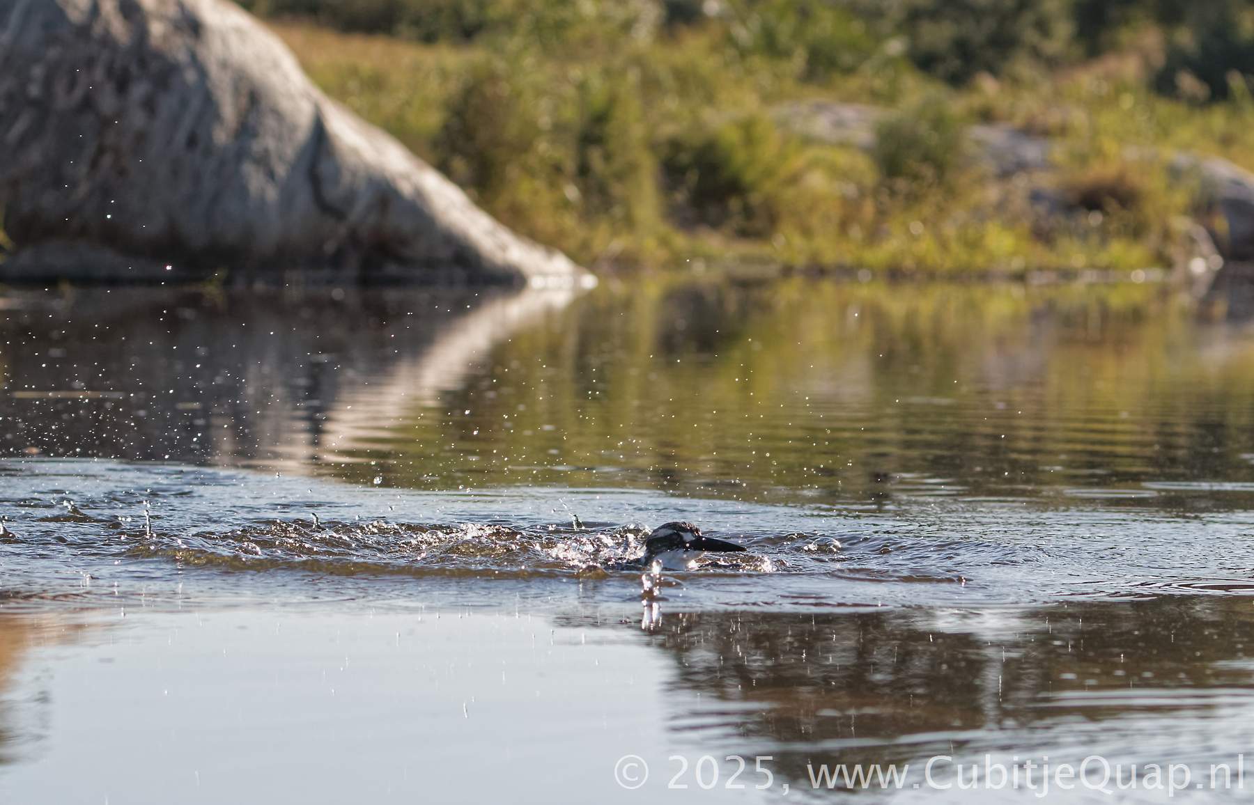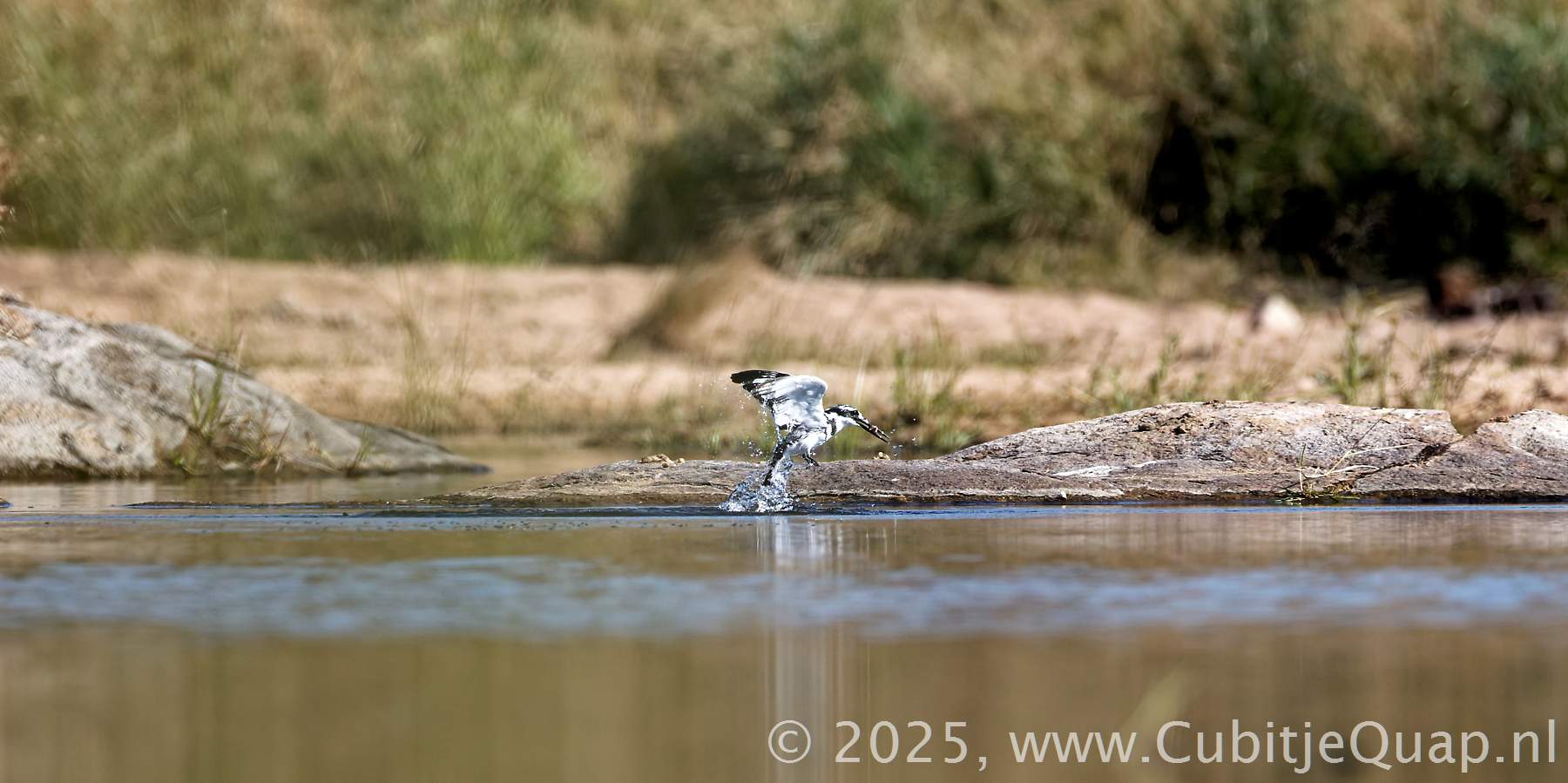 It fishes by watching for preys from a perch, bobbing head and flicking tail, and then by diving into the water making shower of water, and appearing again with its prey in the bill.