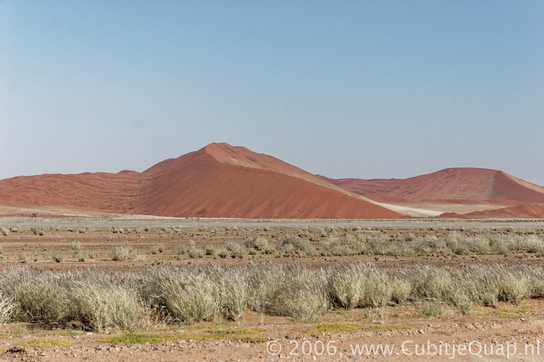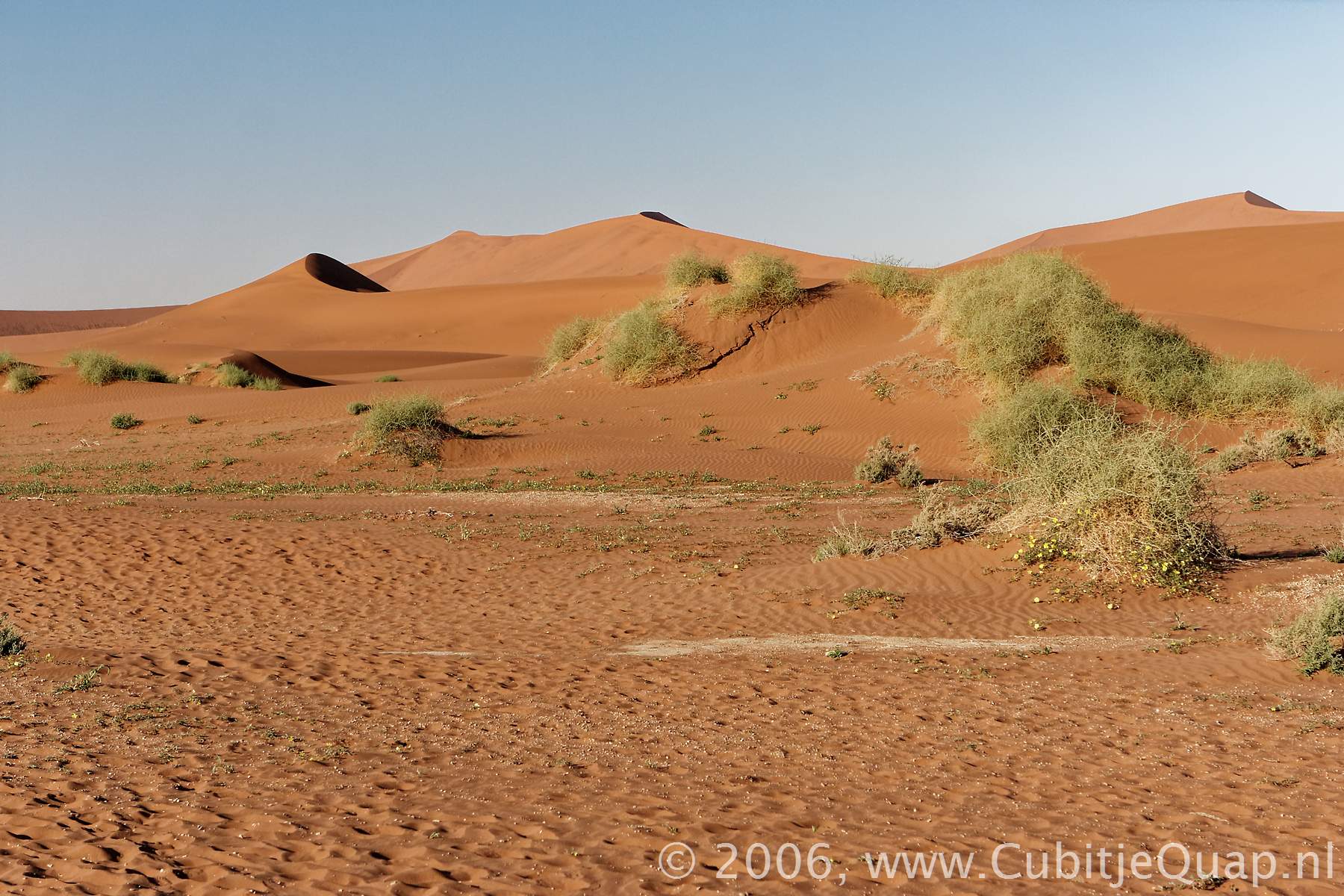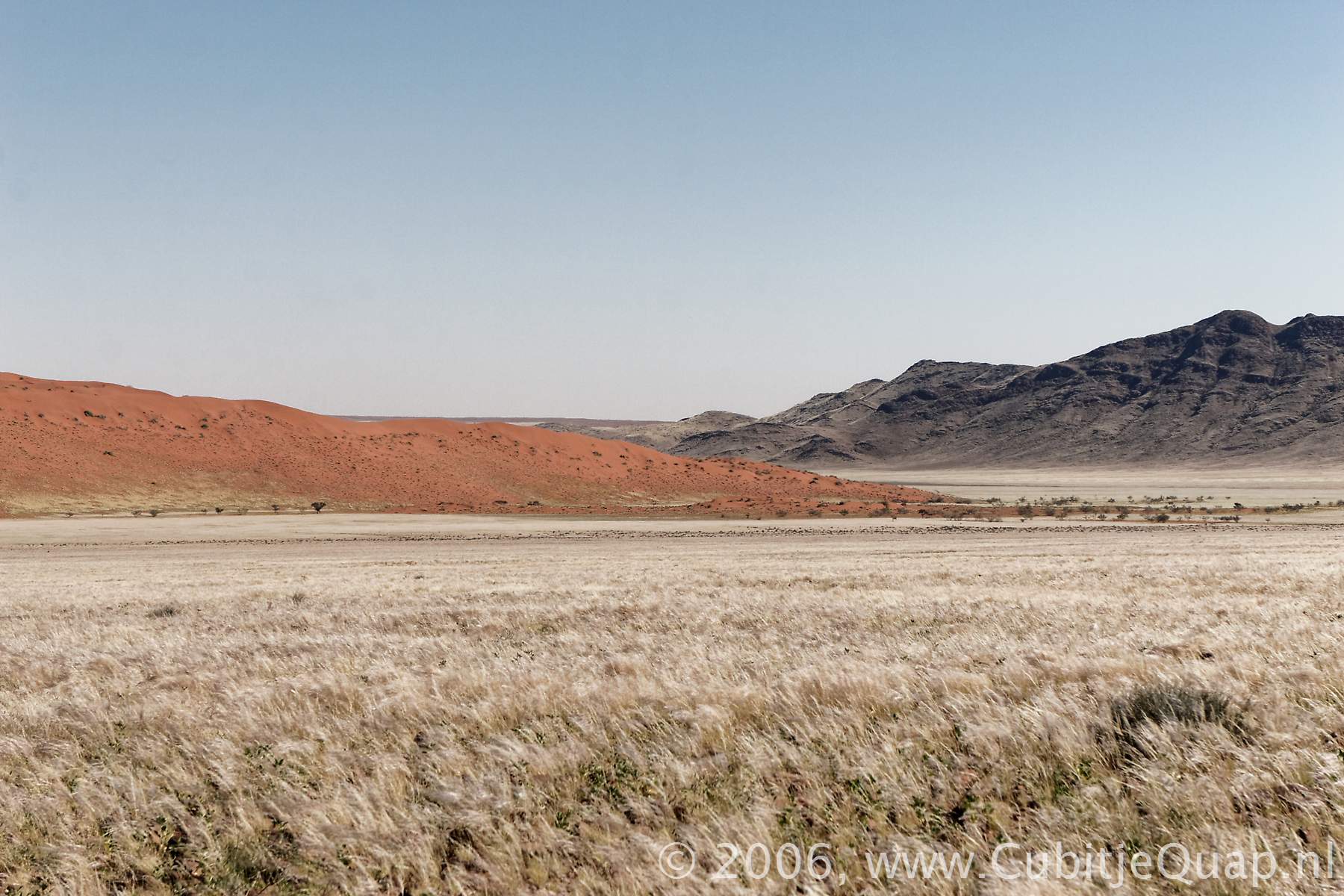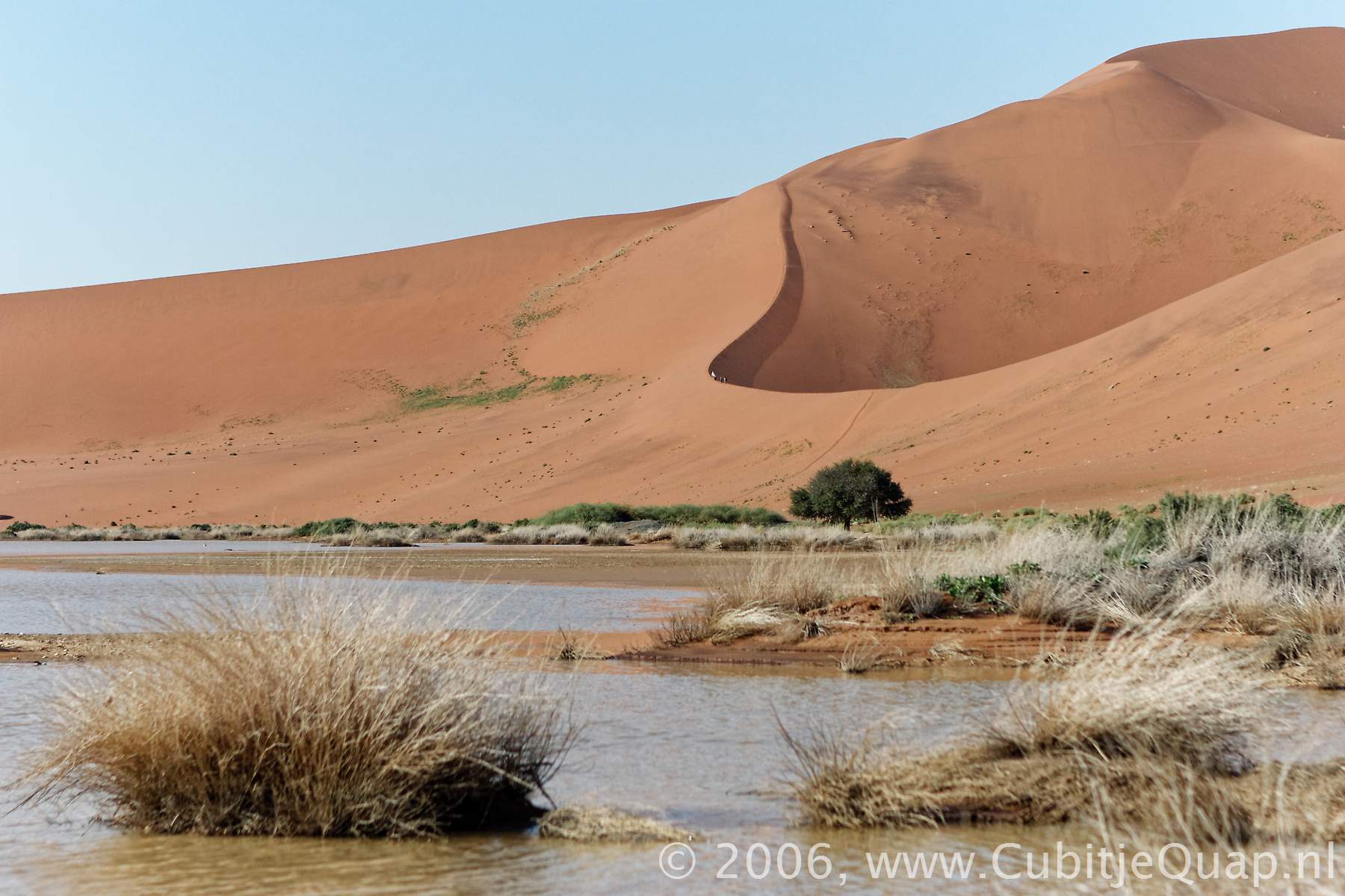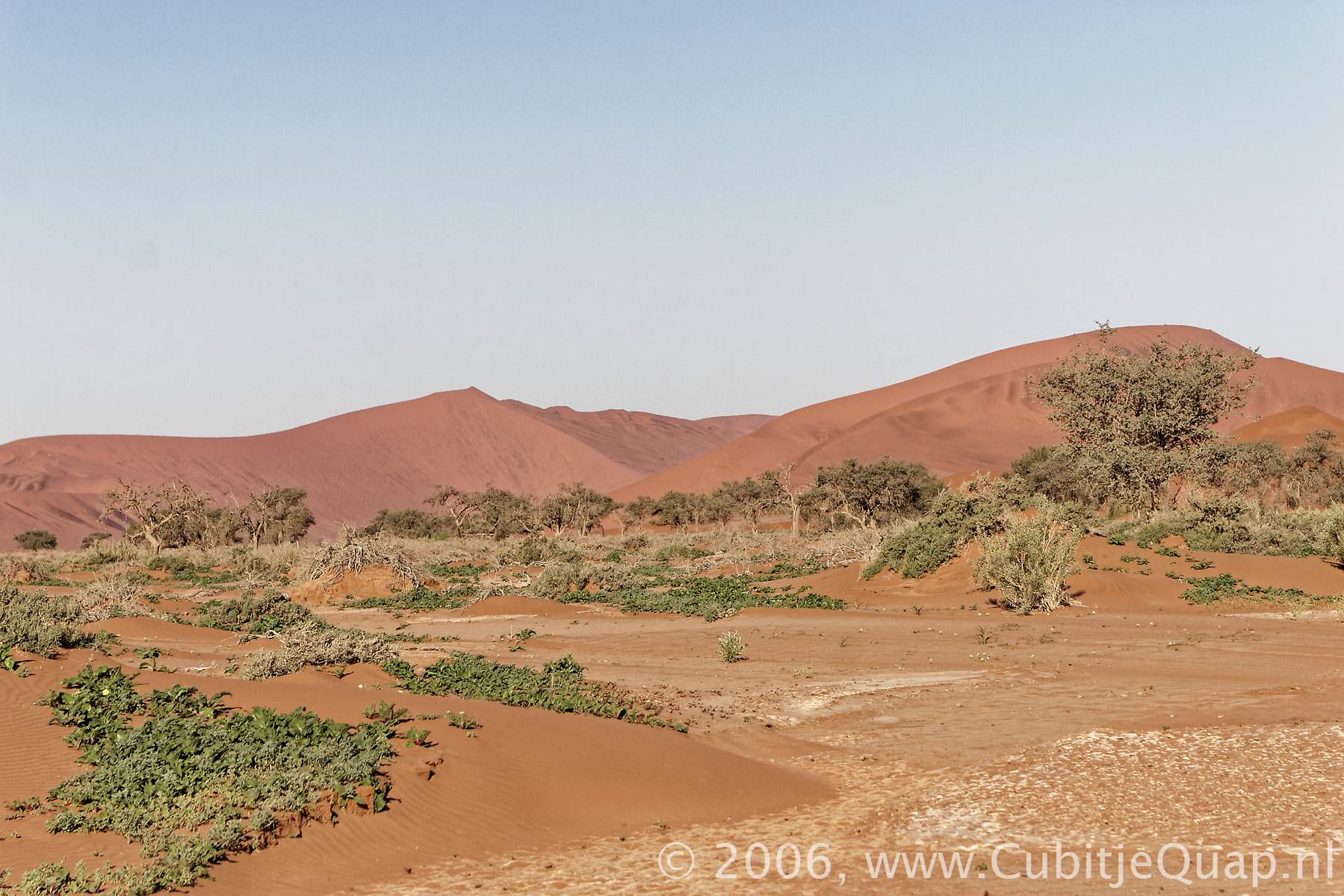 About 24km after leaving Sesriem, the road crosses the Tsauchab River. Although this river seldom flows, the green camelthorn which thrives here, clearly indicates permanent underground water.