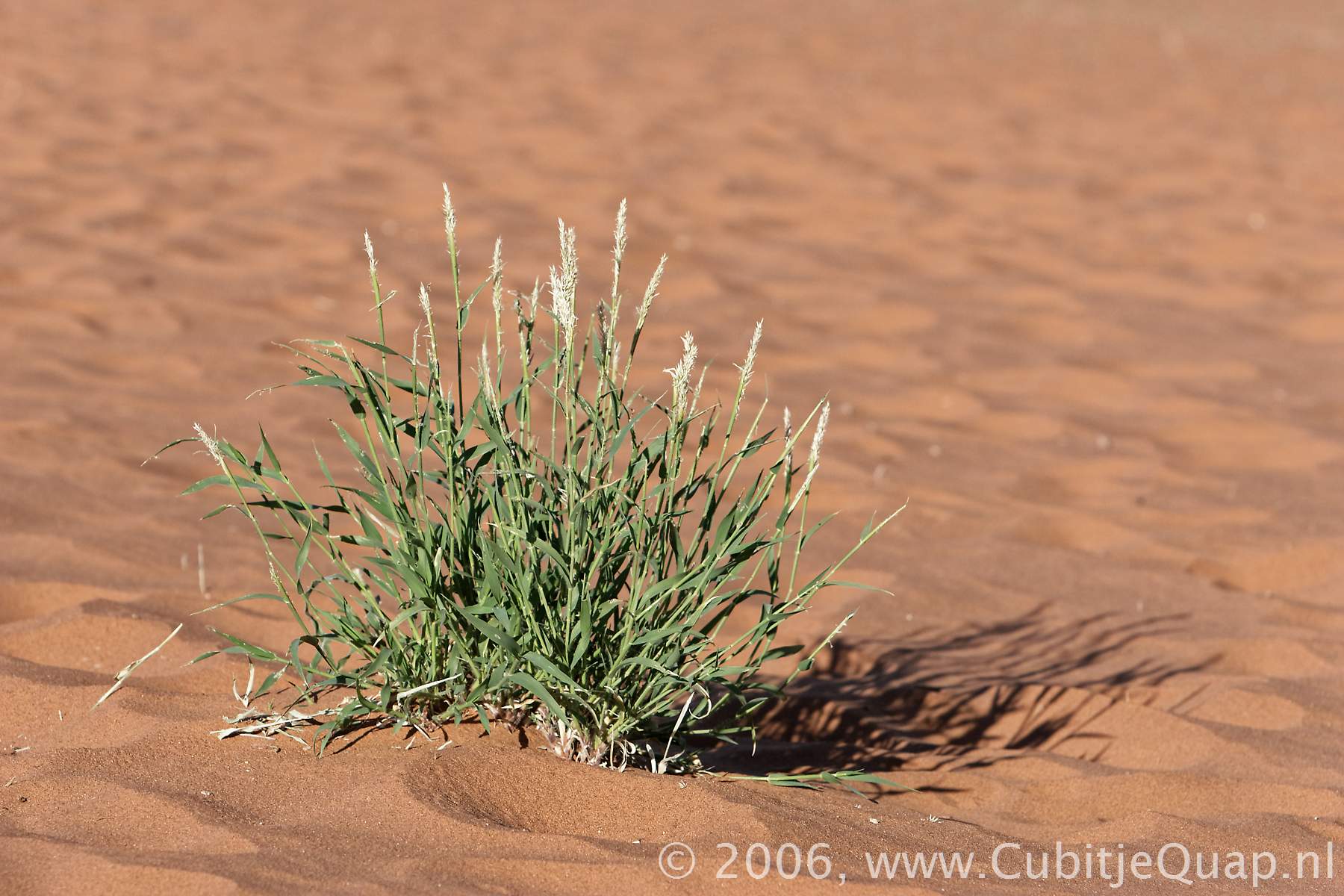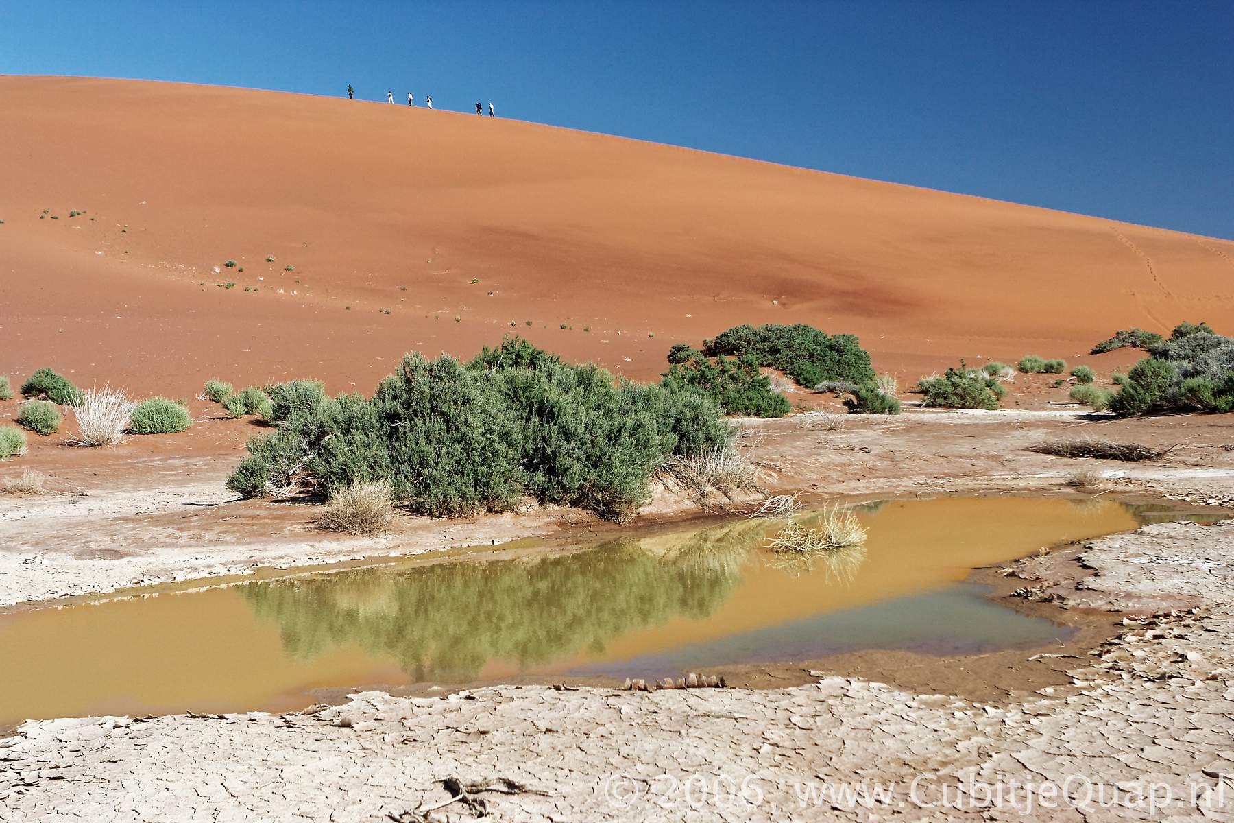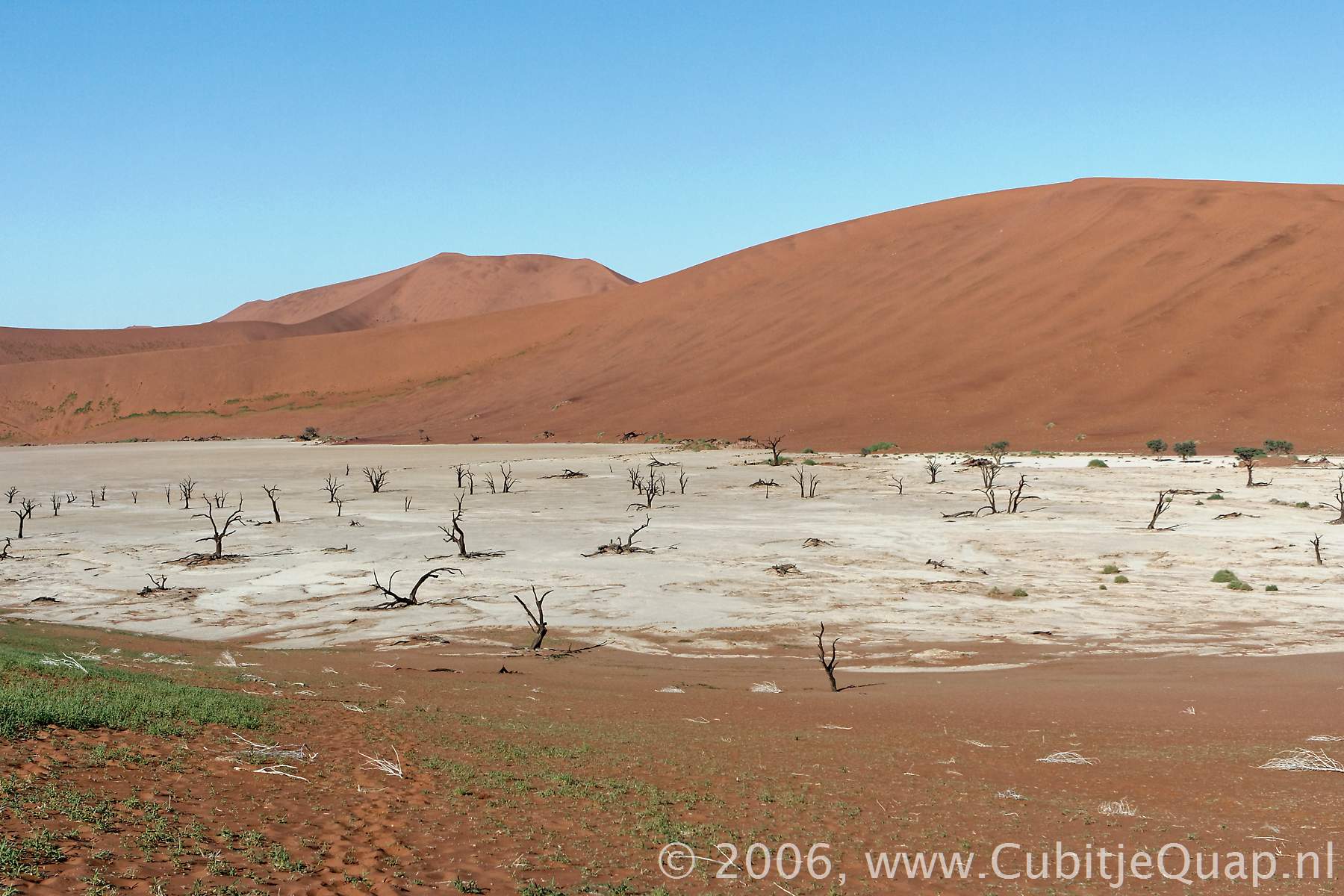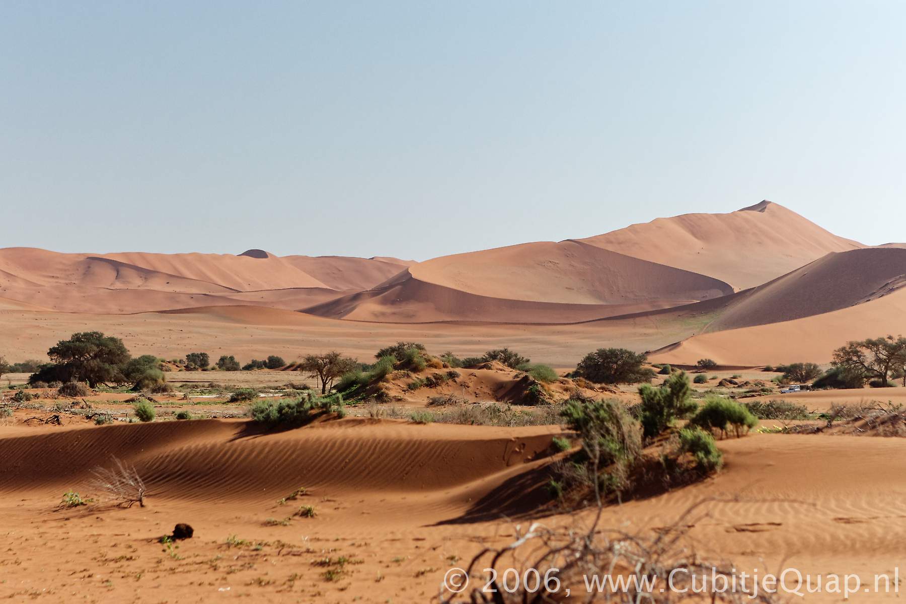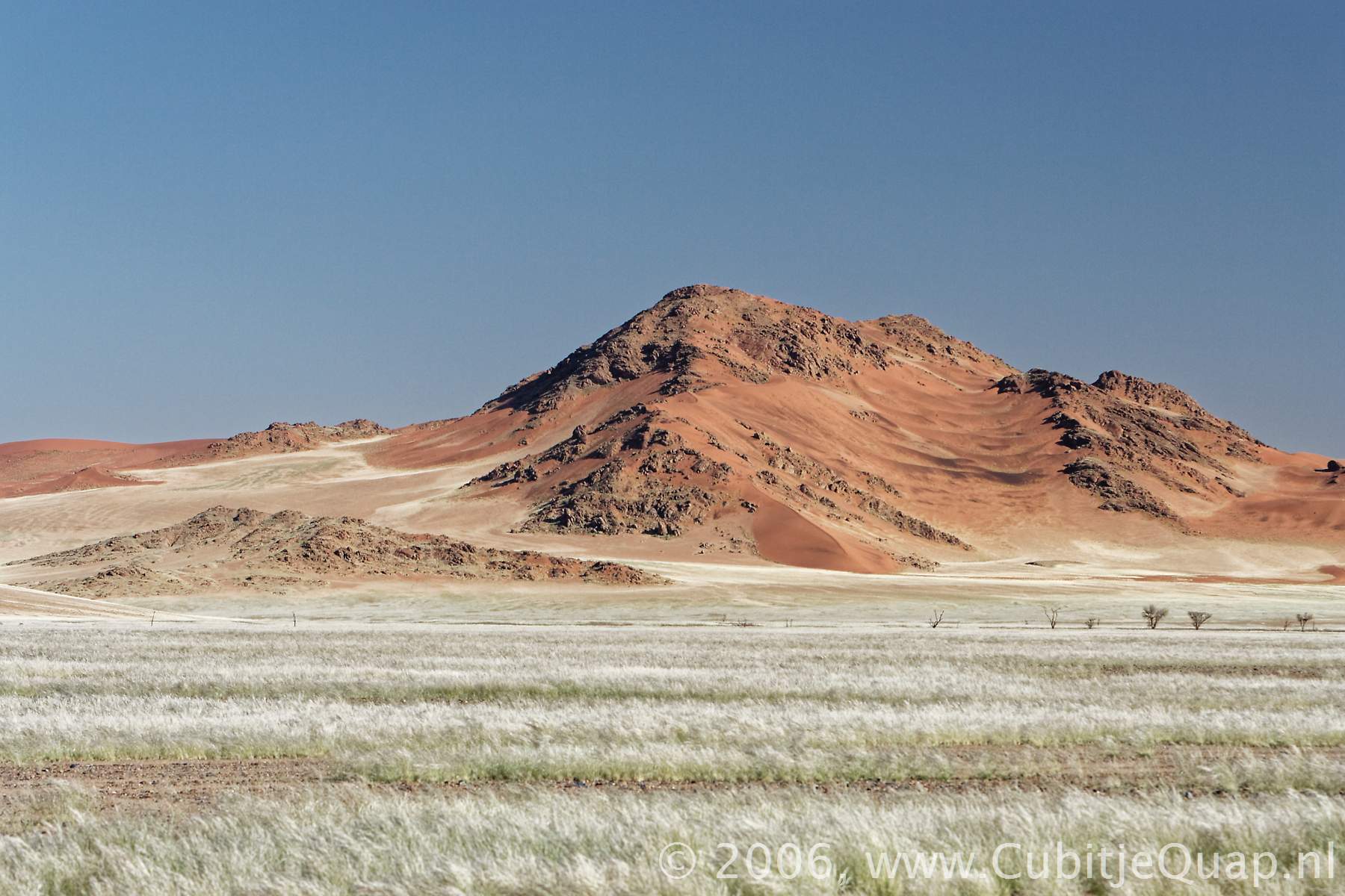 About 24km after leaving Sesriem, the road crosses the Tsauchab River. Although this river seldom flows, the green camelthorn which thrives here, clearly indicates permanent underground water.