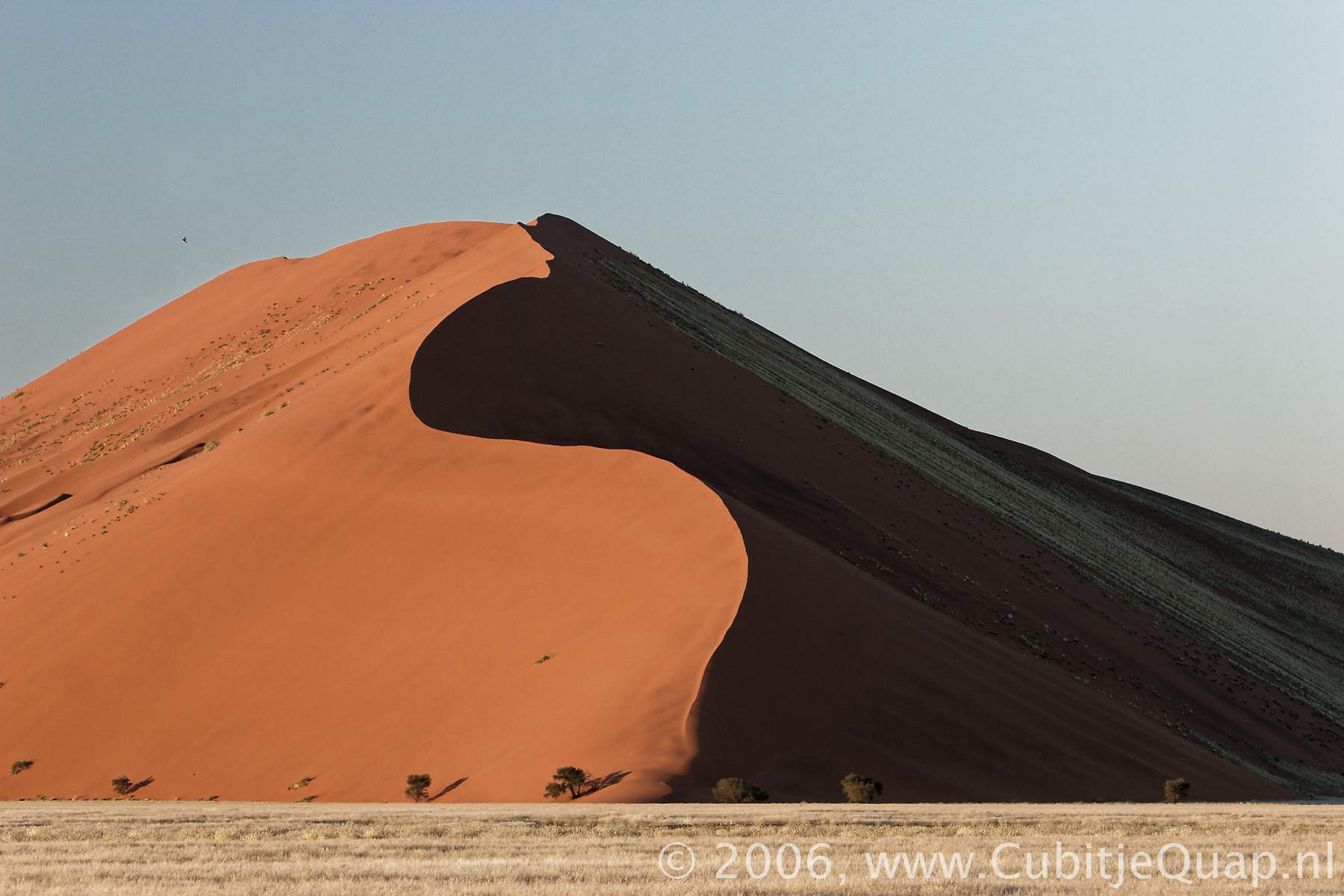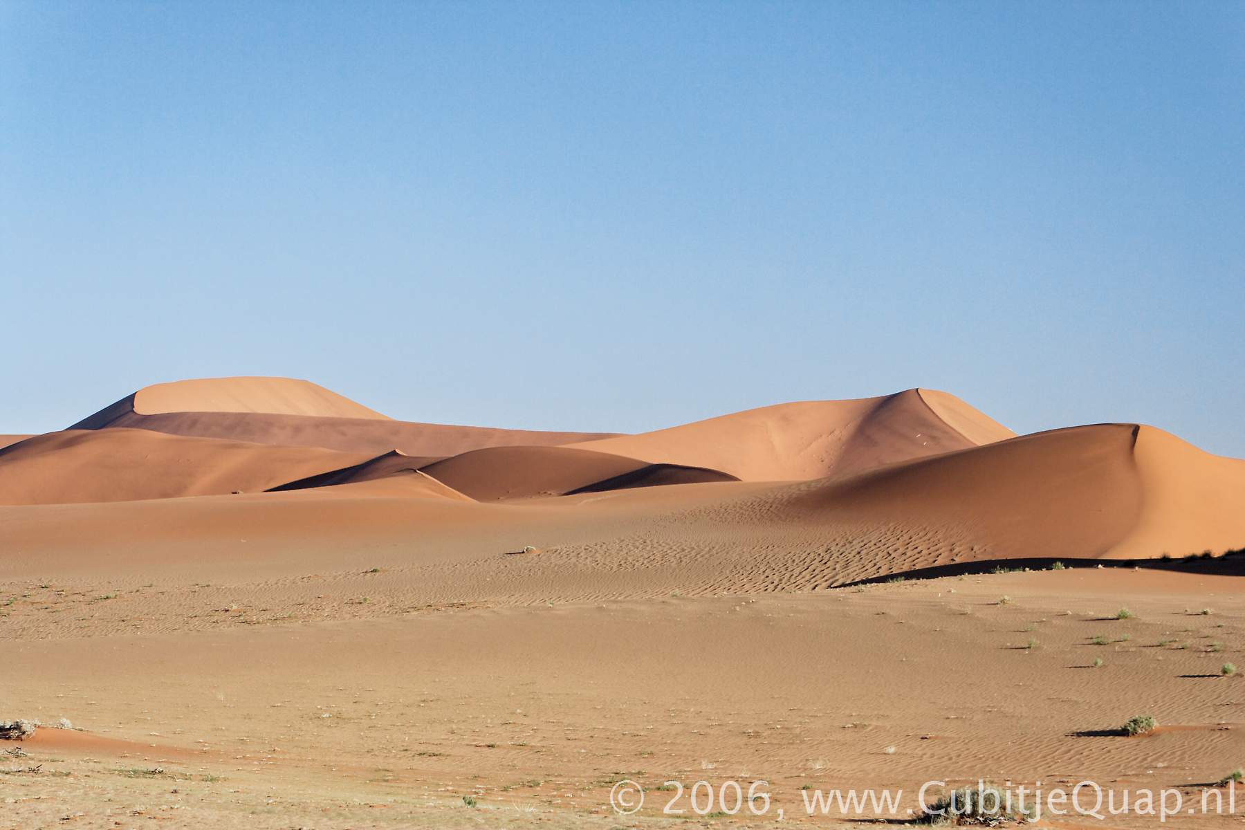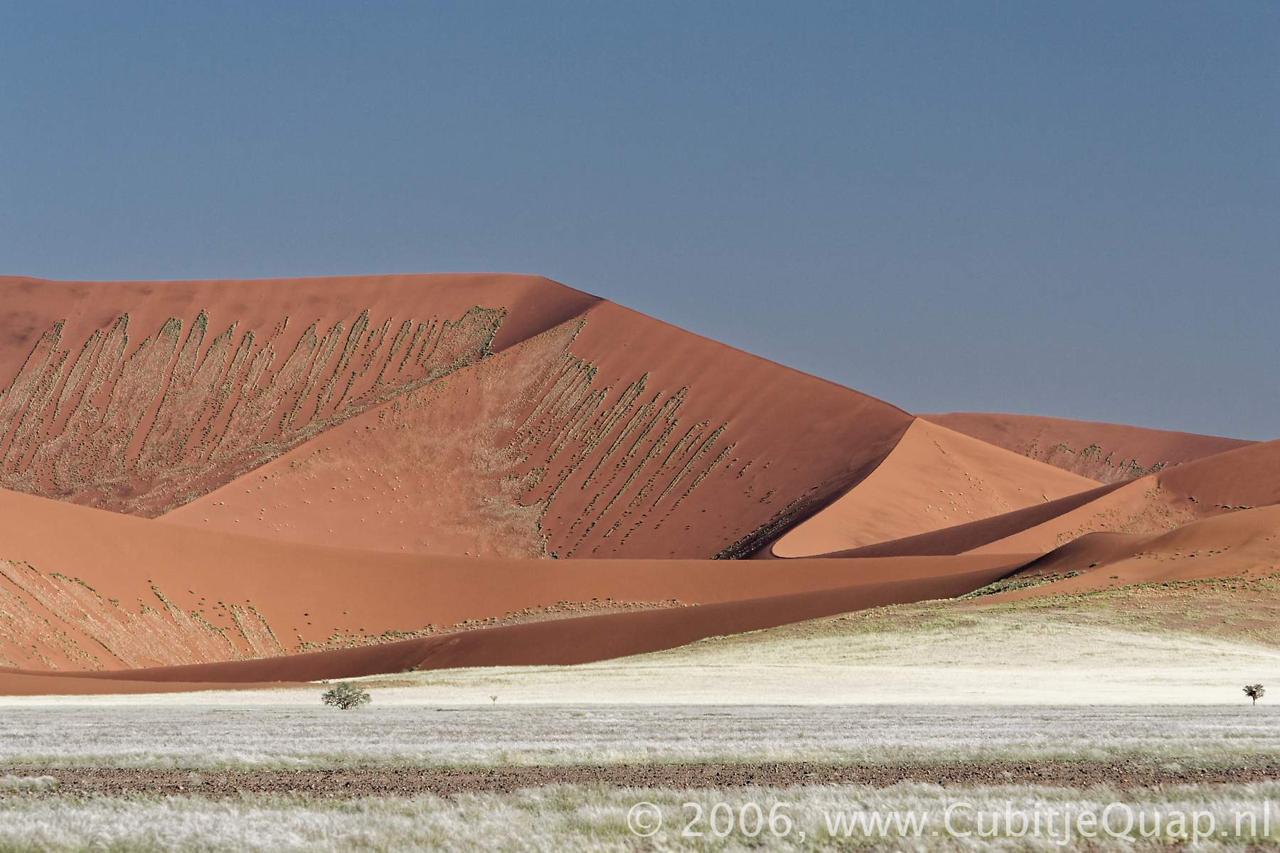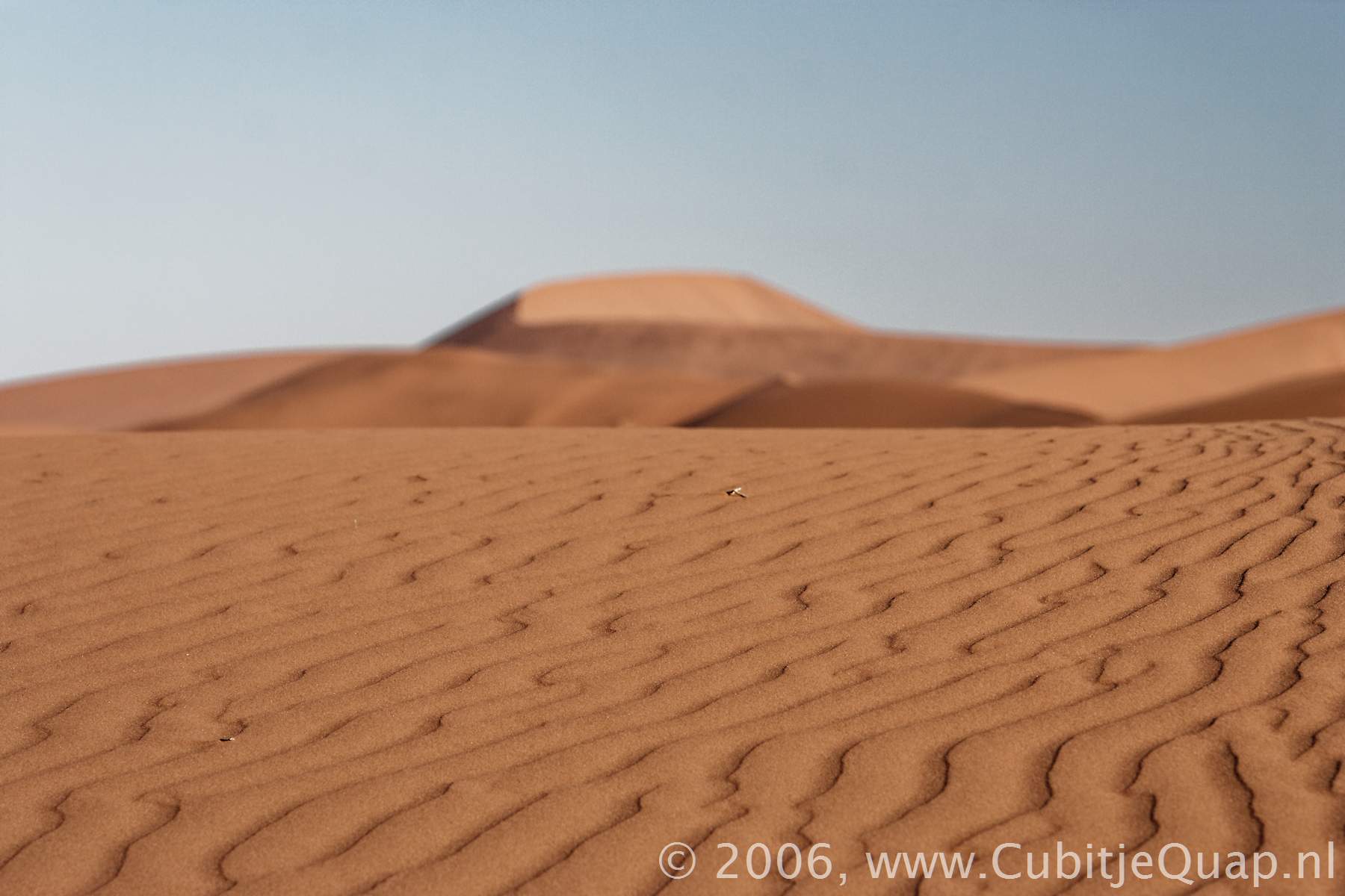 The dunes of the Namib desert have developed over a period of many millions of years. It is thought that the vast quantities of sand were deposited into the Alantic Ocean by the Orange river. This material was subsequently moved northwards by the Benguela current to be dumped back onto the land by the surf.