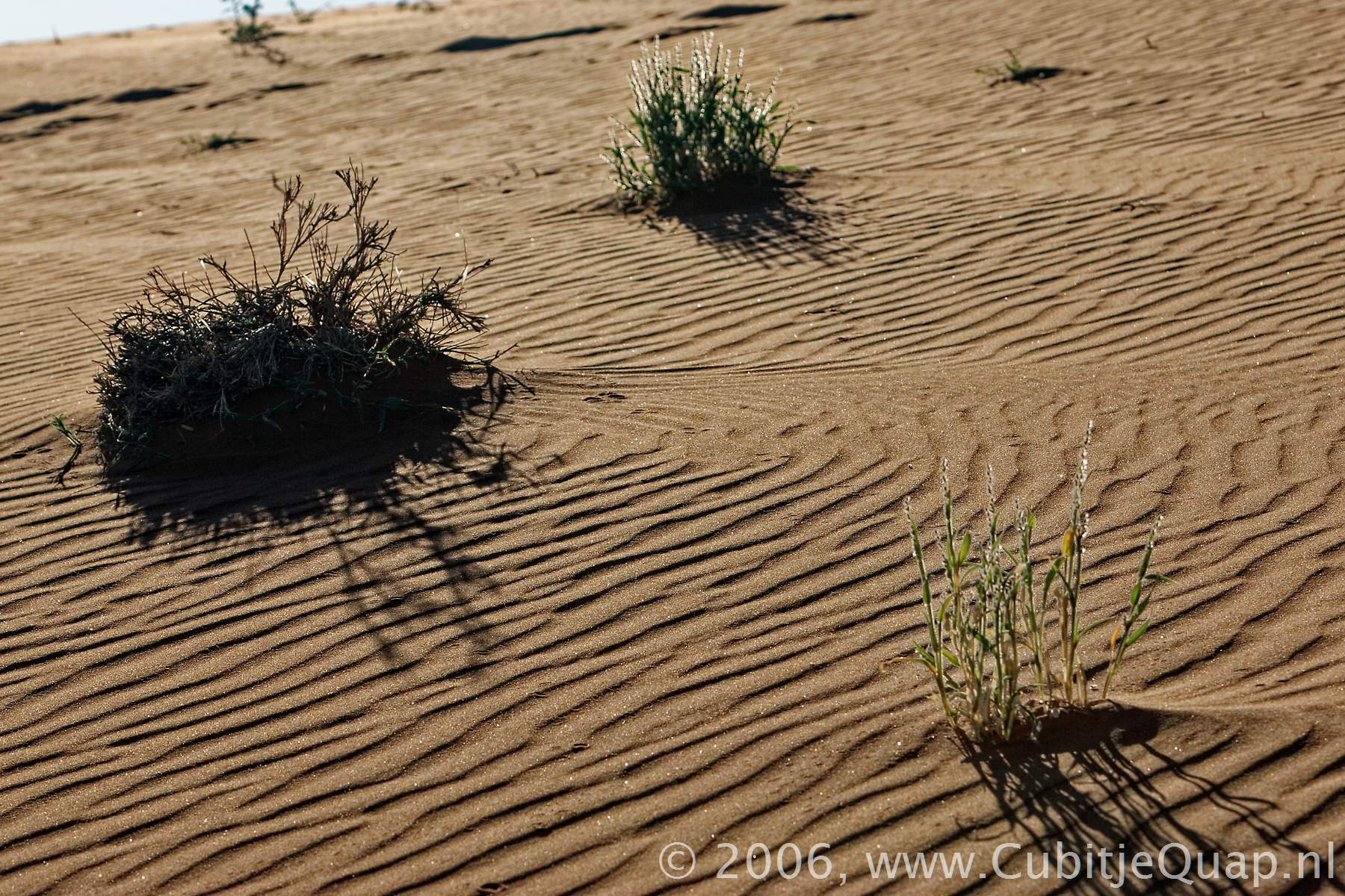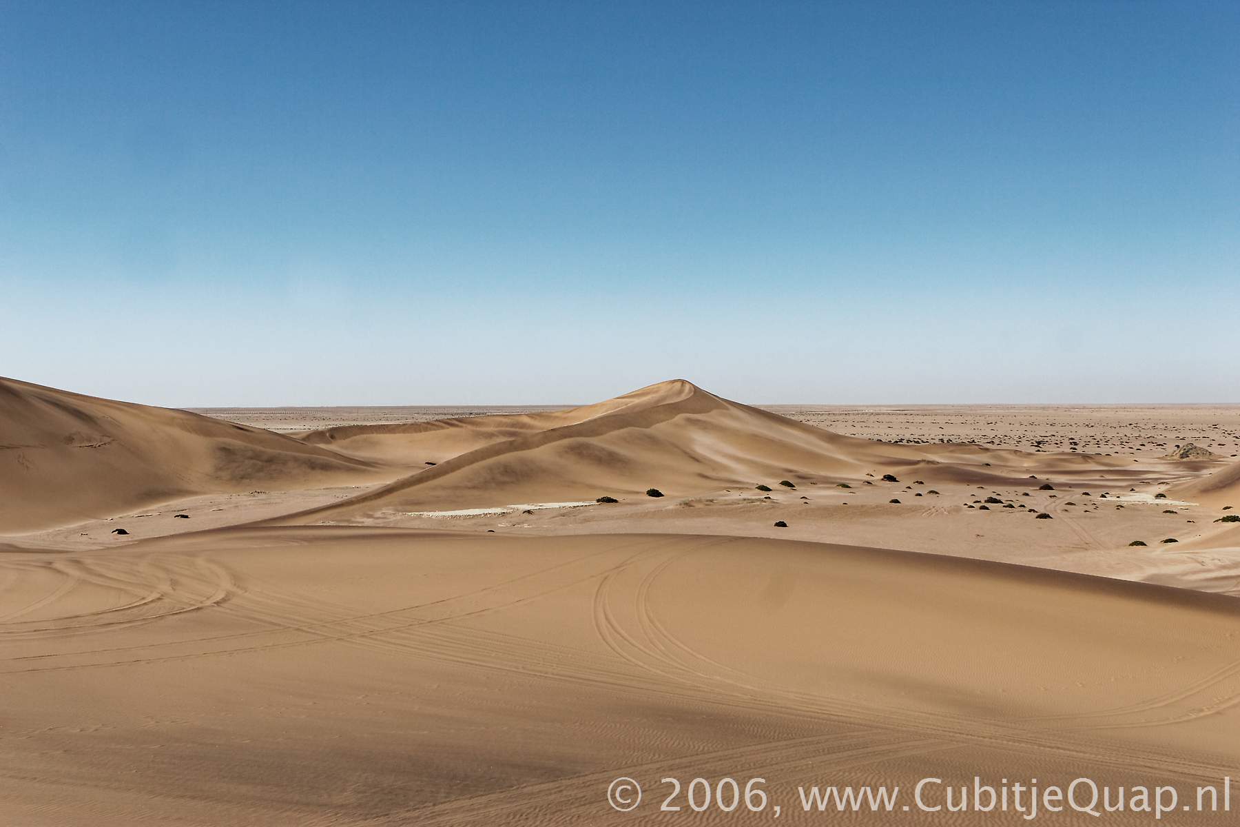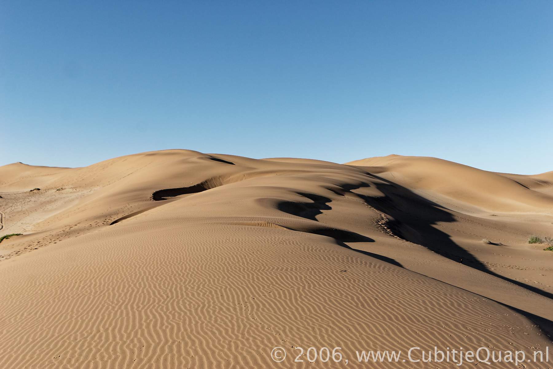 The dunes of the Namib desert have developed over a period of many millions of years. It is thought that the vast quantities of sand were deposited into the Alantic Ocean by the Orange river. This material was subsequently moved northwards by the Benguela current to be dumped back onto the land by the surf.