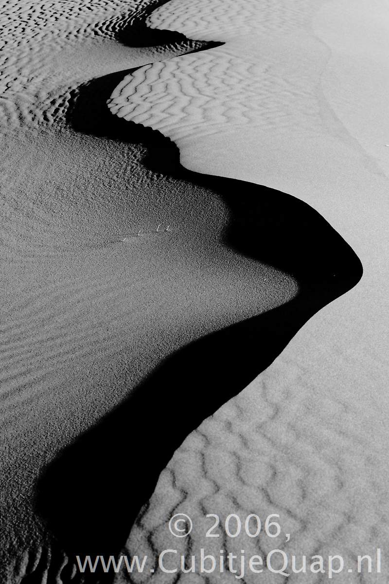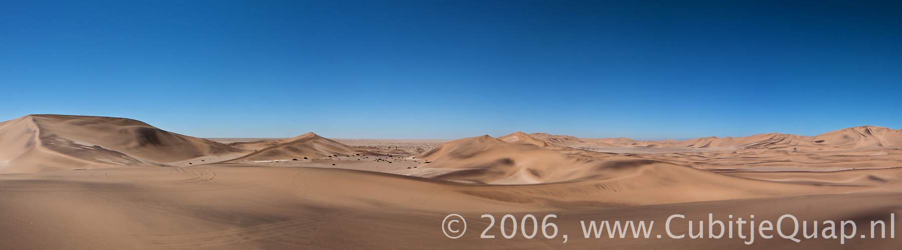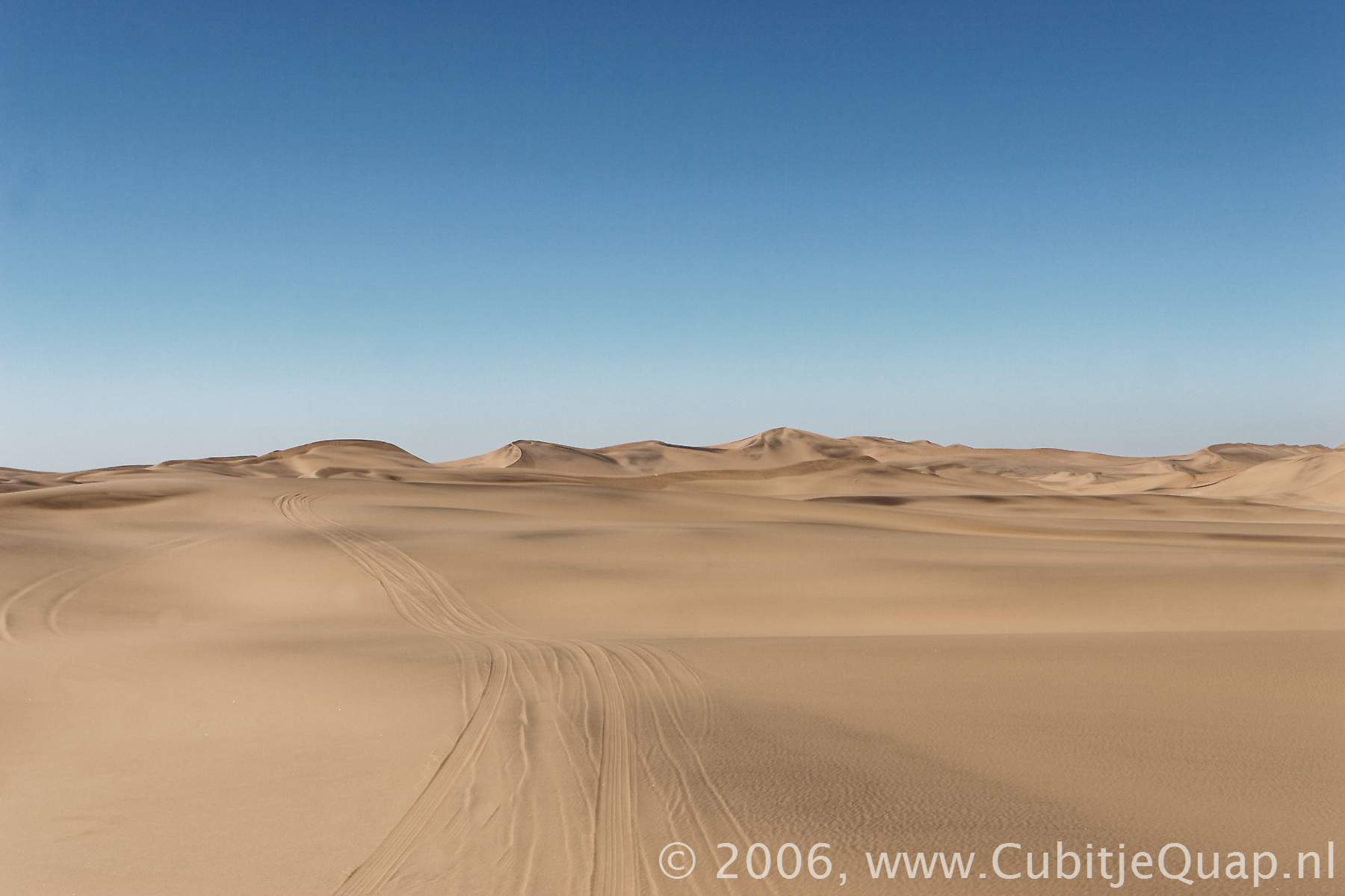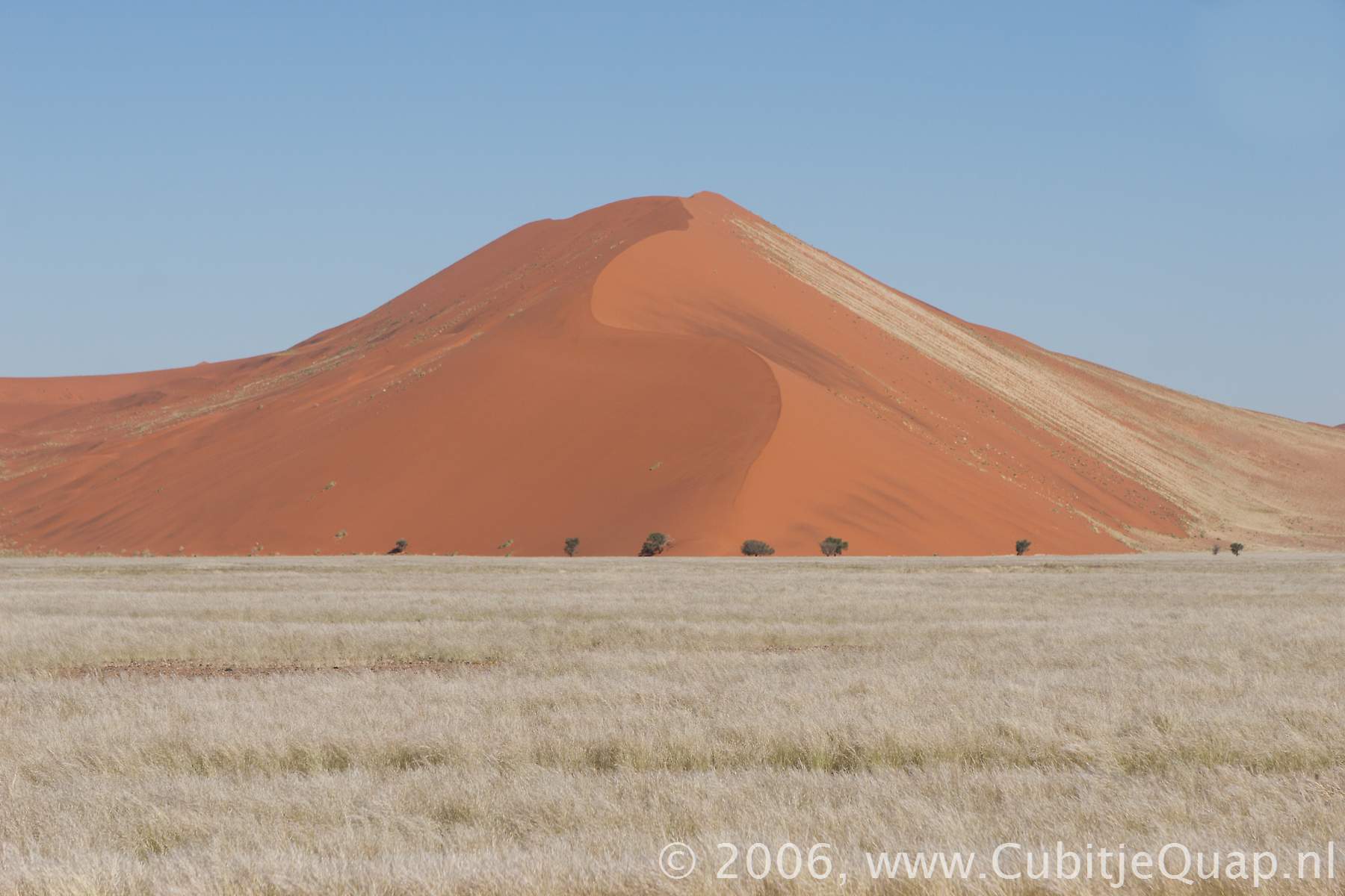 The dunes of the Namib desert have developed over a period of many millions of years. It is thought that the vast quantities of sand were deposited into the Alantic Ocean by the Orange river. This material was subsequently moved northwards by the Benguela current to be dumped back onto the land by the surf.