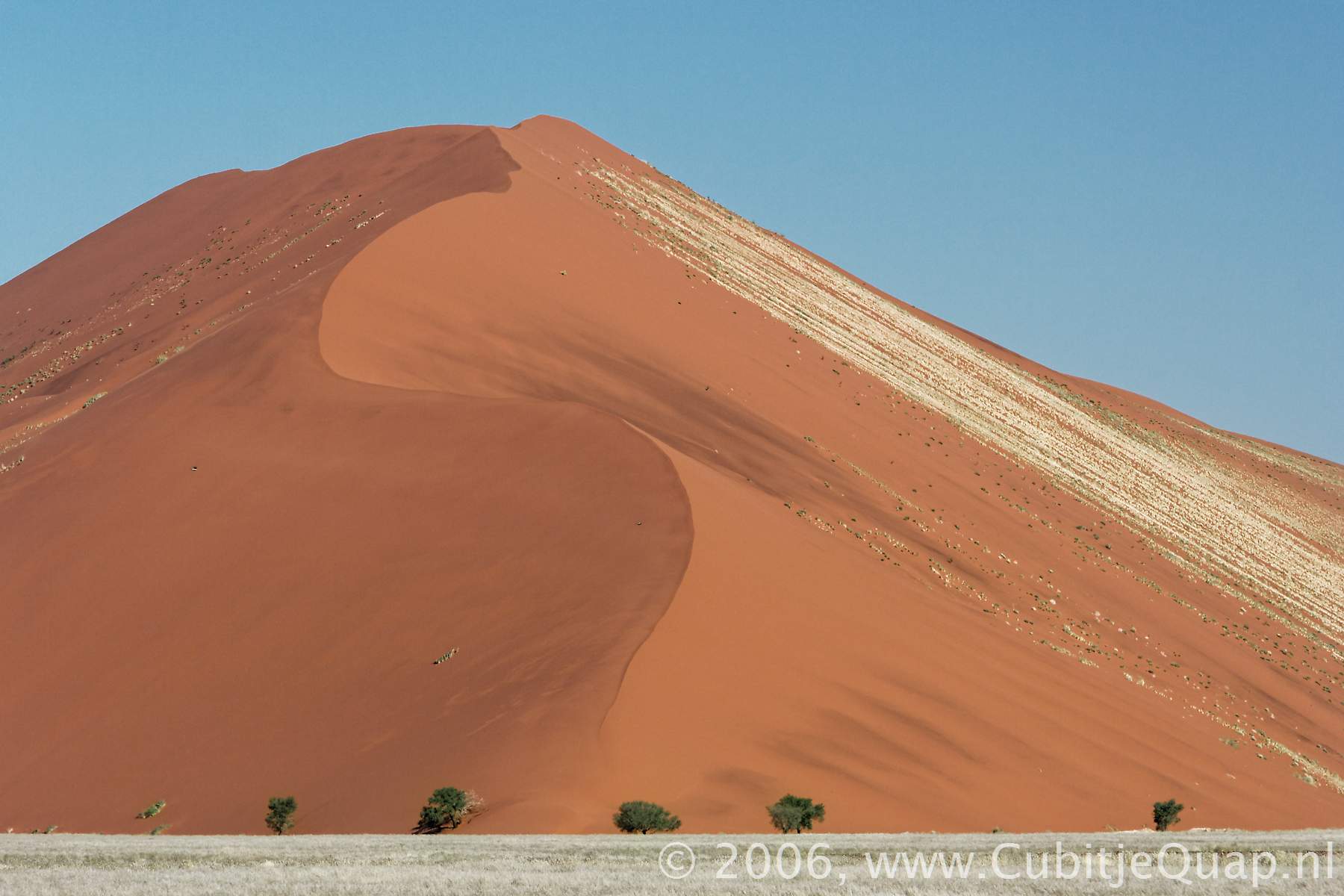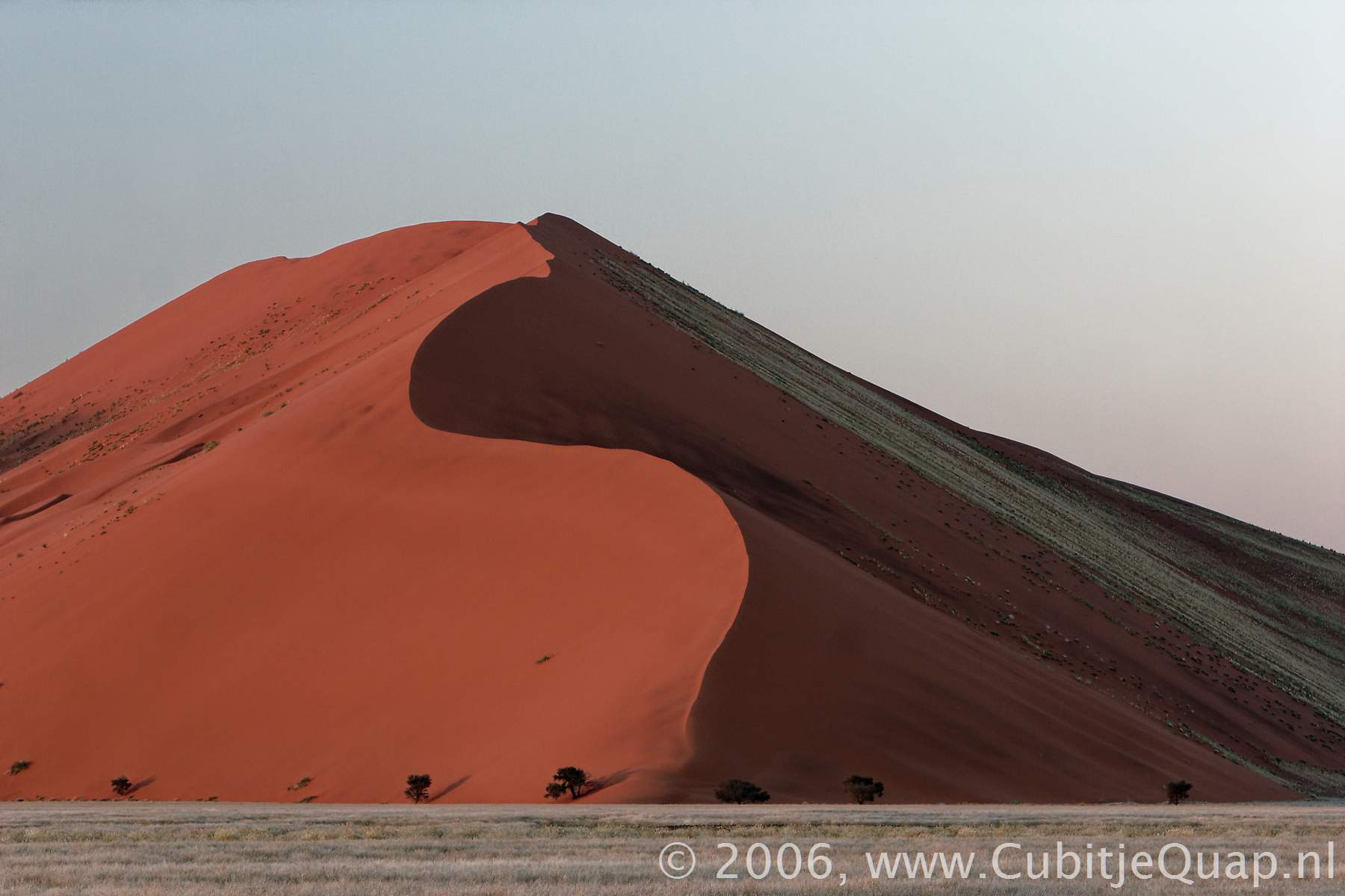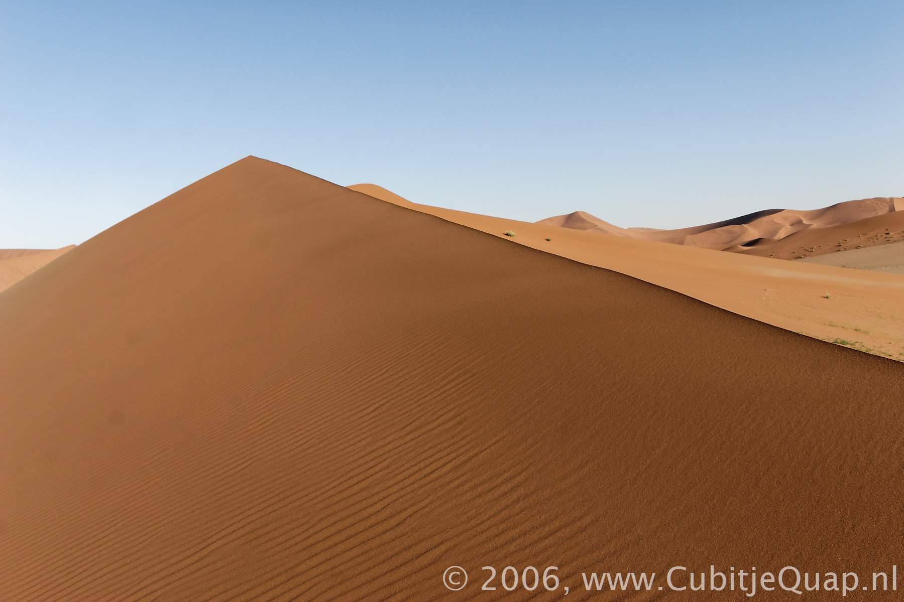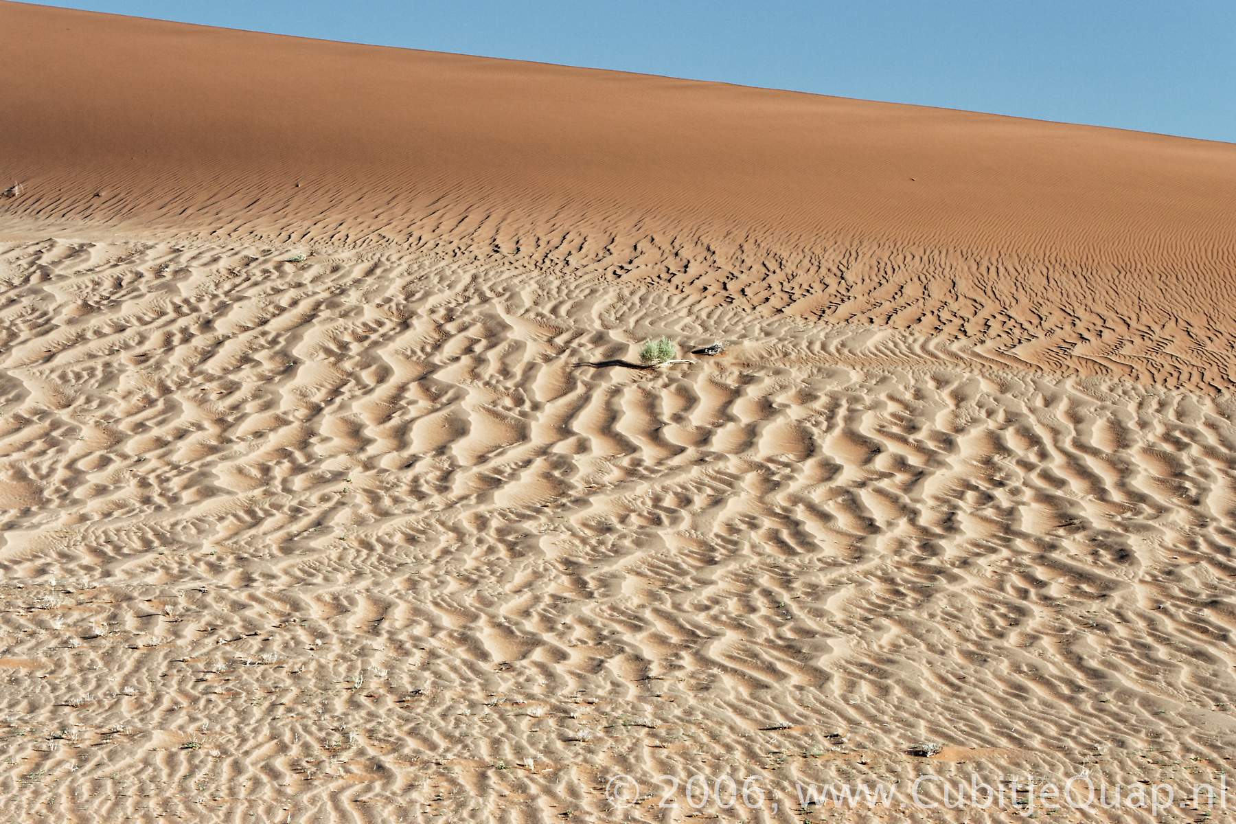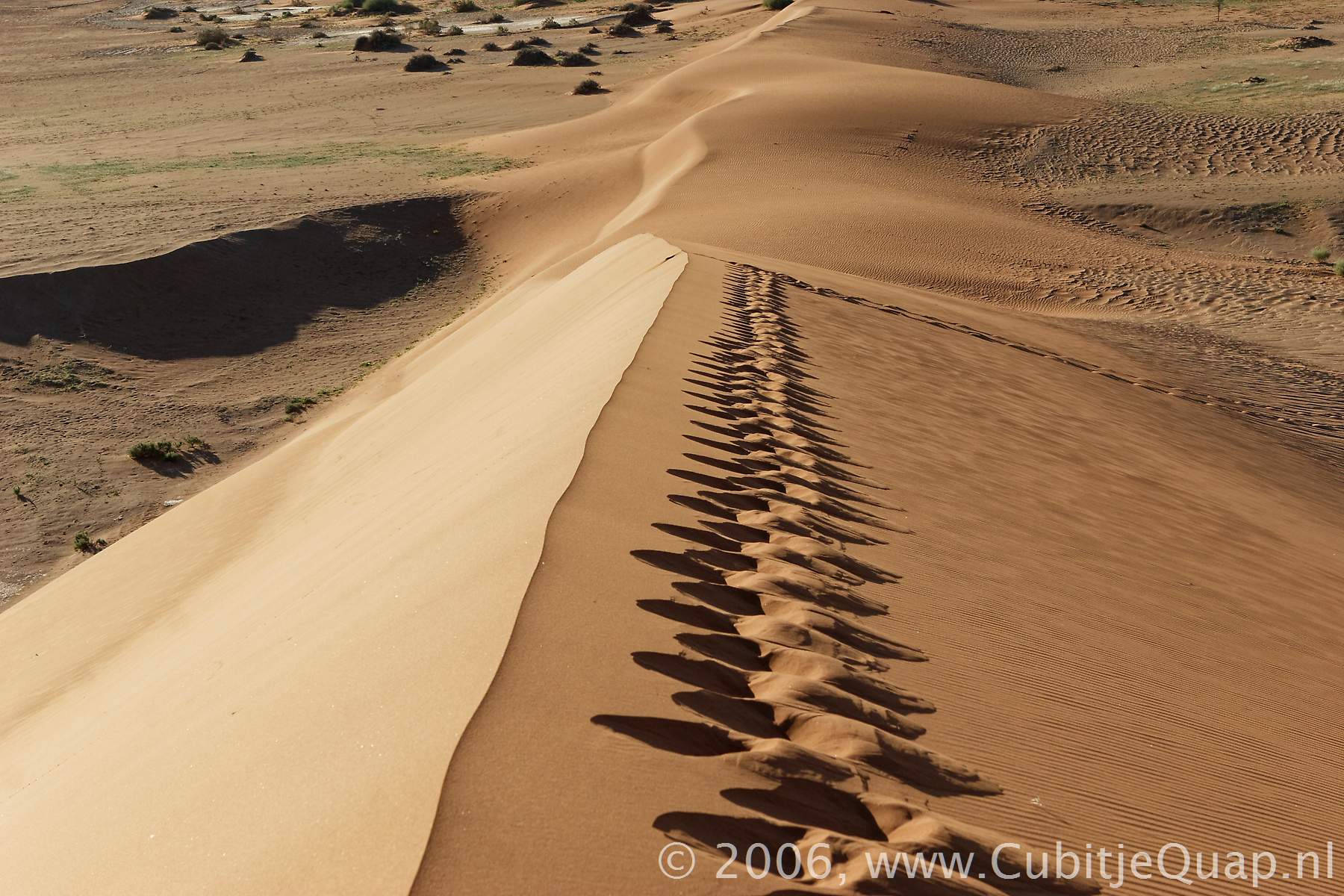 The coastal dunes developed as a result of this and were shifted further and further inland by the wind. Wind continuously reshapes the patterns of the huge dunes of the Namib desert. It timelessly forces the grains of sand on the flat windward slope upwards to the crest of the dune. Here they fall down in the wind shade. The leeward slope is therefore always considerably steeper than the windward side.