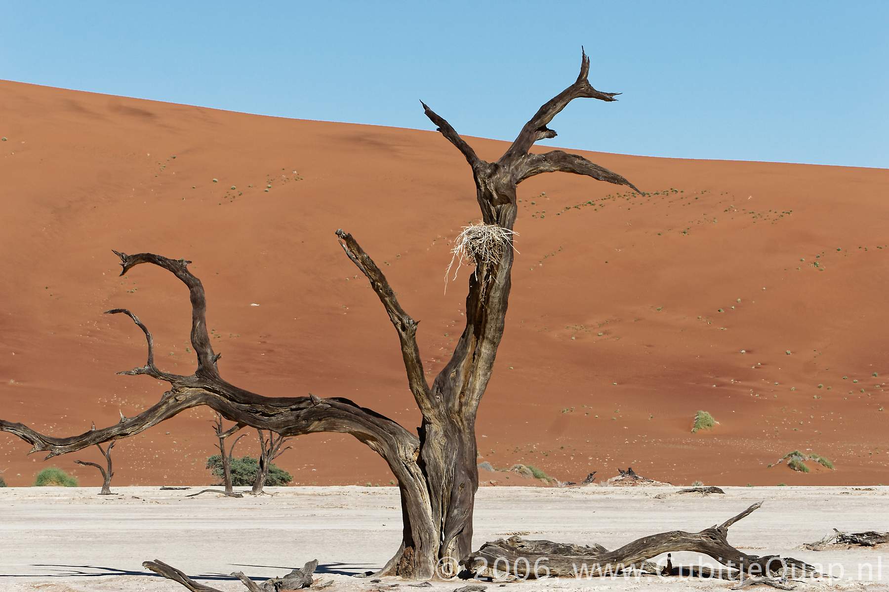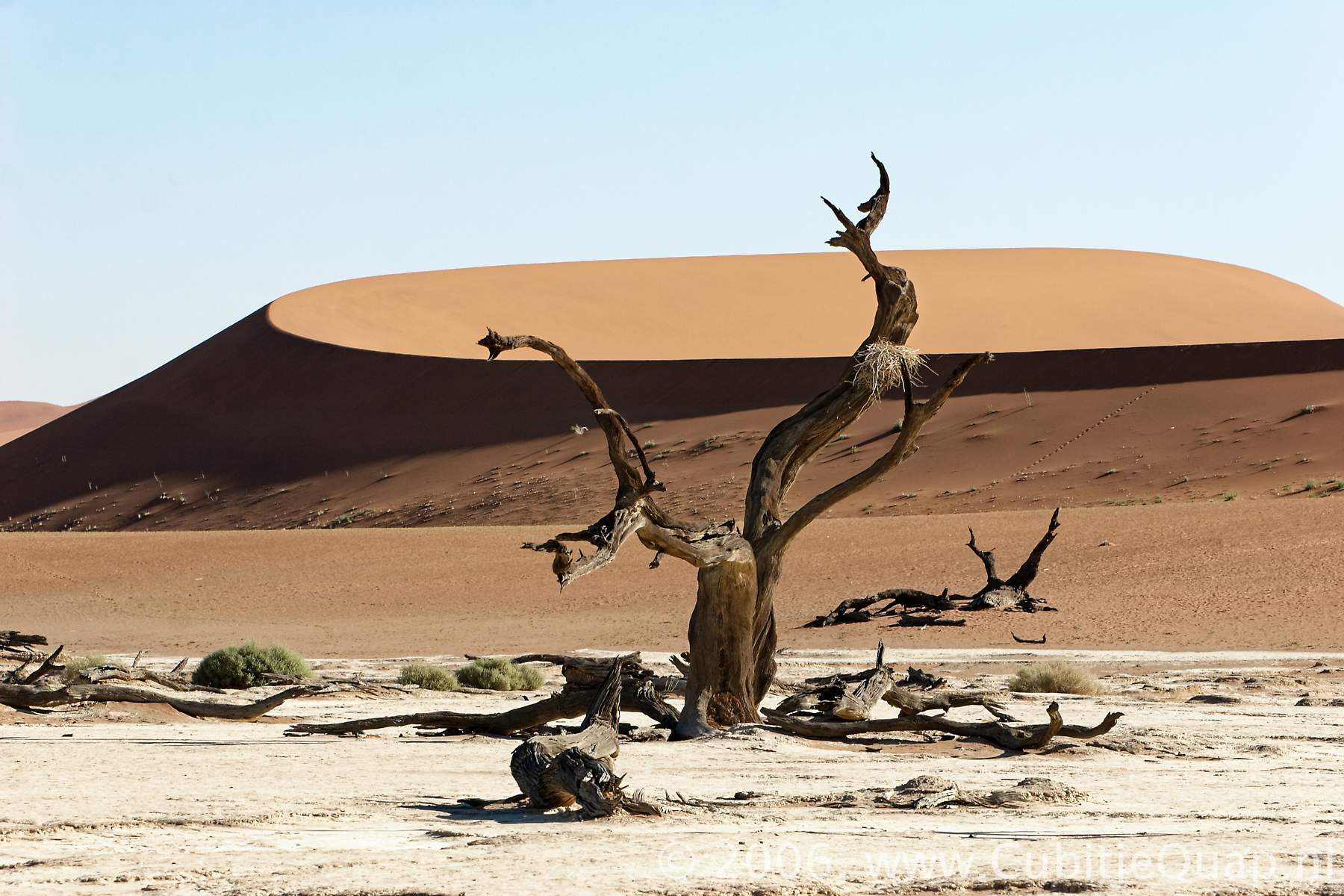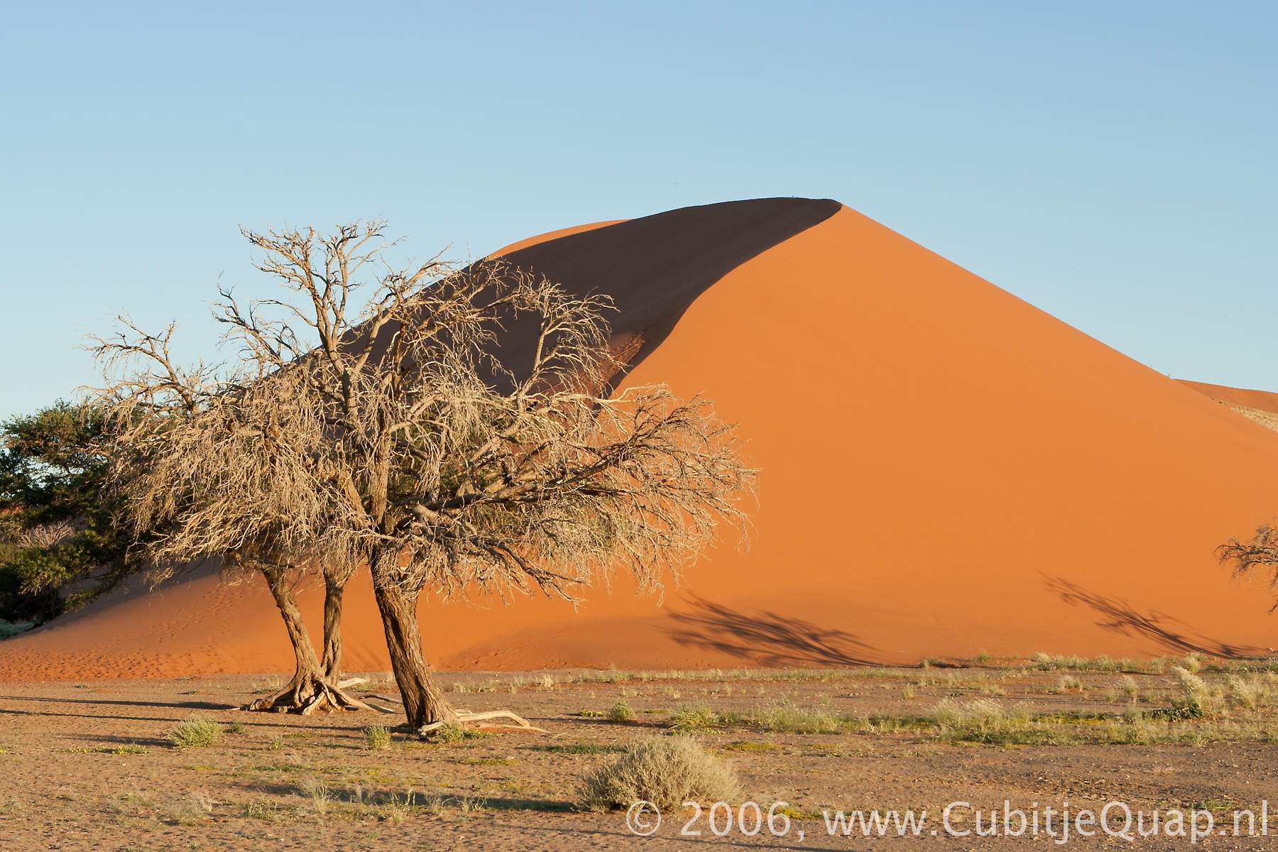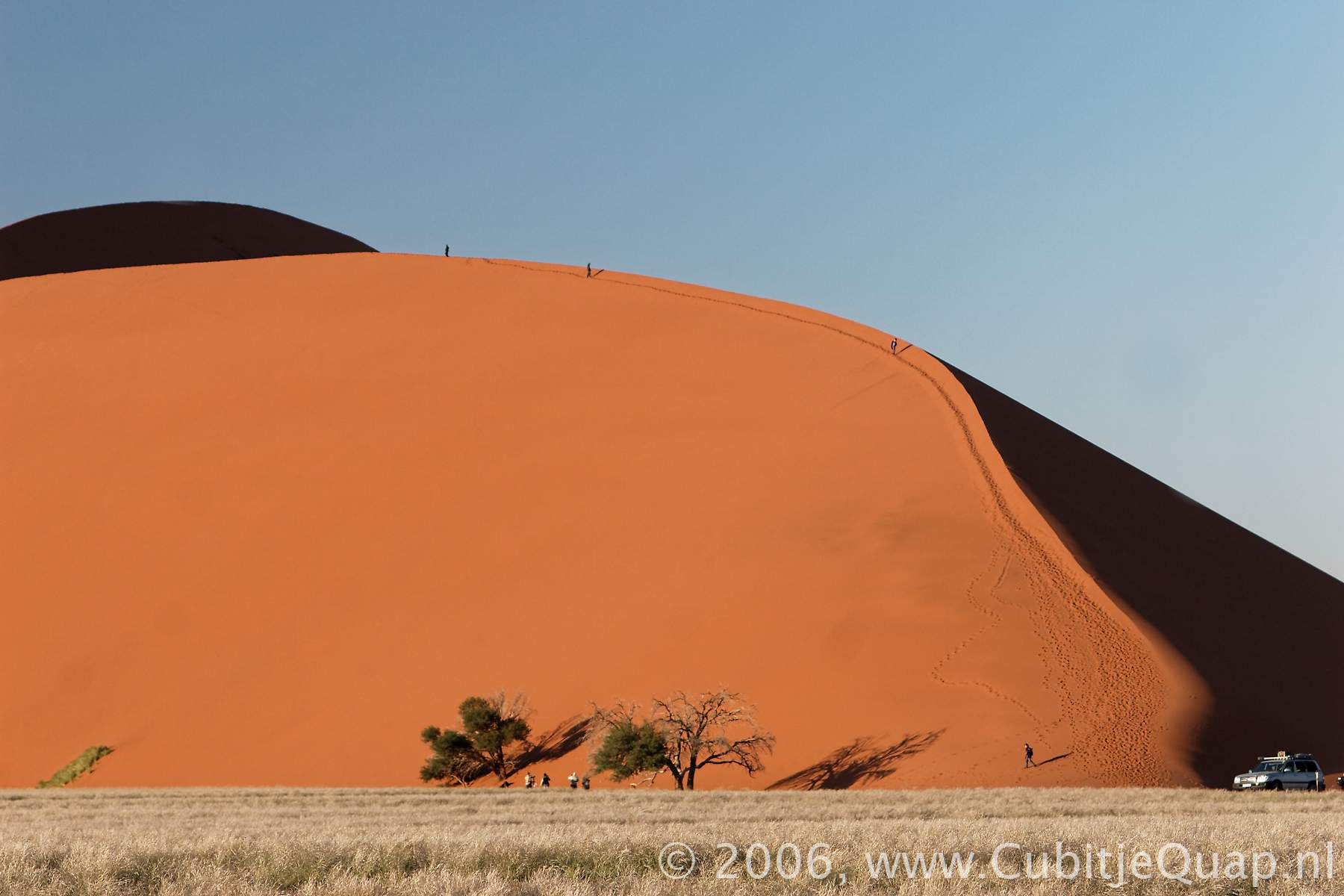 The tarred road from Sesriem to Sossusvlei ends at the 2WD parking area. From that point a sand track leads to the 4WD car park 5 km further. From there it is a short walk to dead vlei, named after the skeletal remains of the Camelthorn found in the pan.