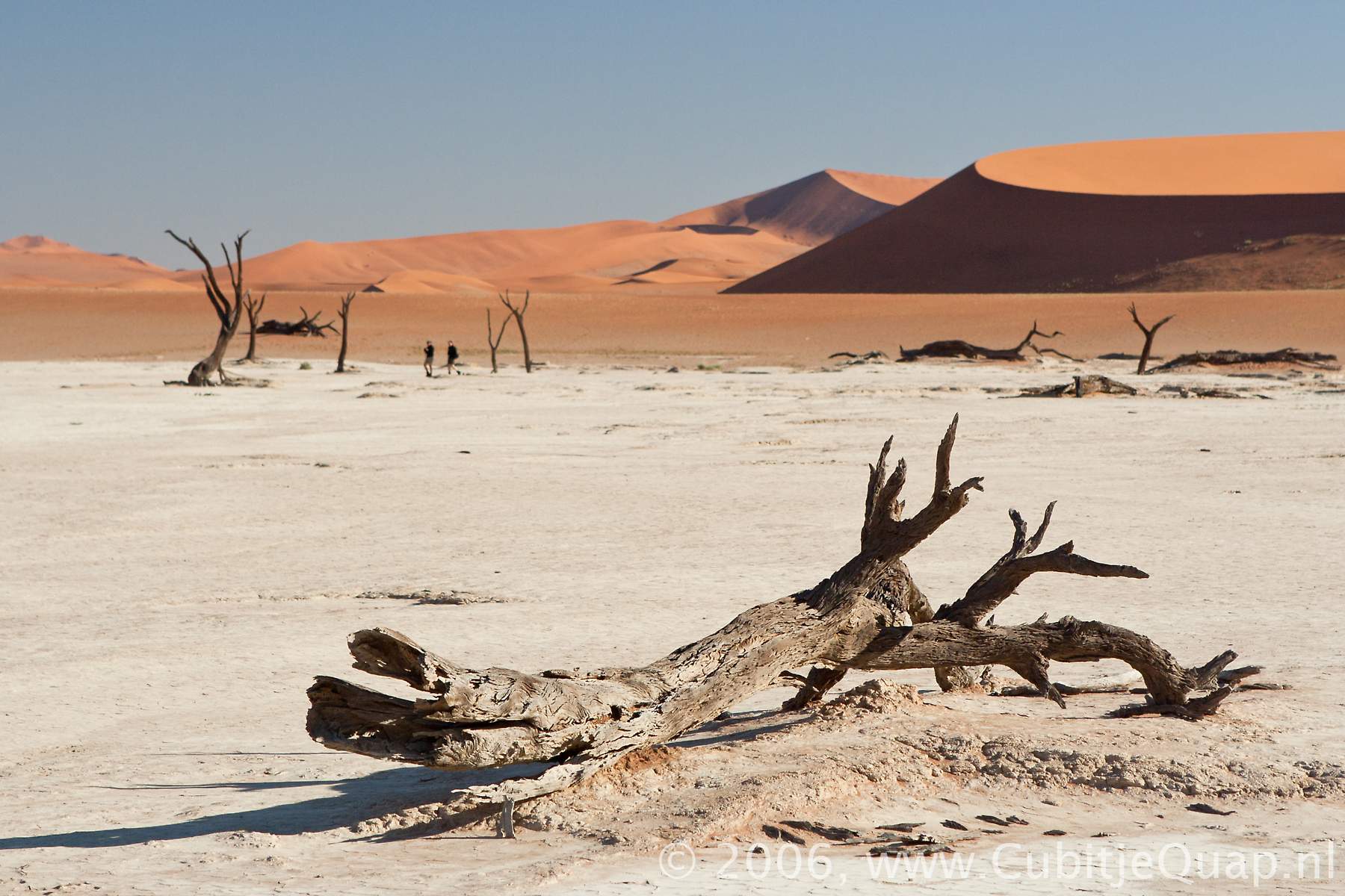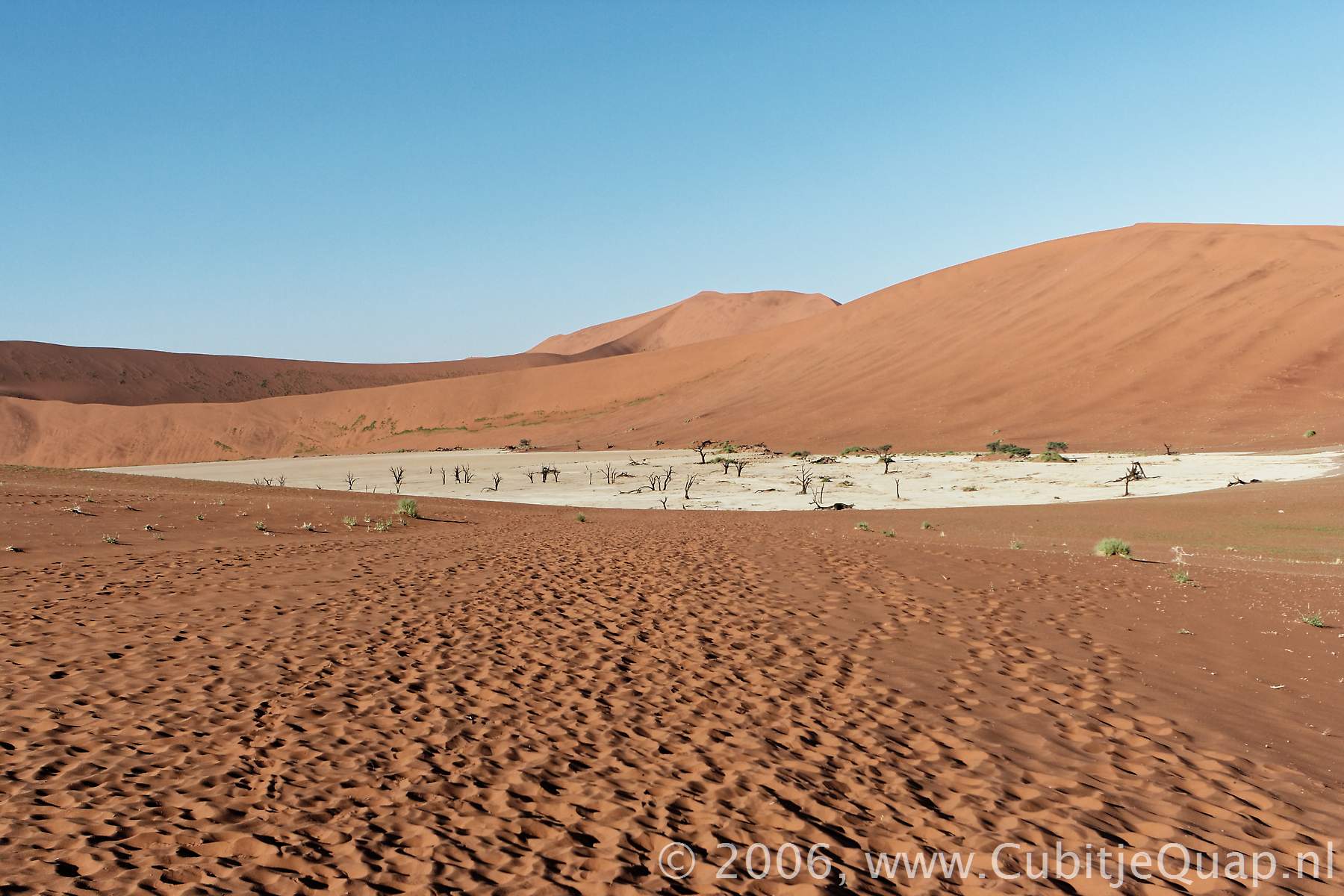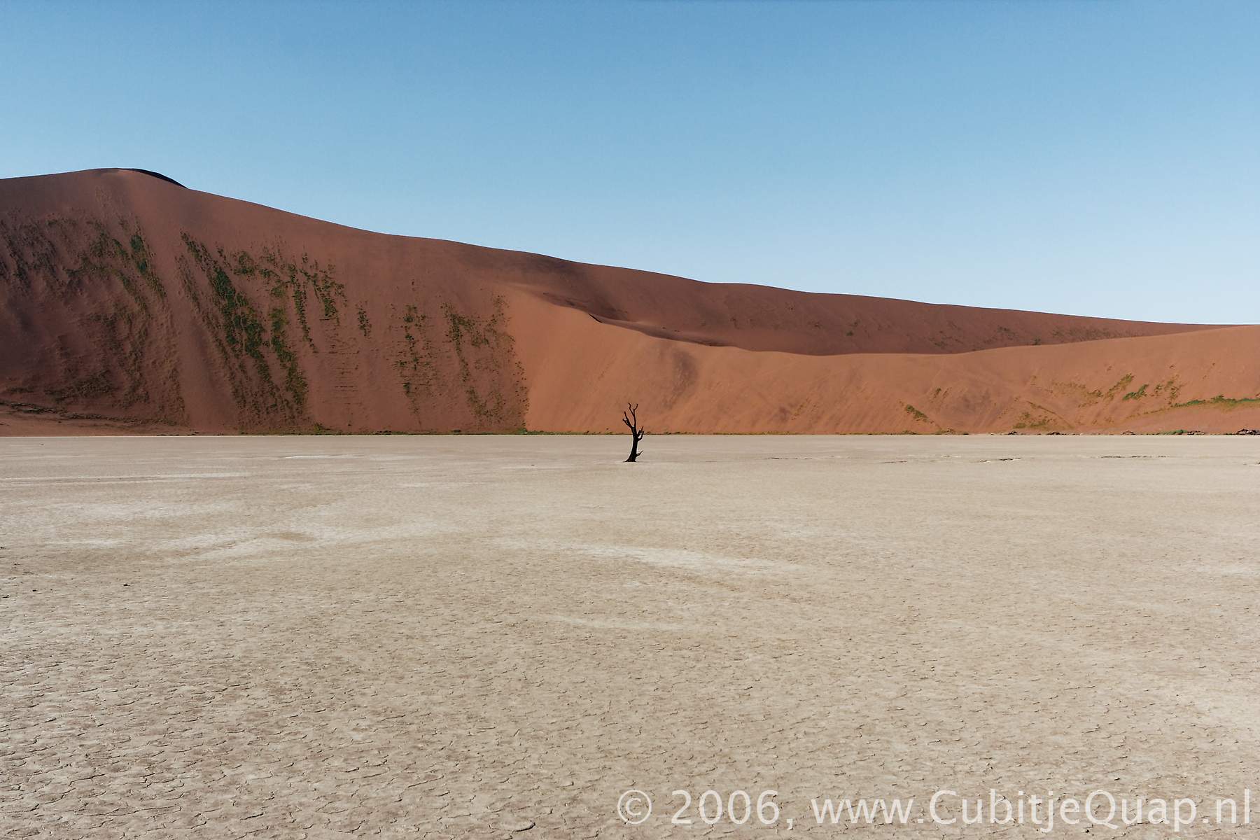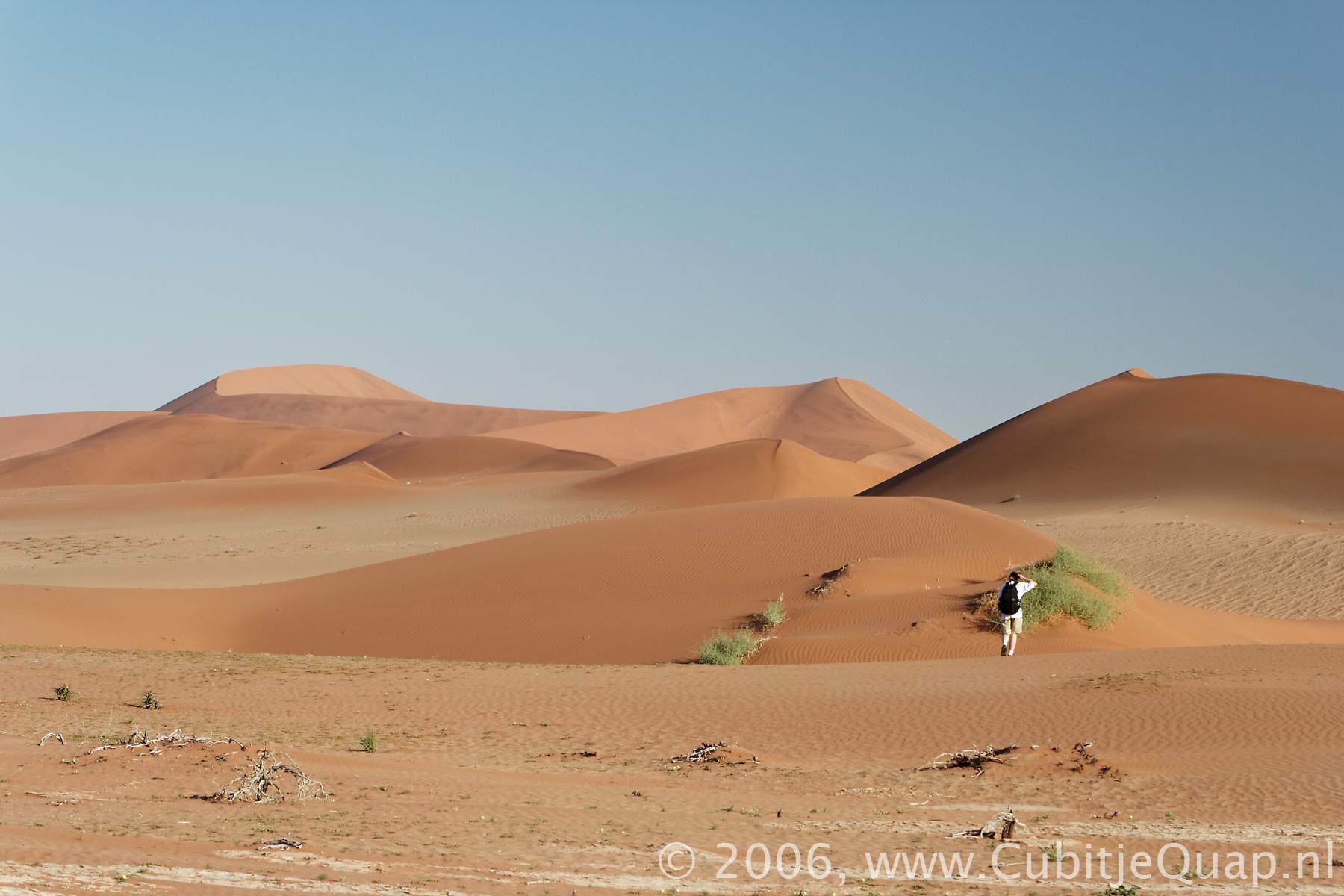The tarred road from Sesriem to Sossusvlei ends at the 2WD parking area. From that point a sand track leads to the 4WD car park 5 km further. From there it is a short walk to dead vlei, named after the skeletal remains of the Camelthorn found in the pan.