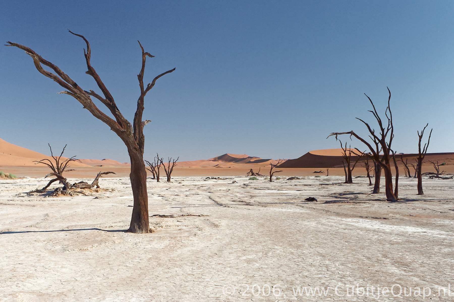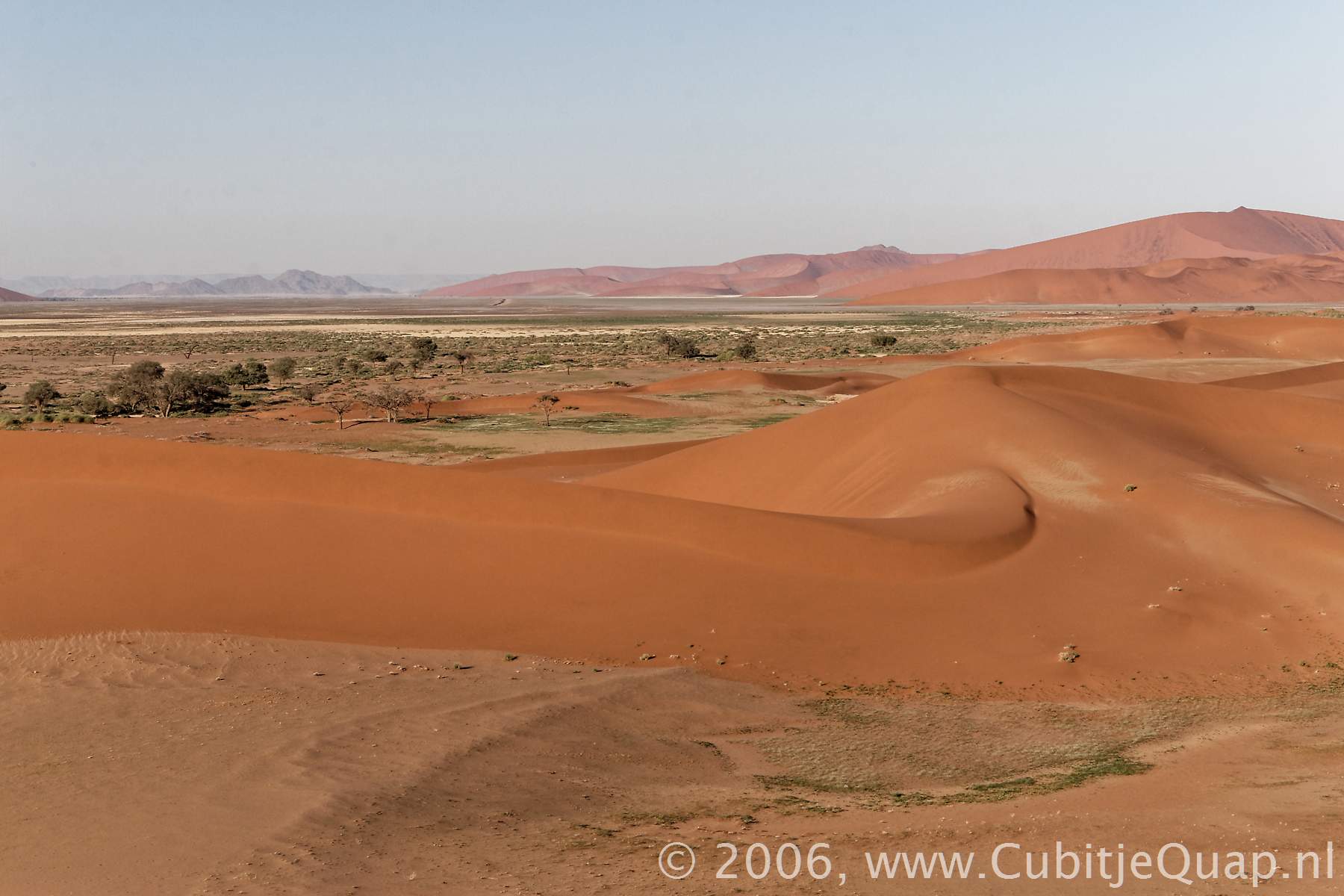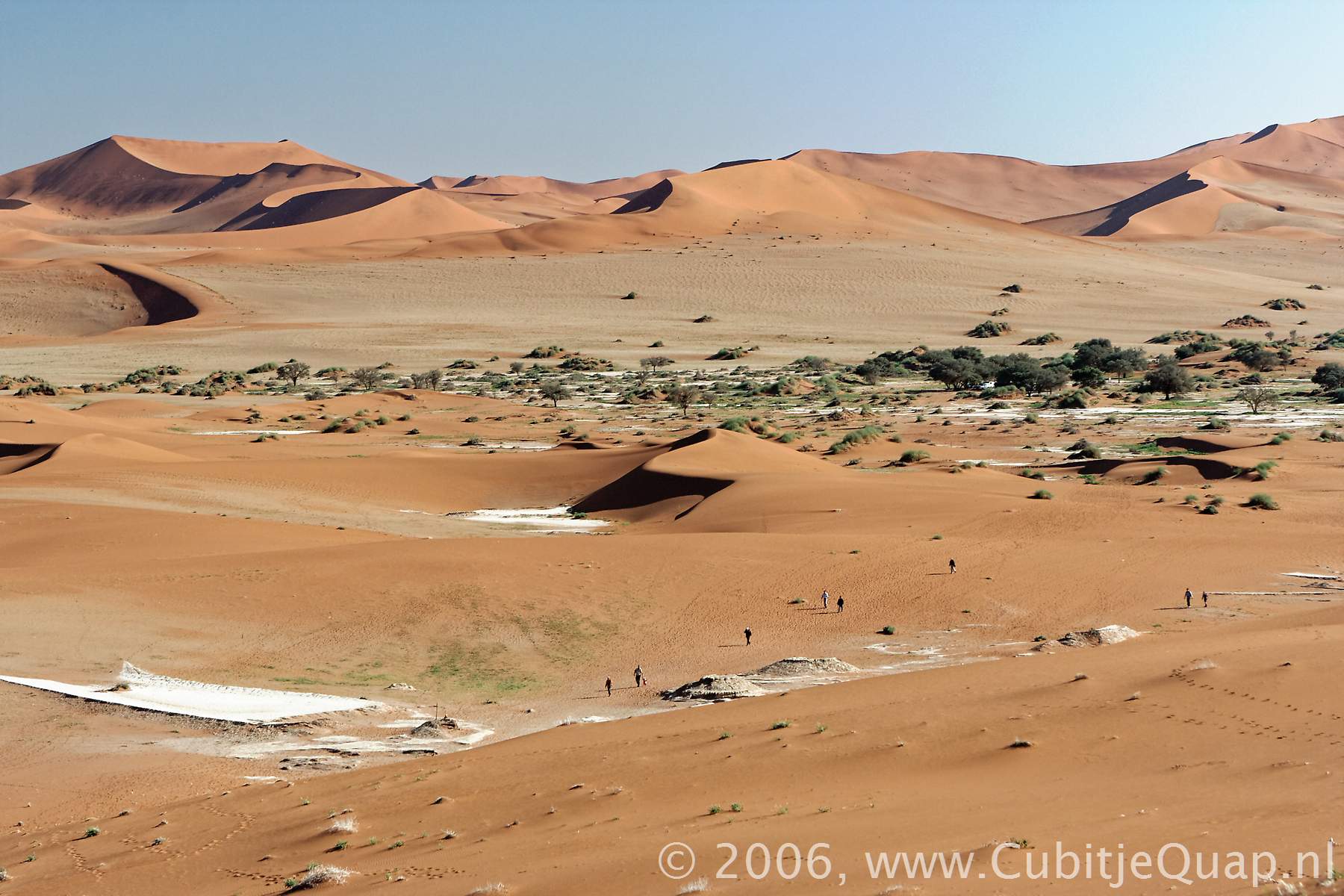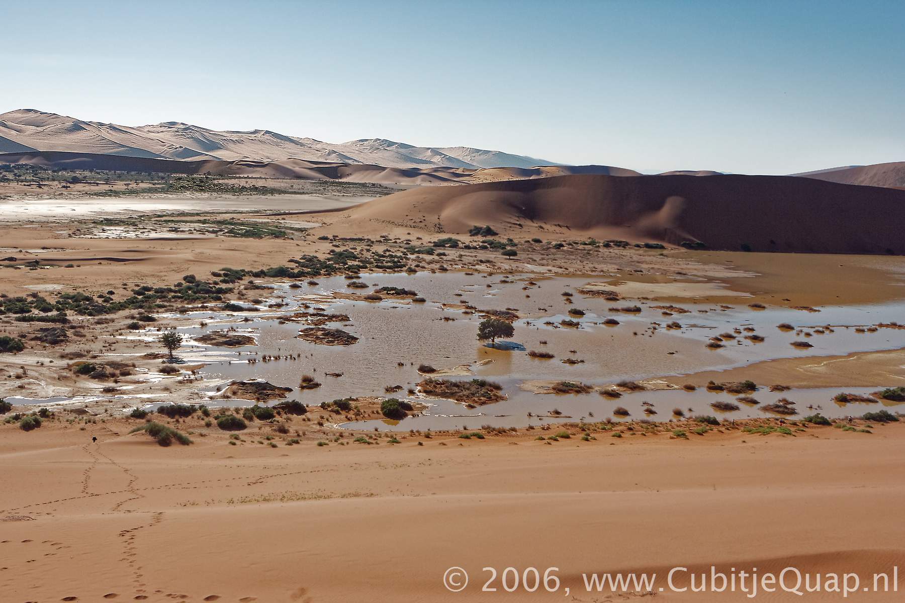 Sesriem and Sossusvlei lie on the Tsauchab River, one of two large rivers (the other being the Tsondab, further north) which flow westward into the great dune-field of the central Namib, but never reach the ocean. Both end by forming flat white pans dotted with green trees, surrounded by spectacular dunes – islands of life within a sea of sand.