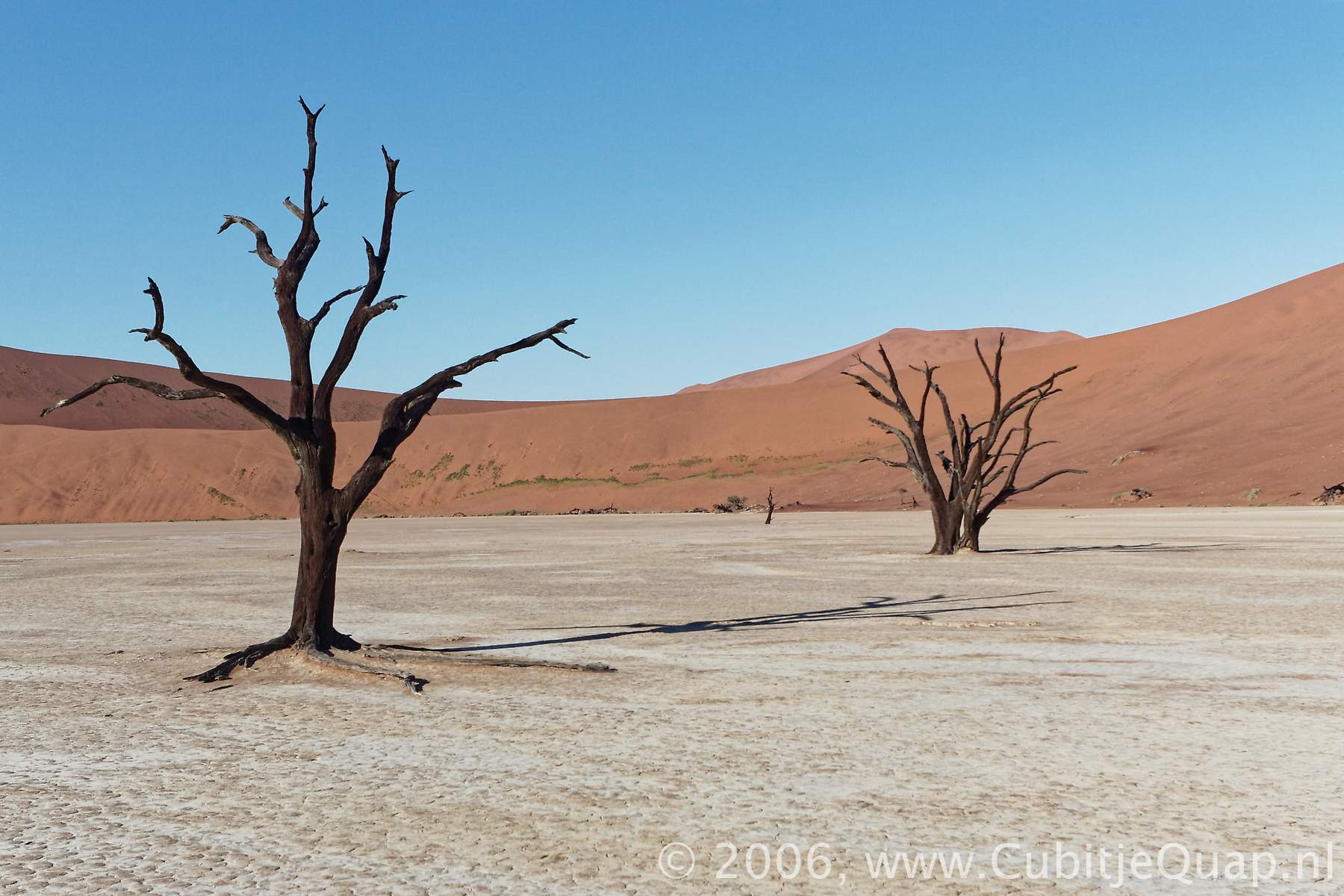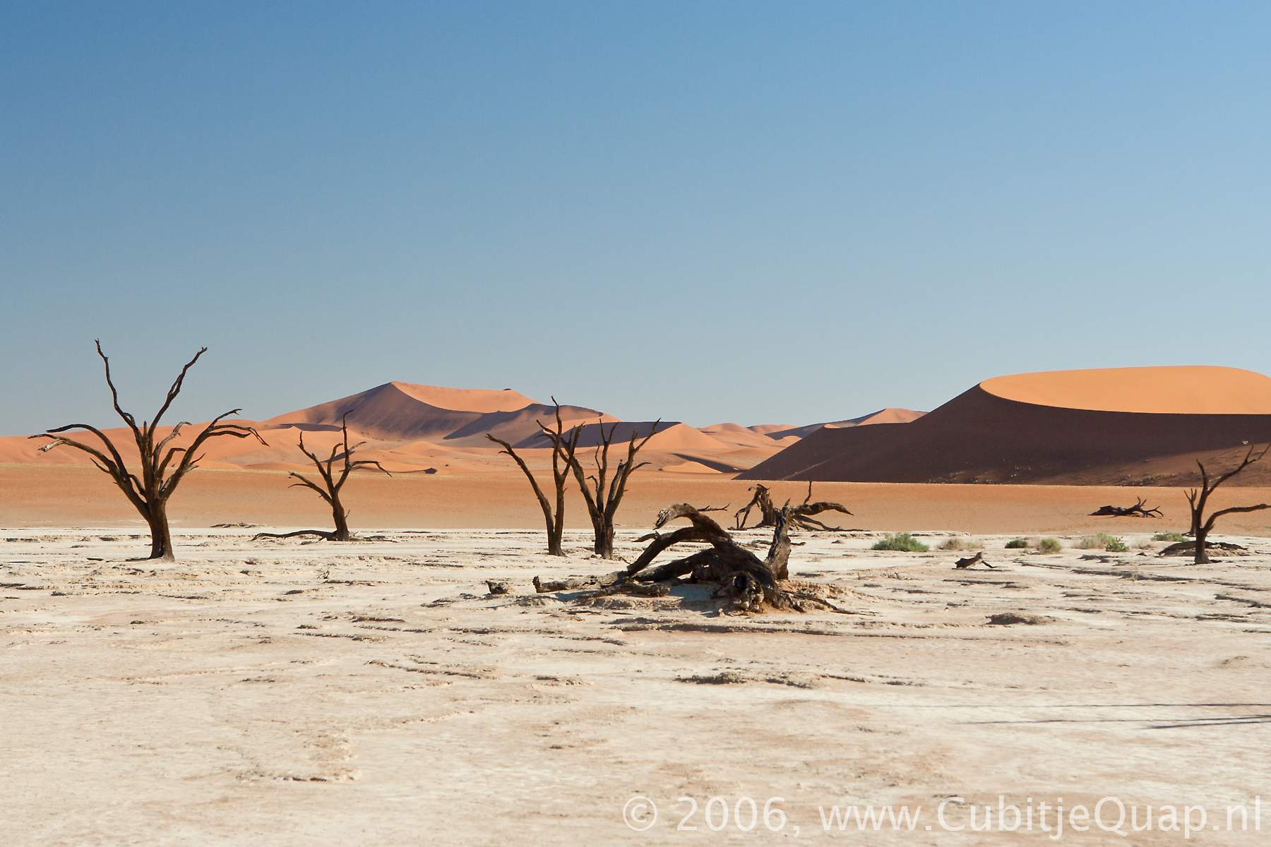 The clay pan of dead vlei was formed after rainfall, when the Tsauchab river flooded, creating temporary shallow pools where the abundance of water allowed camel thorn trees to grow. When the climate changed, drought hit the area, and sand dunes encroached on the pan, which blocked the river from the area. The trees died, as there no longer was enough water to survive.